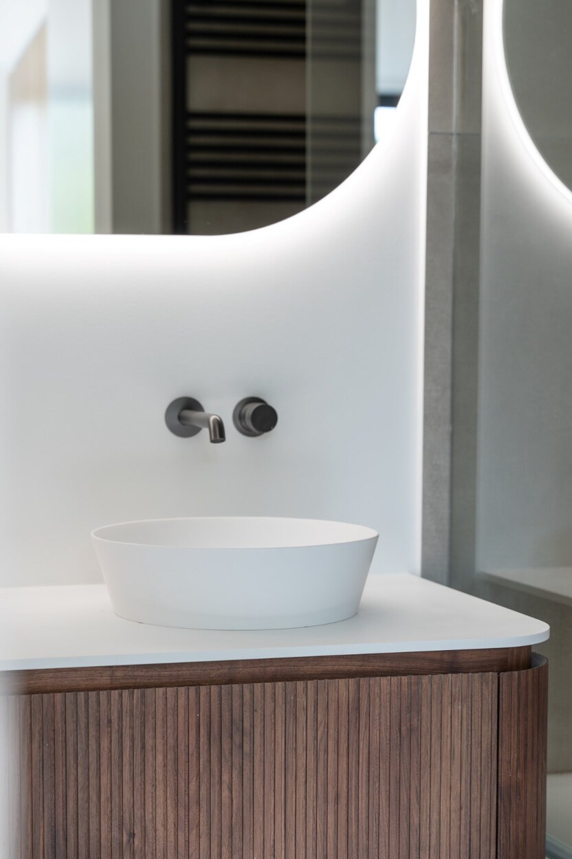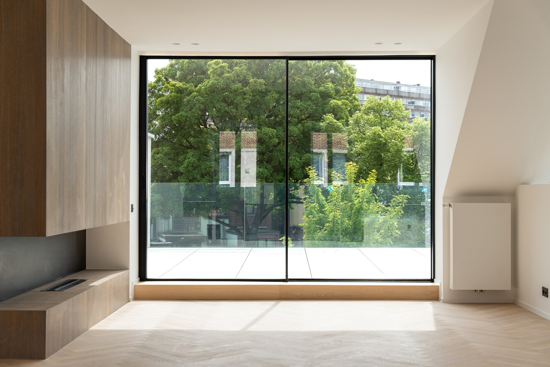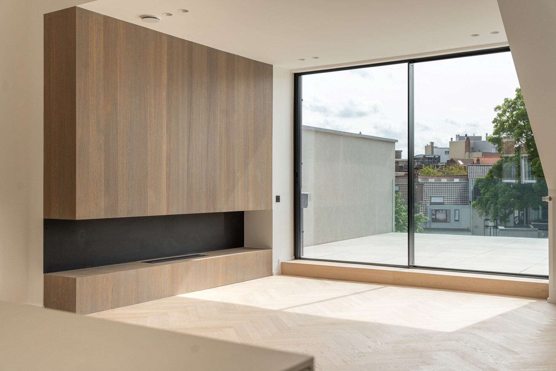 Het hoofdniveau onthult een royale leefruimte waar de Structure Plus keuken harmonieus integreert met de woonkamer en eetkamer. Het geheel wordt verlicht door elegante, volledig verstelbare railspots en opent via indrukwekkende raampartijen naar een privétuin van 2,5 are, ideaal gelegen op het zuidwesten. De woonkamer is voorzien van een bio-ethanol haard. Elk element is zorgvuldig doordacht, van de edele materialen tot de onberispelijke afwerking.