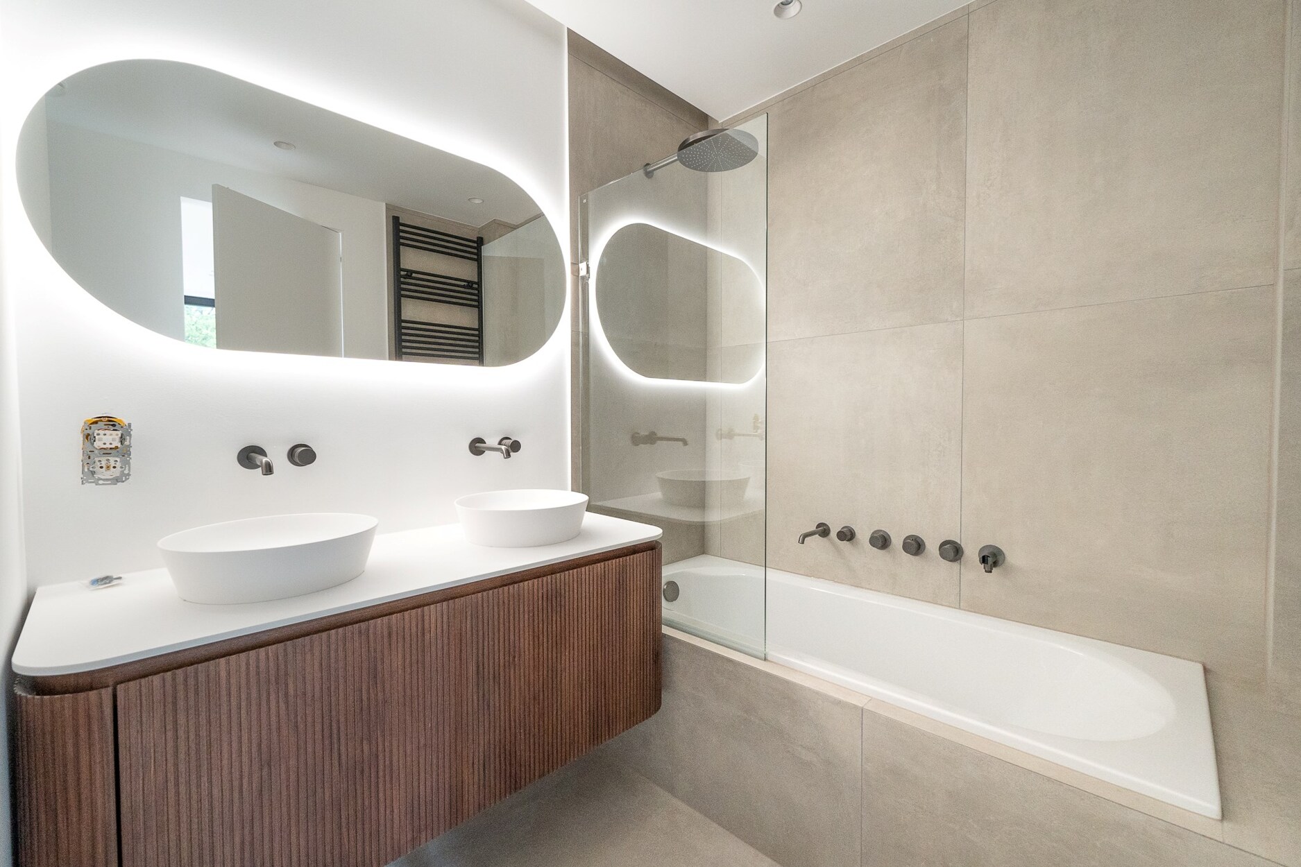 Op de onderverdieping leidt een gang naar twee ruime slaapkamers en twee complete badkamers. Maatwerk eikenhouten schrijnwerk verfraait de slaapkamers en de vestiaireruimte. De badkamers hebben toegang tot hun eigen Engelse koer, wat een subtiele verbinding met buiten creëert en uitstekende lichtinval garandeert.