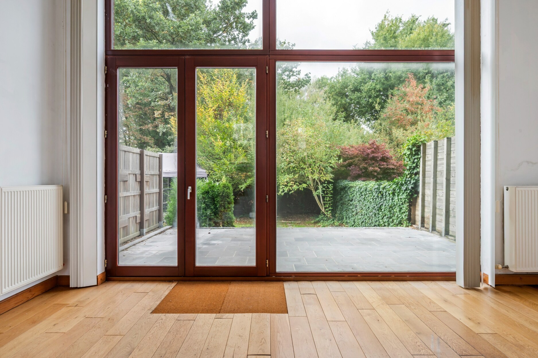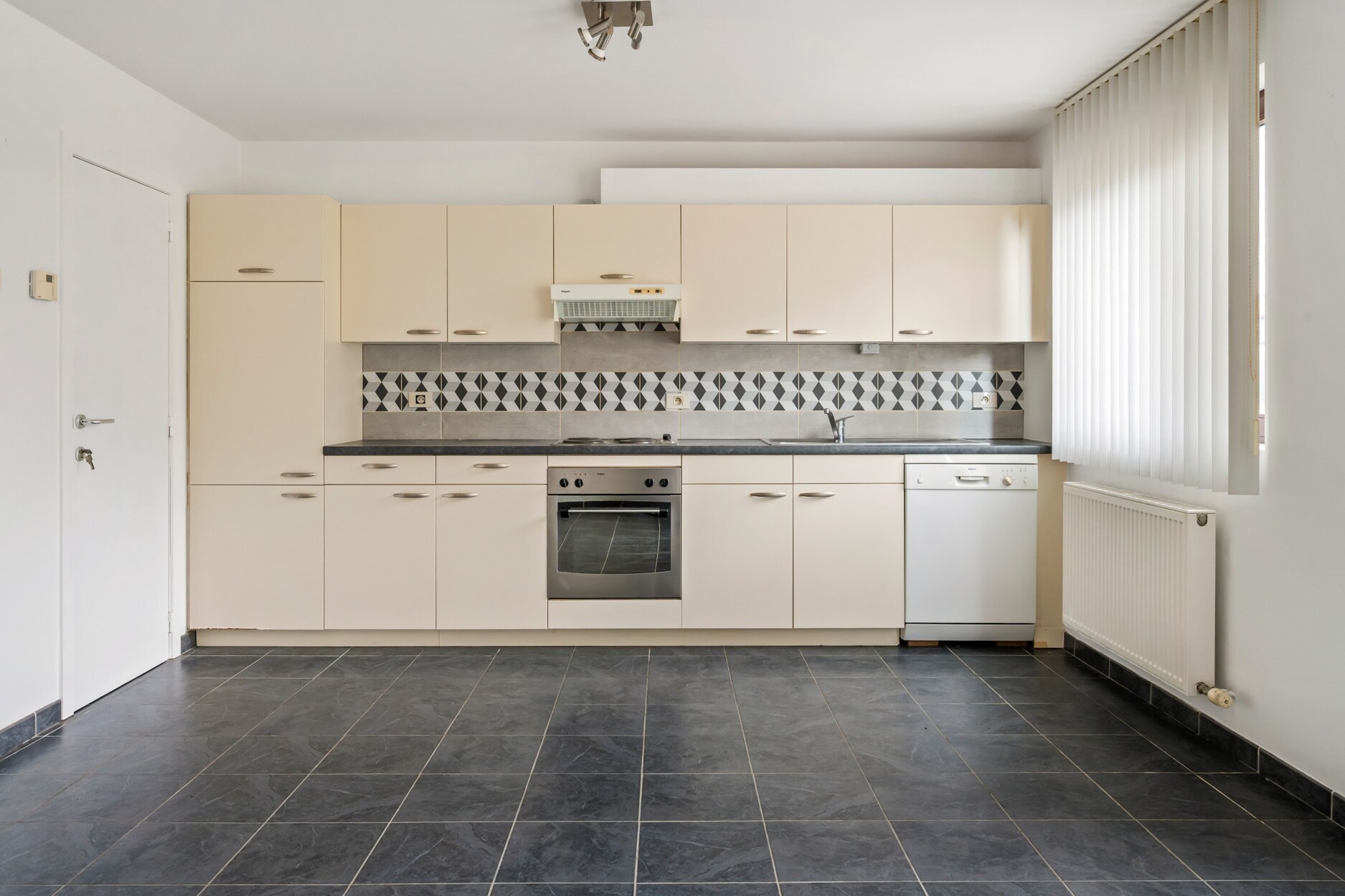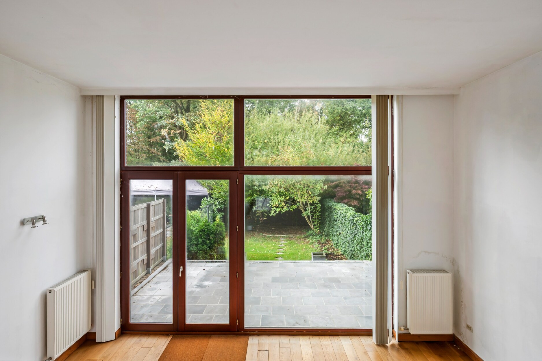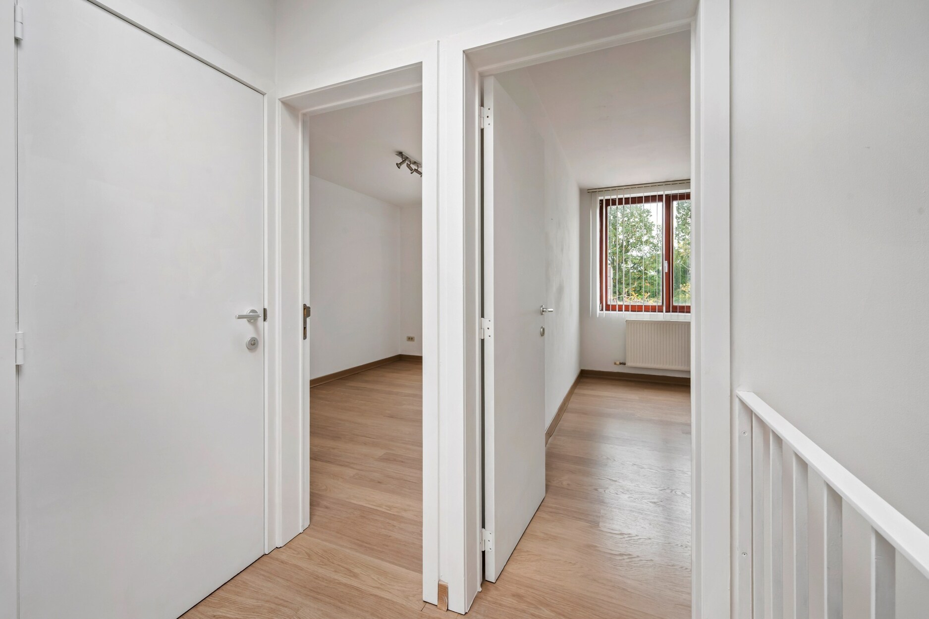 Vervolgens, lichtrijke leefruimte dankzij de hoge raampartijen en schuifdeur, met zich op de west-georiënteerde tuin. Op het split-level gedeelte bevindt zich de open keuken, met eethoek en aparte berging, aansluiting voor wasmachine en droogkast is hier voorzien.