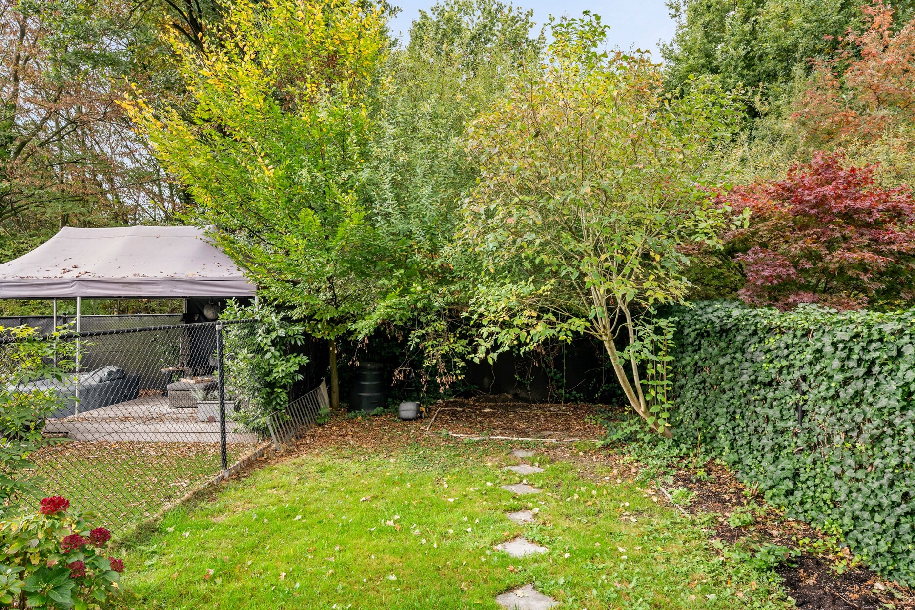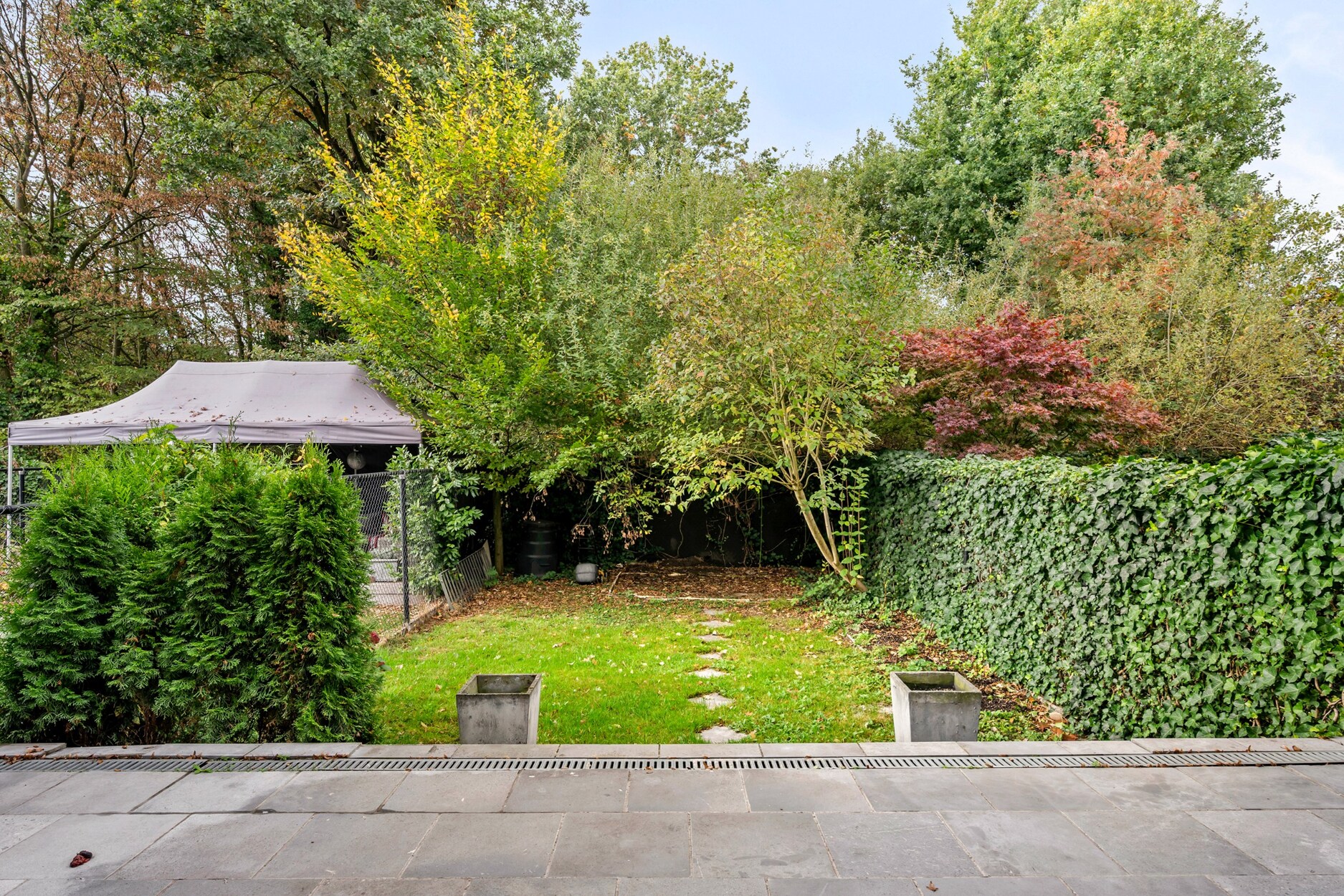 De zonnige tuin, met westgerichte oriëntatie is een waar verlengstuk van de leefruimte en werd voorzien van een terras in blauwe steen, ideaal voor gezellige diners met vrienden en familie, terwijl de kinderen zorgeloos kunnen spelen in de tuin met bos als natuurlijke achtergrond.