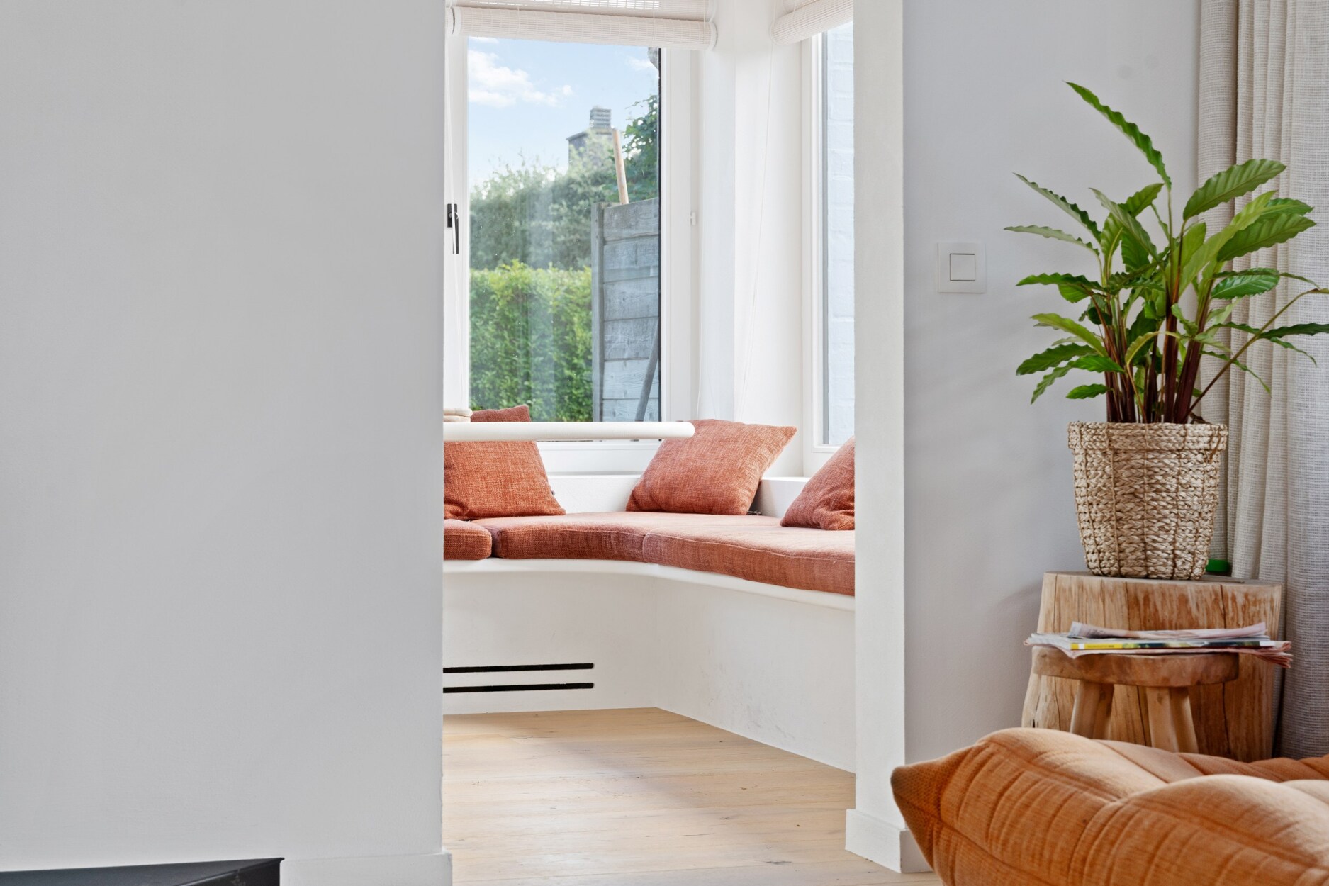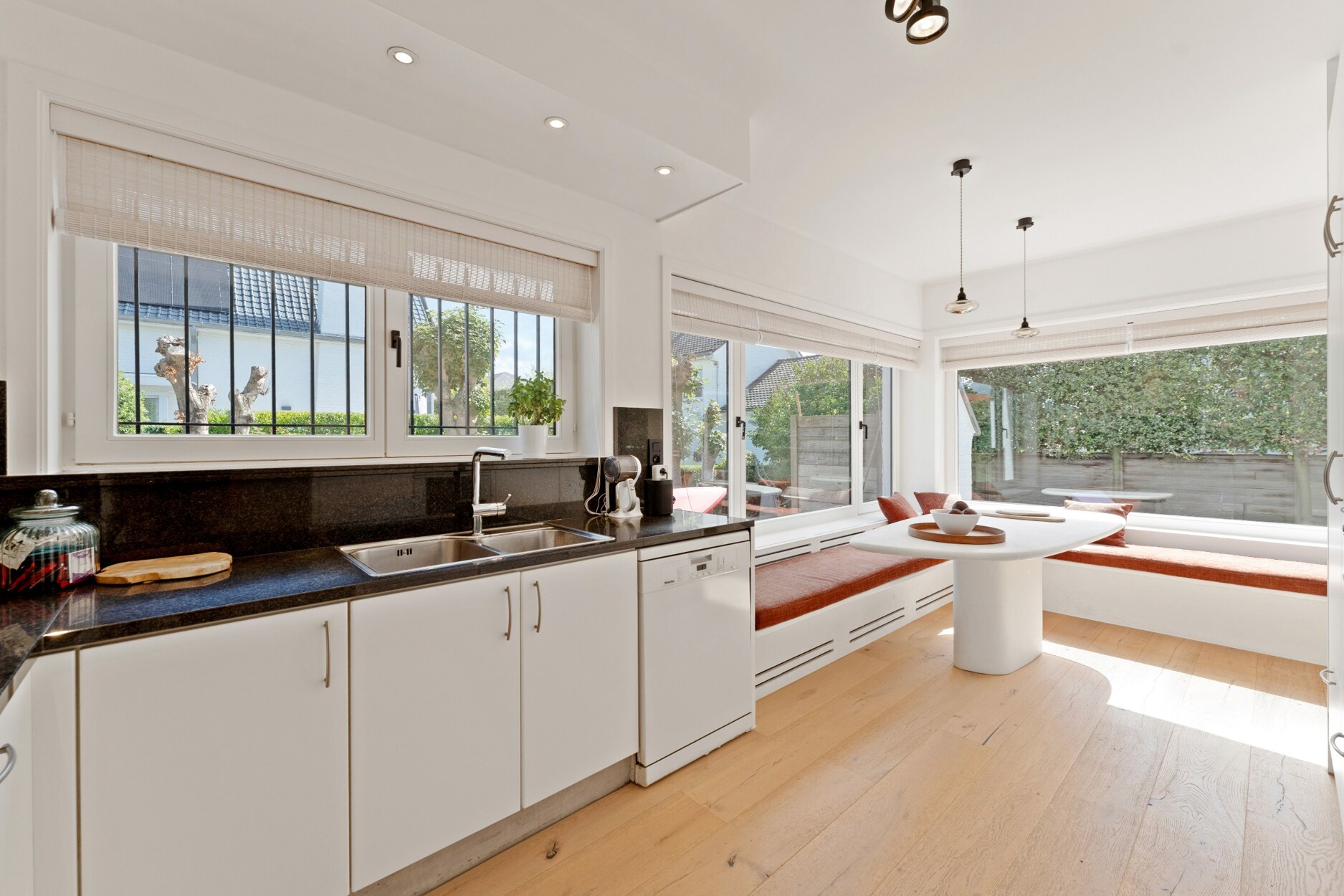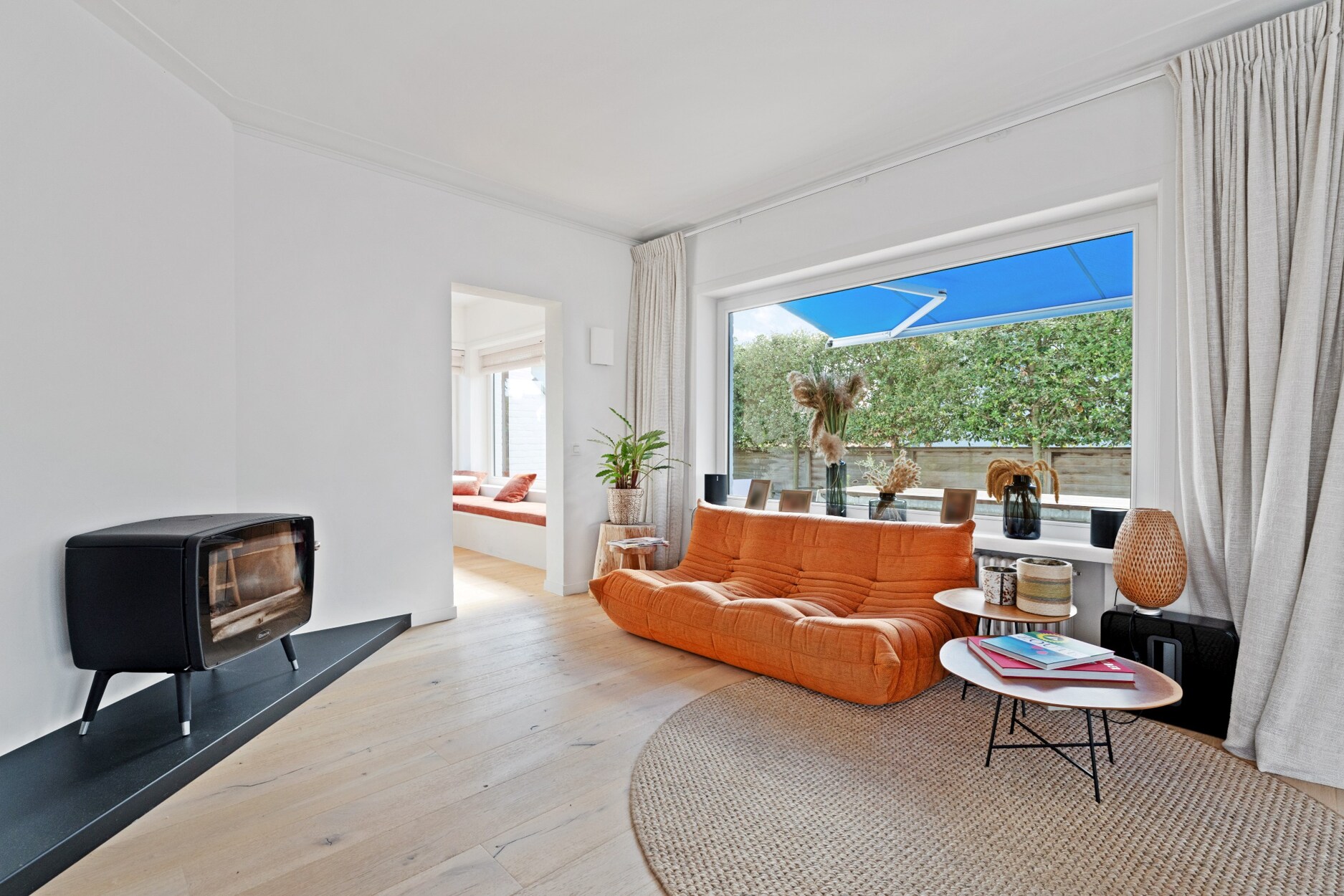 Bij het betreden van de woning komt u binnen via een charmante inkomhal met gastentoilet. De ruime woonkamer baadt in natuurlijk licht en biedt een gezellige zit- en eetruimte met directe toegang tot de zonnige, perfect onderhouden tuin en het uitnodigende terras. De aparte keuken is volledig ingericht en beschikt over een praktische eethoek, ideaal voor dagelijks gebruik.