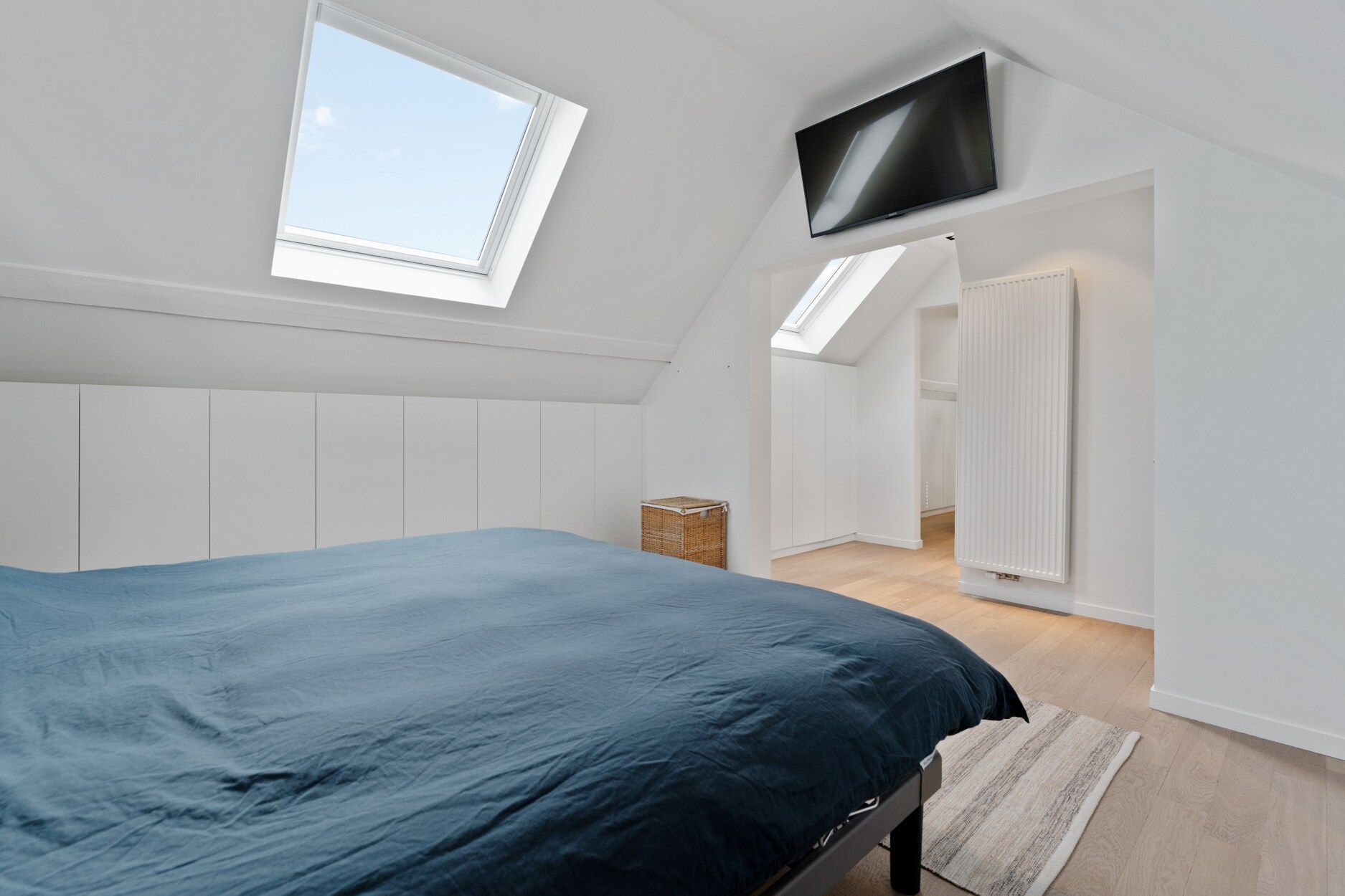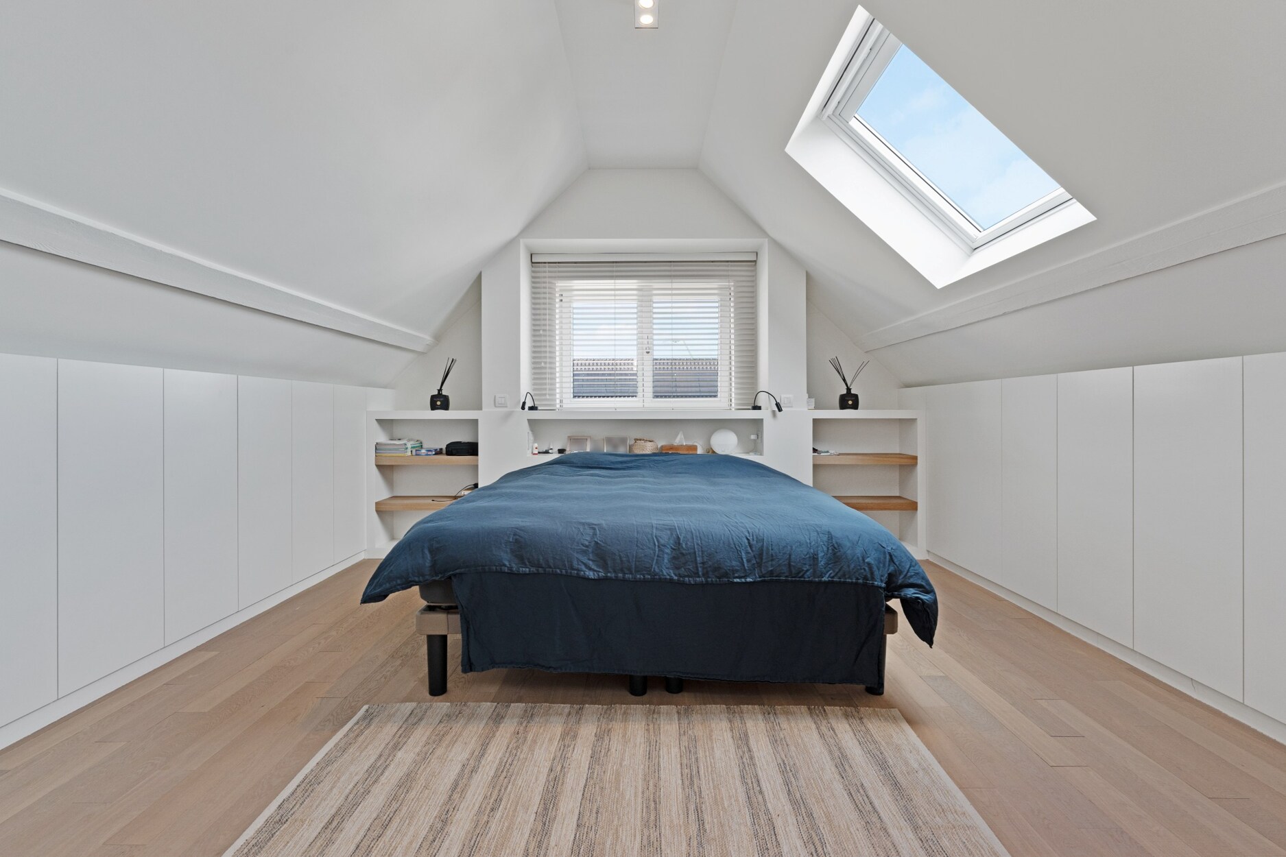 De tweede verdieping is volledig ingericht als luxueuze master bedroom met ingemaakte kasten en een ensuite badkamer, uitgerust met ligbad, inloopdouche, dubbele wastafel en toilet. Dit verdiep vormt een comfortabele en stijlvolle privéruimte.