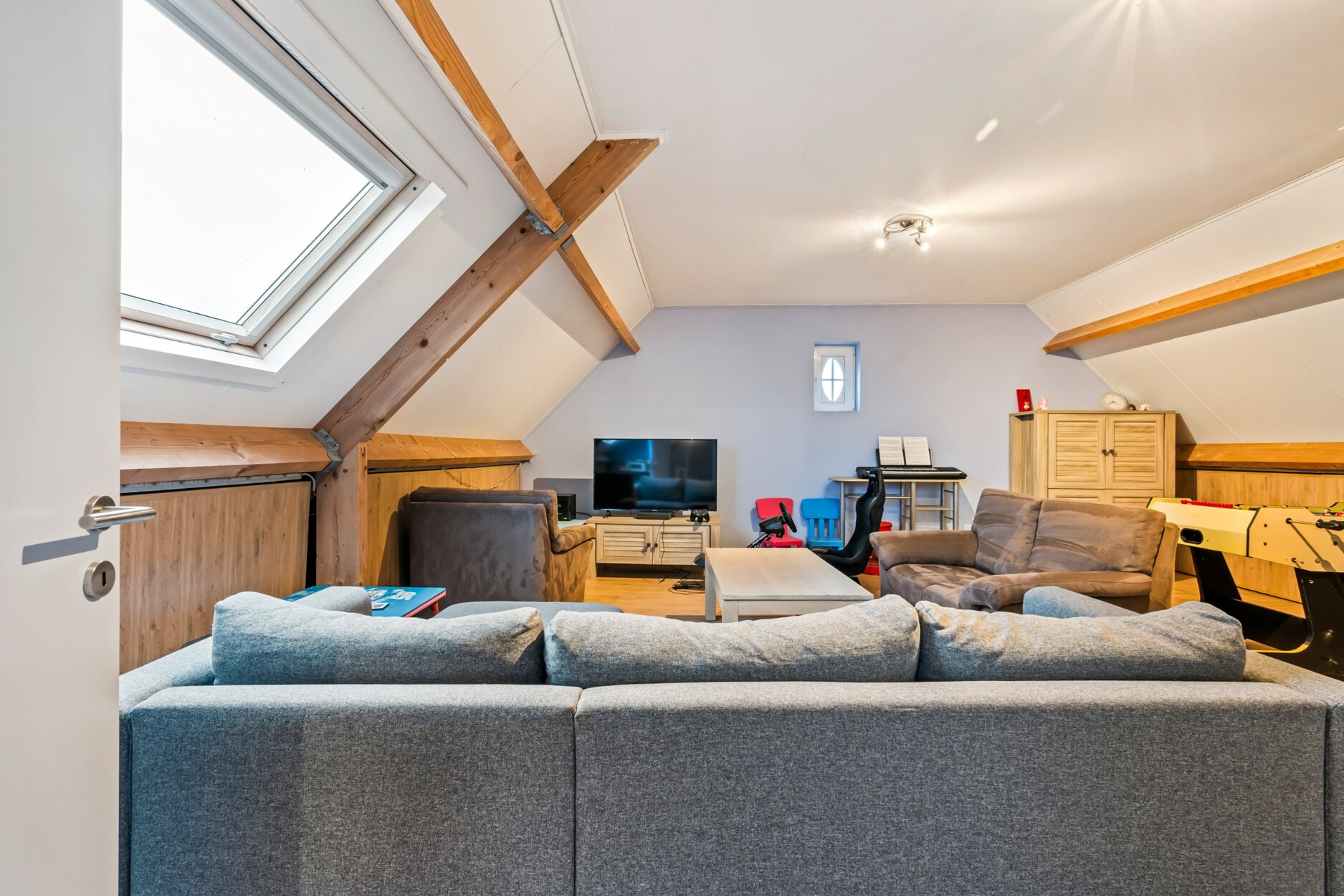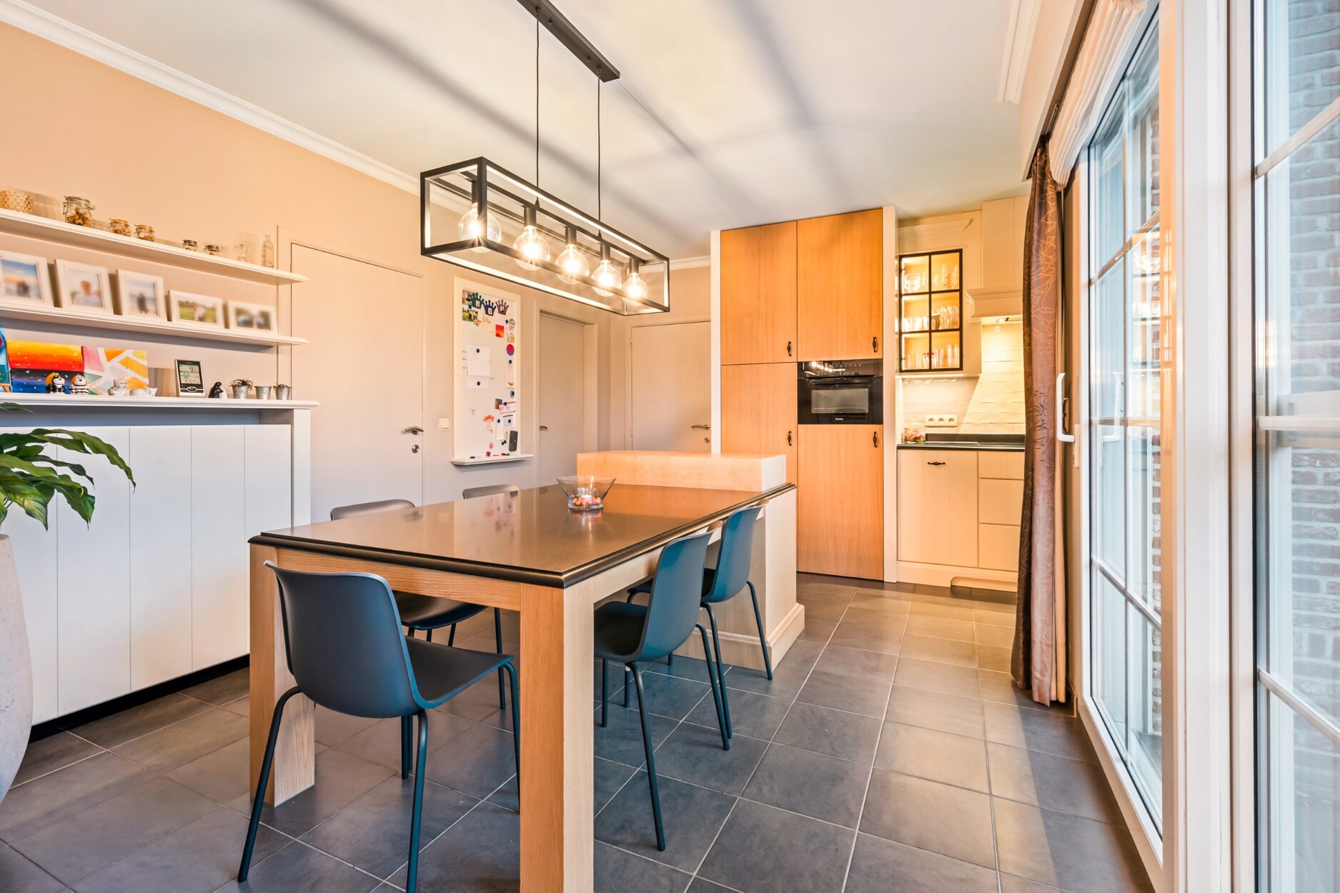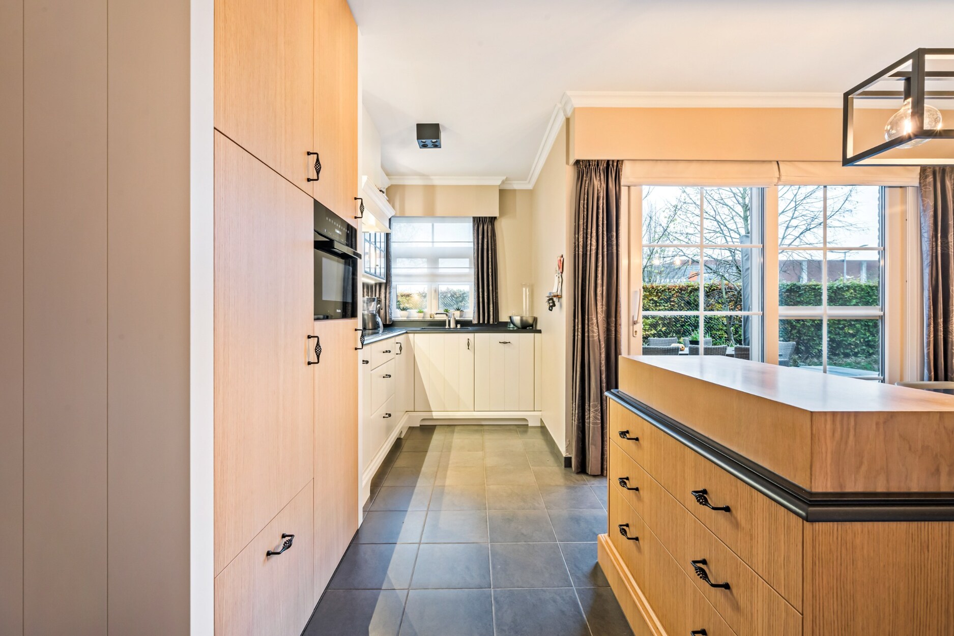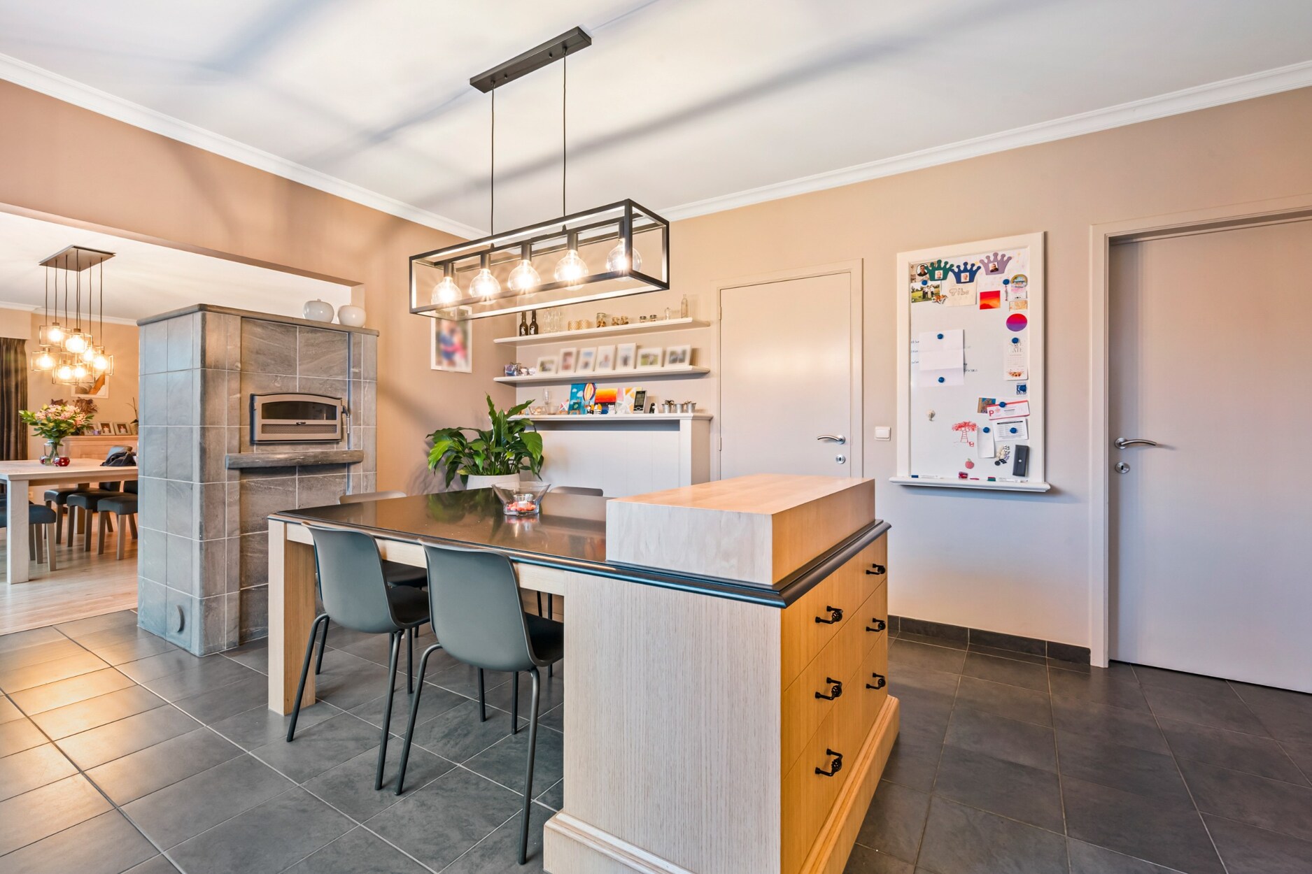U betreedt de inkomhal van de woning via de zijkant van het gebouw. In de inkomhal hebt u een gastentoilet. De woonkamer is aan de achterzijde gesitueerd en omvat een ruime zit- en eethoek op parket. De keuken bevindt zich aanpalend en is gescheiden via een speksteenkachel met ingebouwde pizza-oven. Vanuit de leefkeuken kunt u via grote schuifpuien naar het terras aan de zij-kant (zuid-westen). Aan het keukeneiland met vaste eettafel kunt u heerlijk tafelen. De keuken is uitgerust met modern apparatuur en natuurstenen werkblad. Handige wasplaats/berging met inbouwkasten bevindt zich aanpalend, alsook hebt u vanuit de keuken toegang tot de kelderruimte.