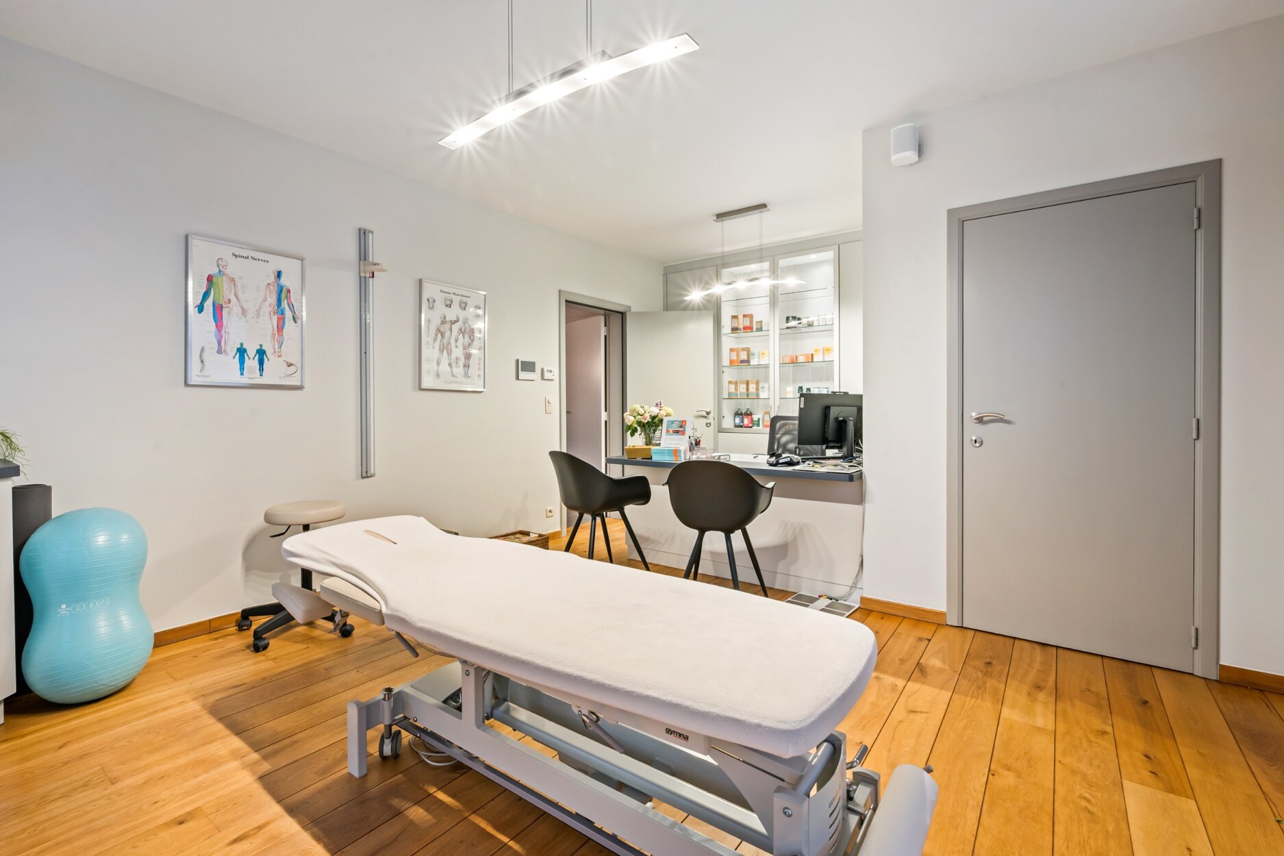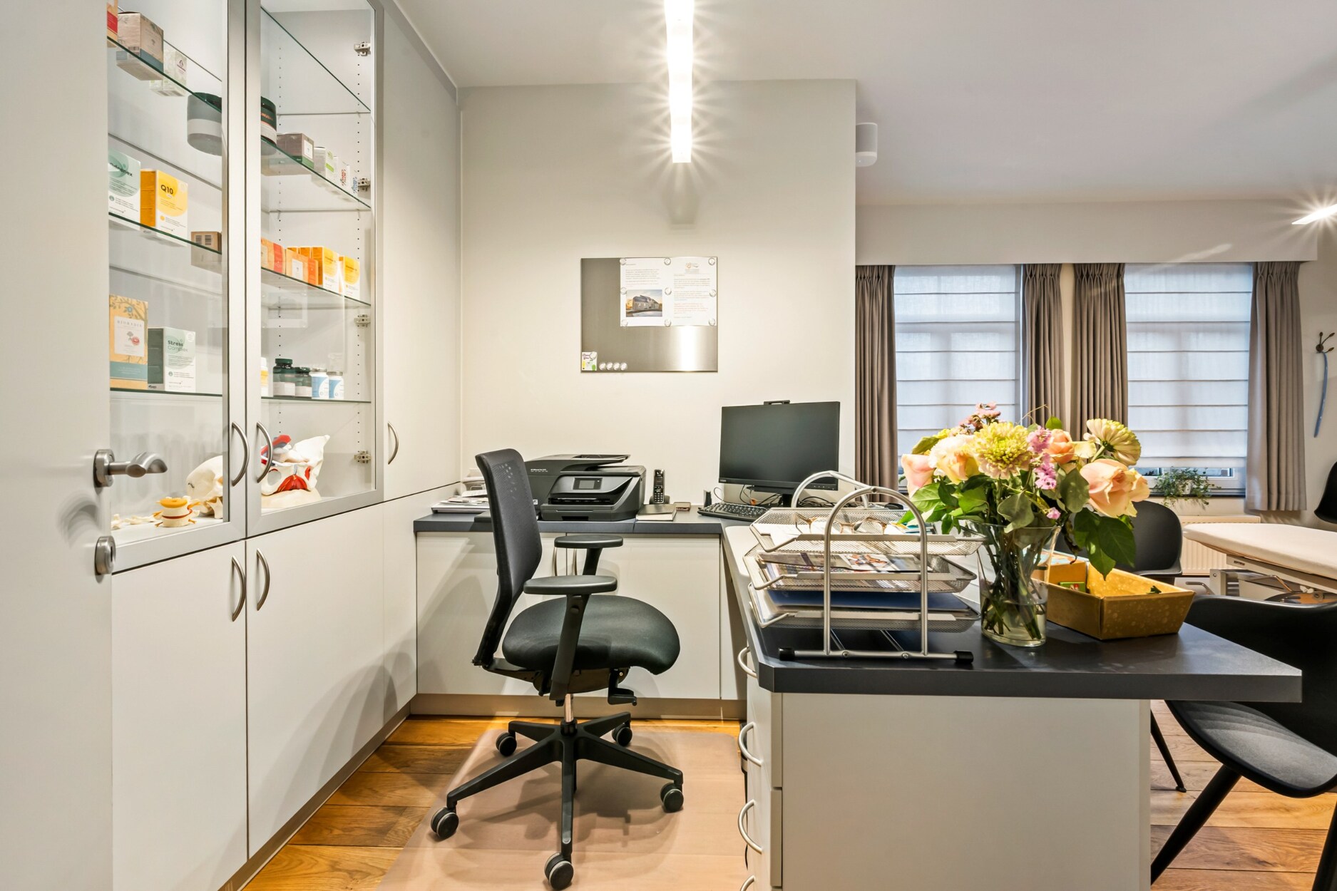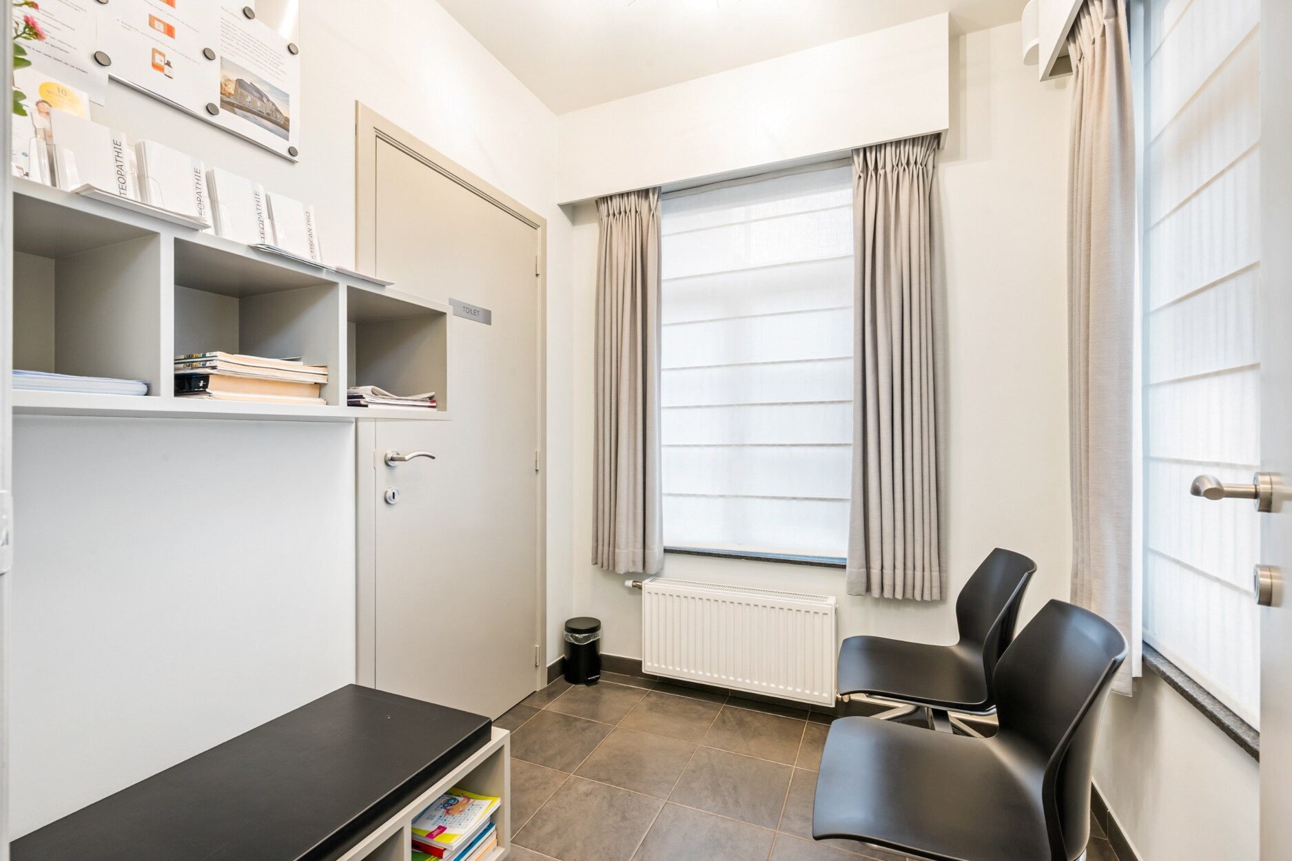 De praktijkruimte is toegankelijk via afzonderlijke inkomhal aan de voorkant van het gebouw. Rechts hebt u een kleine wachtkamer met toilet. Rechts een mooie praktijkruimte met vast bureau en inbouwkasten. De praktijkruimte is eveneens toegankelijk vanuit de privé.