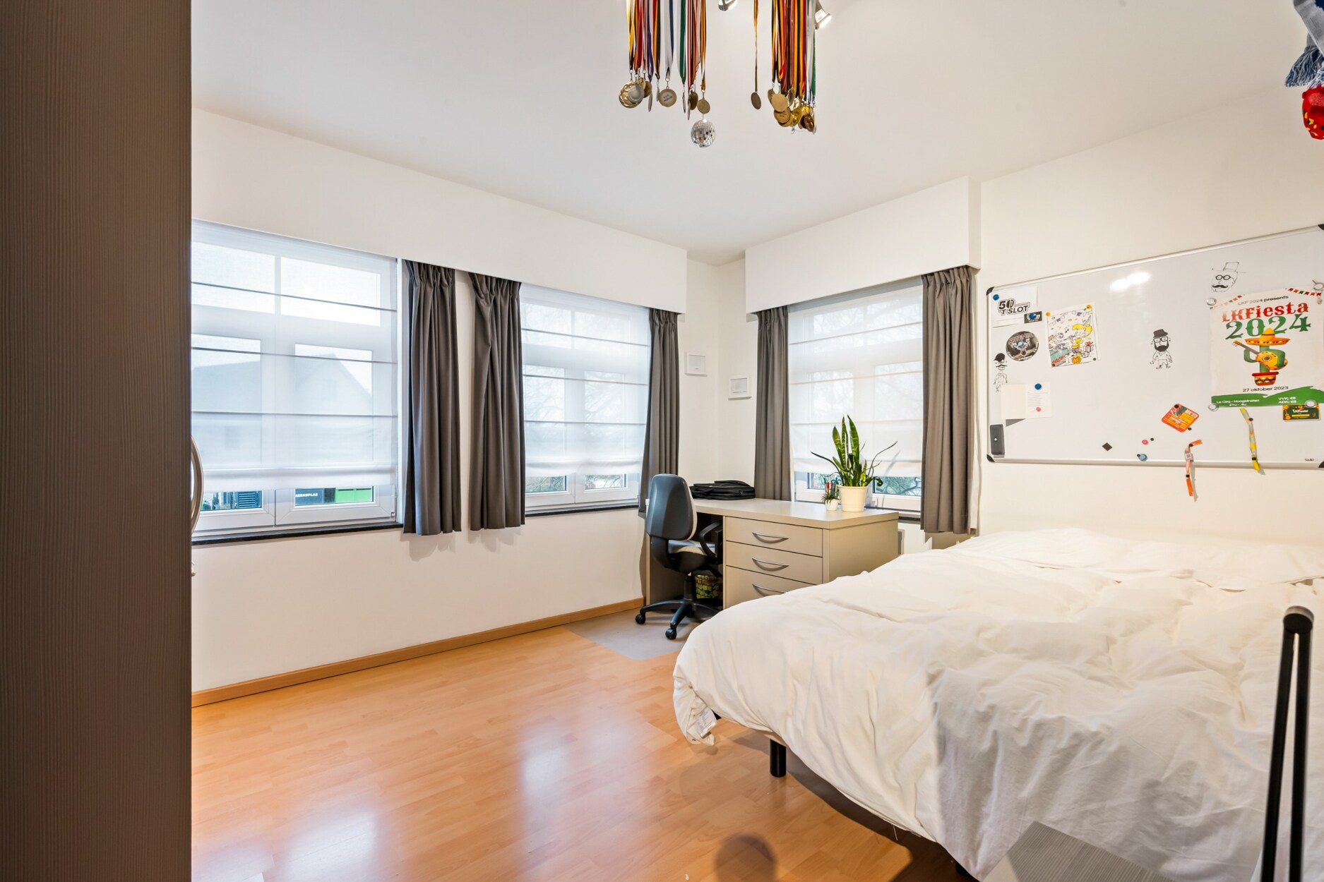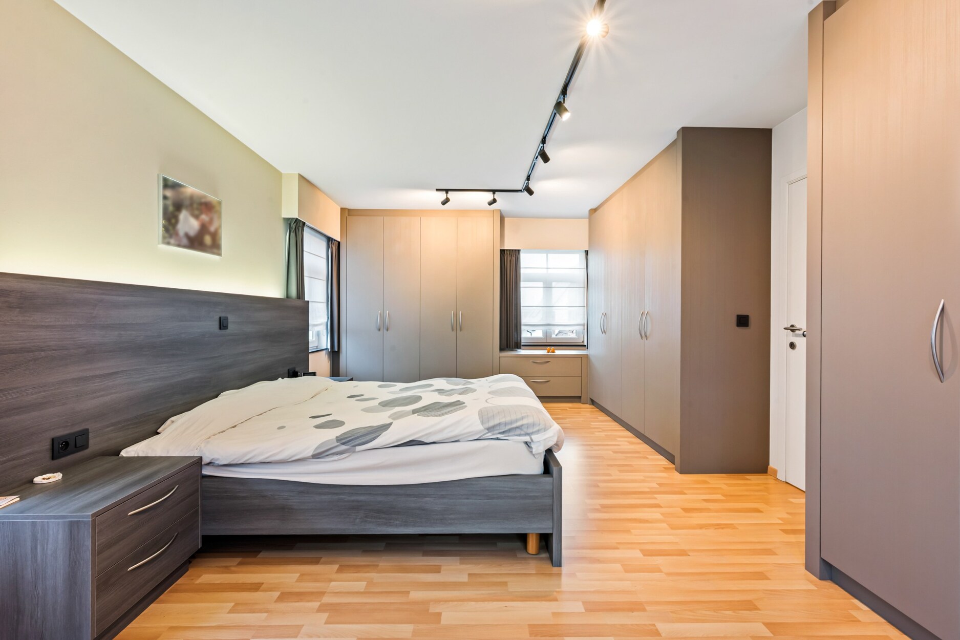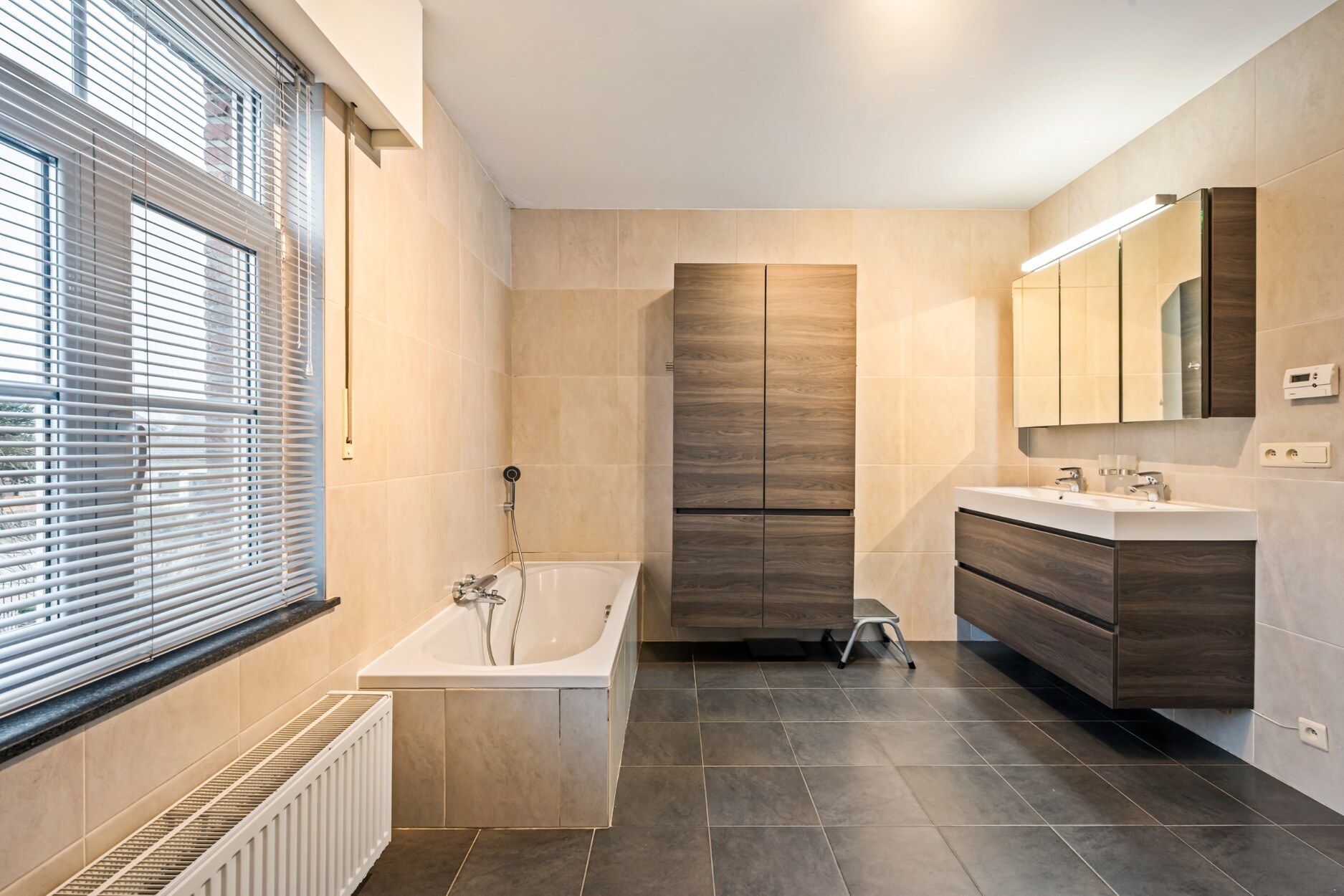 Vaste trap vanuit de keuken naar de bovenverdieping op laminaat. Hier treft u de masterbedroom aan de achterzijde, dewelke is voorzien van vele inbouwkasten. Verder nog 4 slaapkamers, allen voorzien van inbouwkasten/vast meubilair. De badkamer is ruim en praktisch voor een groot gezin en omvat een douche, ligbad, dubbele lavabo in meubel en een toilet.