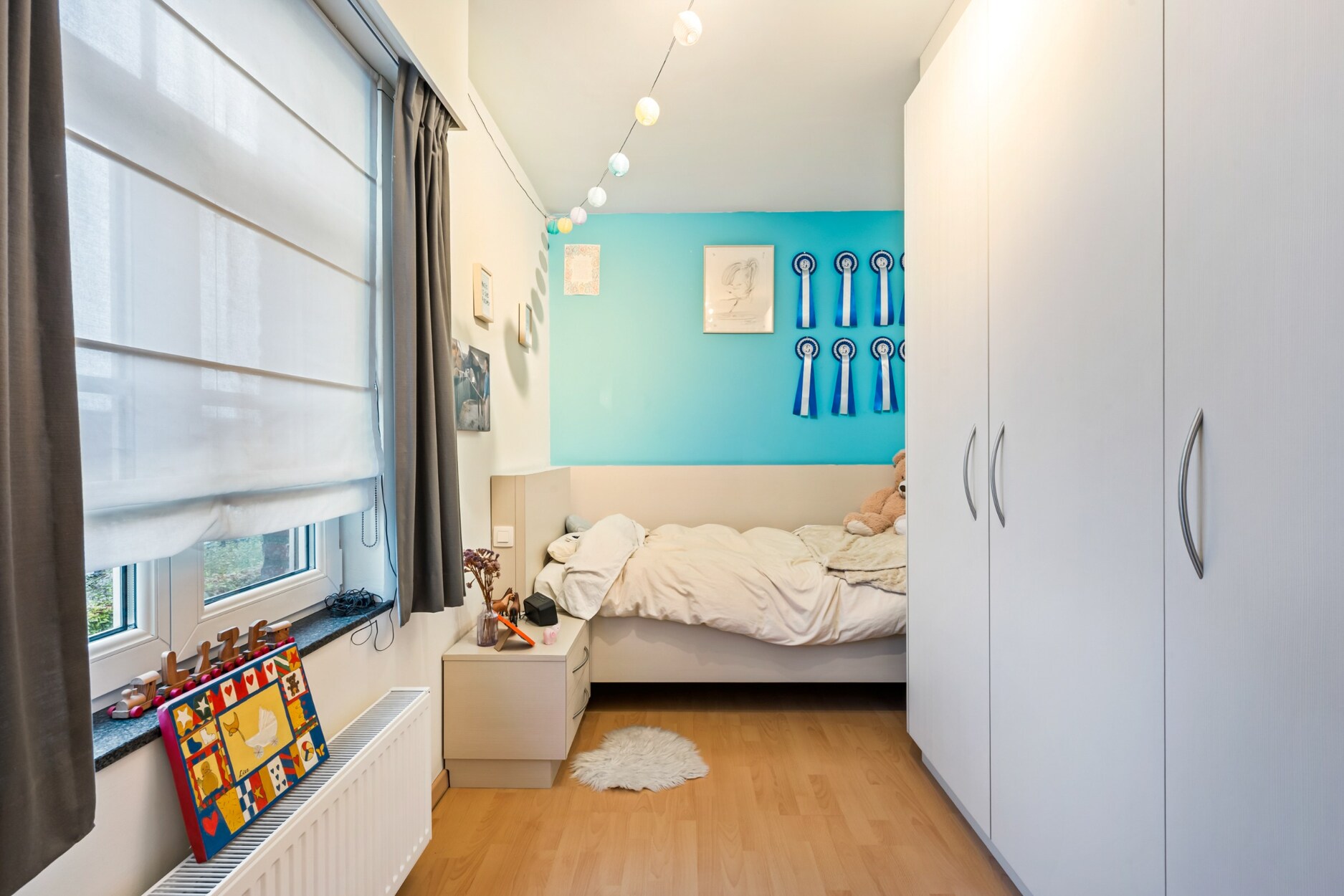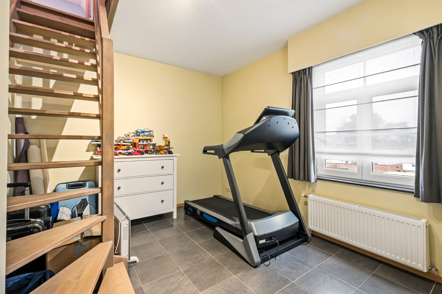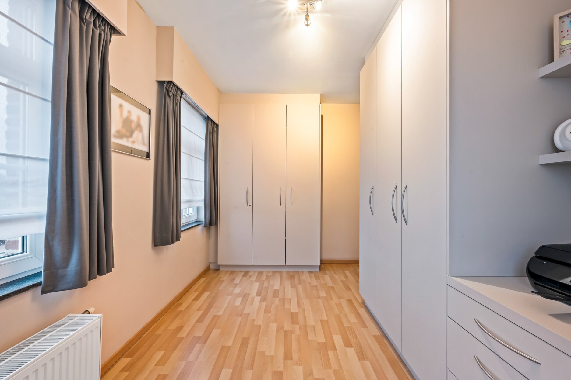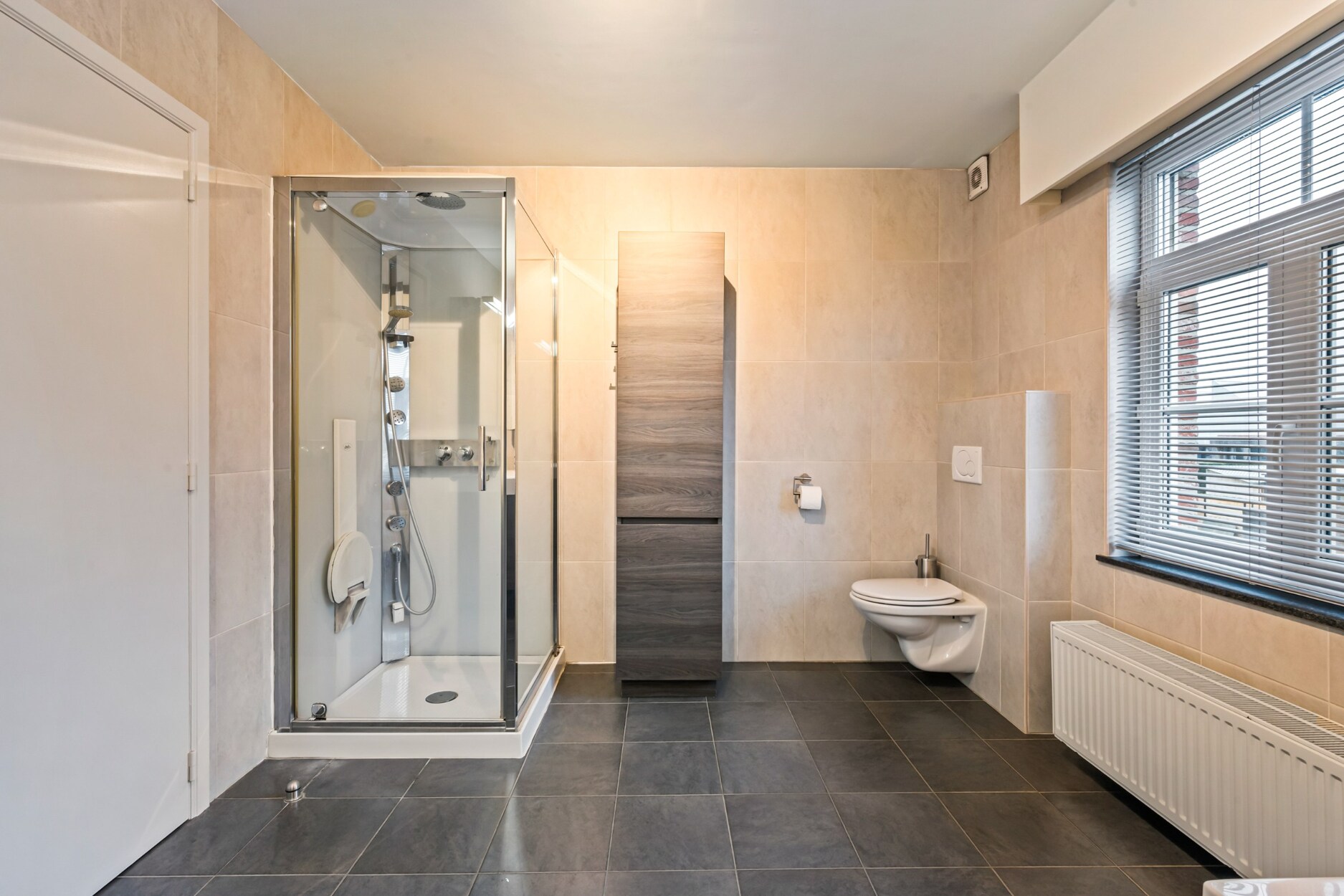 Vaste trap vanuit de keuken naar de bovenverdieping op laminaat. Hier treft u de masterbedroom aan de achterzijde, dewelke is voorzien van vele inbouwkasten. Verder nog 4 slaapkamers, allen voorzien van inbouwkasten/vast meubilair. De badkamer is ruim en praktisch voor een groot gezin en omvat een douche, ligbad, dubbele lavabo in meubel en een toilet.