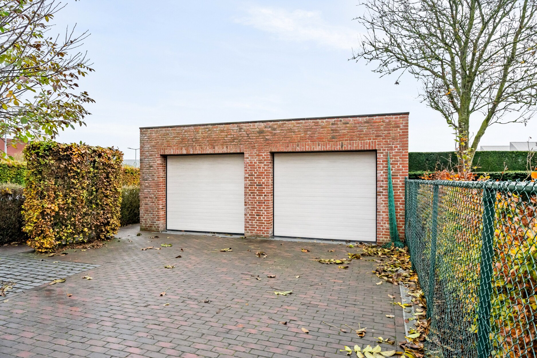 Apart garagegebouw in de tuin, toegankelijk via oprit aan de zijkant naar achter. Net als onder de woning is ook hier kruipruimte voorzien. Houten hok achter de garage voor opslag. Zwembadinstallatie aanwezig in garage. Zwembad met overkapping werd gebouwd ca. 2008. Mooi terras aan de zij kant van de woning (zuid-west).