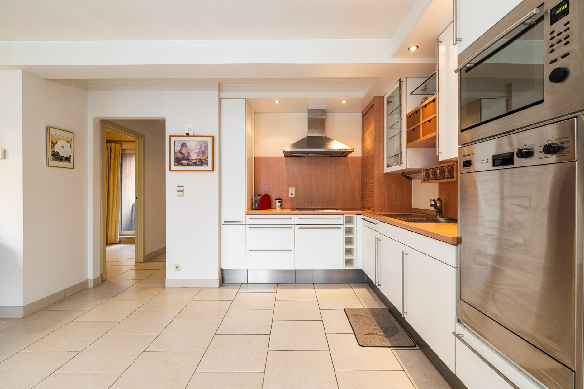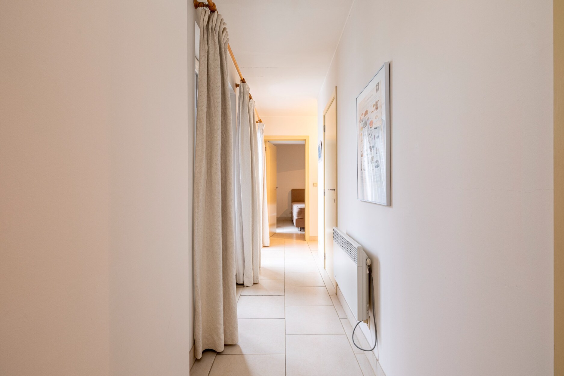 Via de verzorgde gemeenschappelijke inkomhal betreden we het appartement op de 2e verdieping via EU-conforme lift of ruime trappenhal. Privatieve inkomhal met vestiairegedeelte en apart toilet met handenwasser. Vanuit de hal is er toegang tot alle vertrekken. Vooraan bevindt zich de woonkamer met plaats voor een zithoek, een eethoek en een volledig geïnstalleerde open keuken met voldoende opbergmogelijkheden.