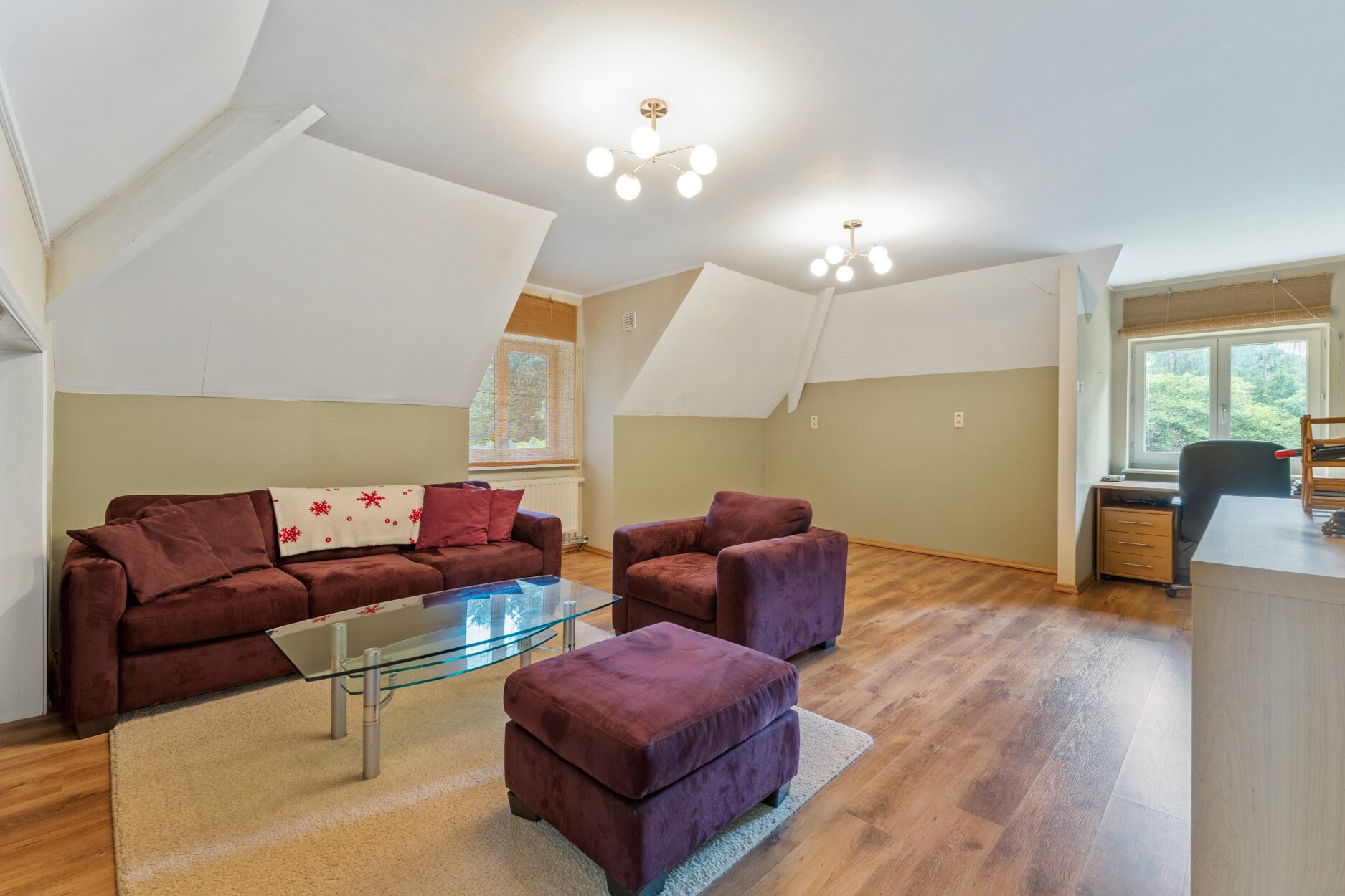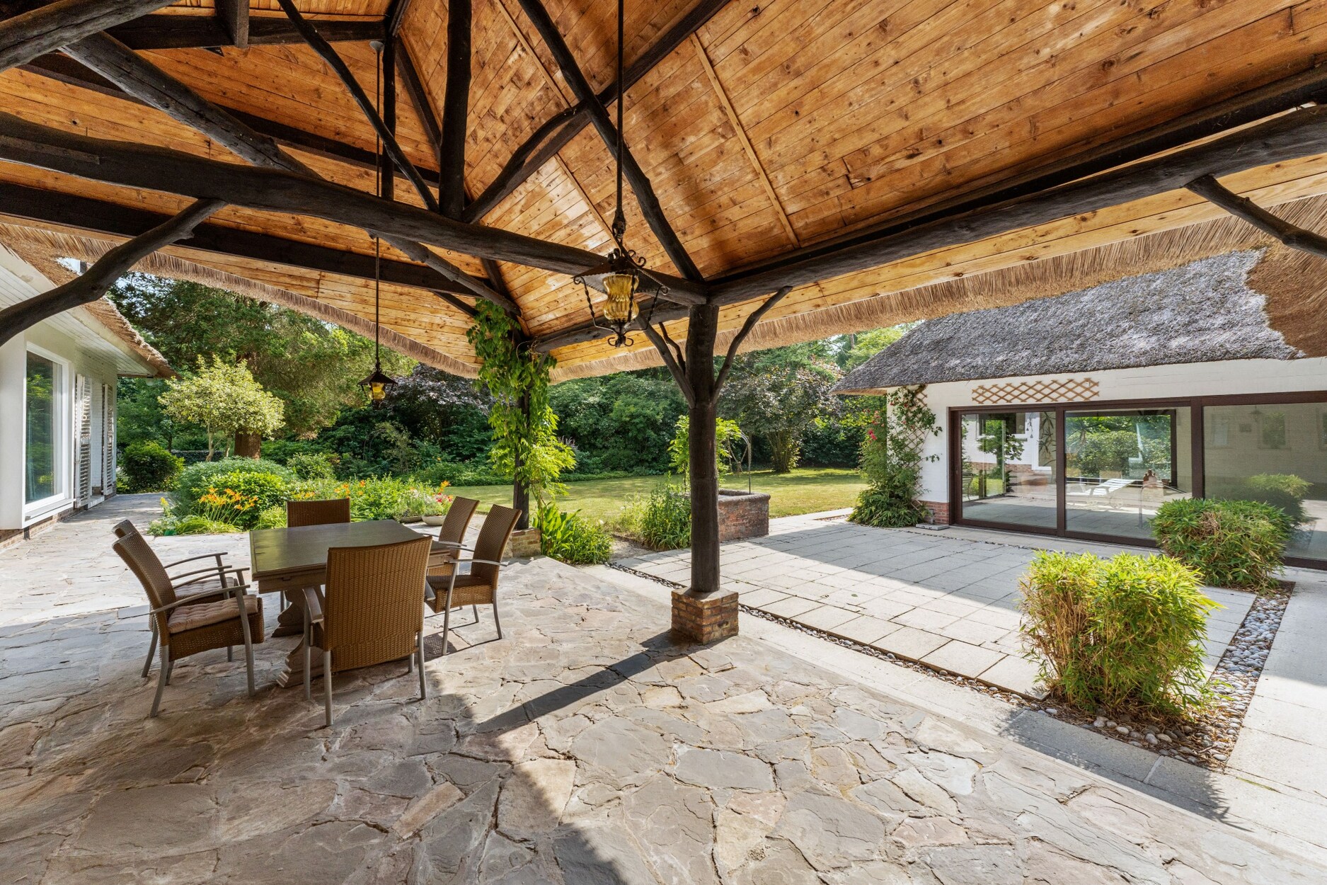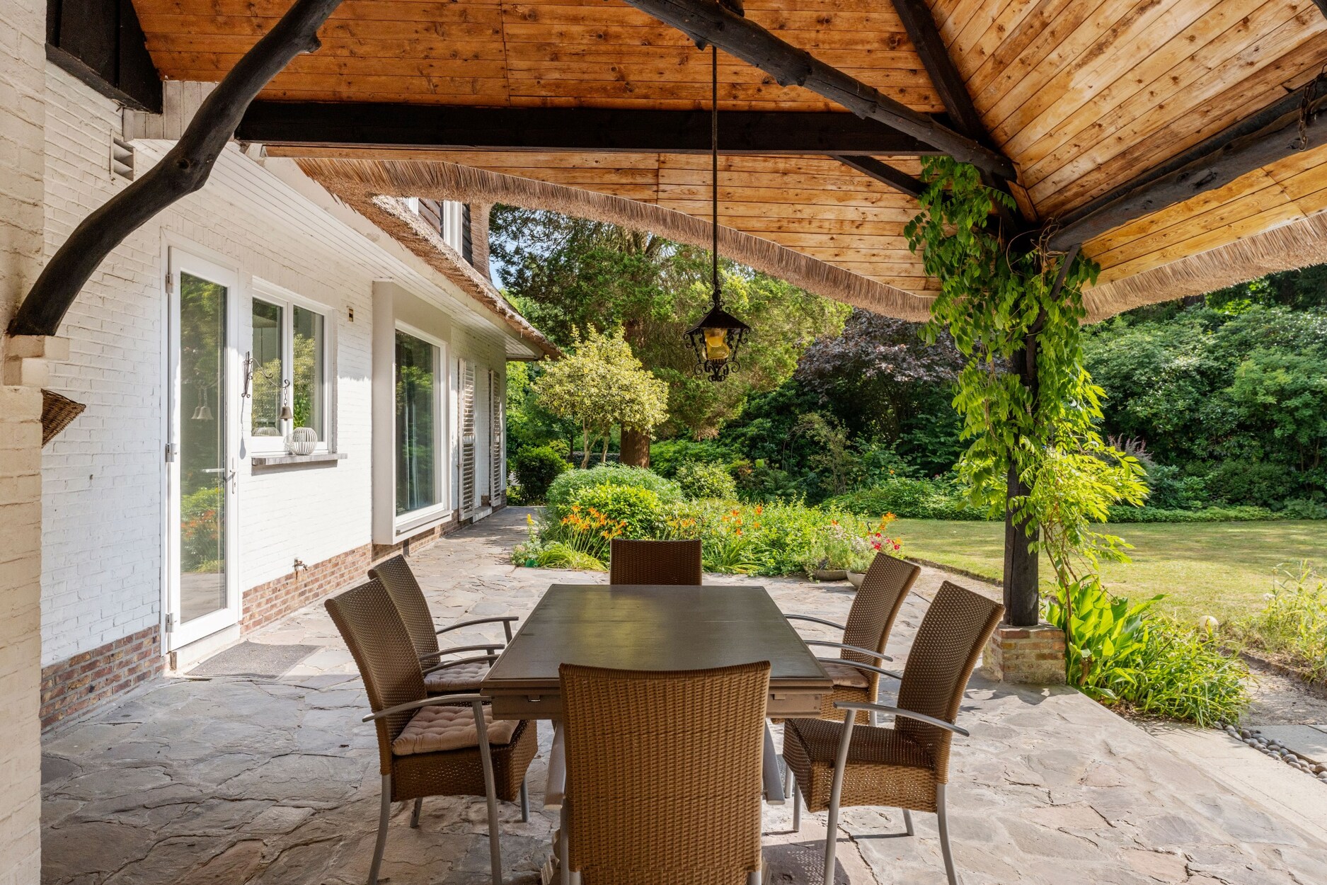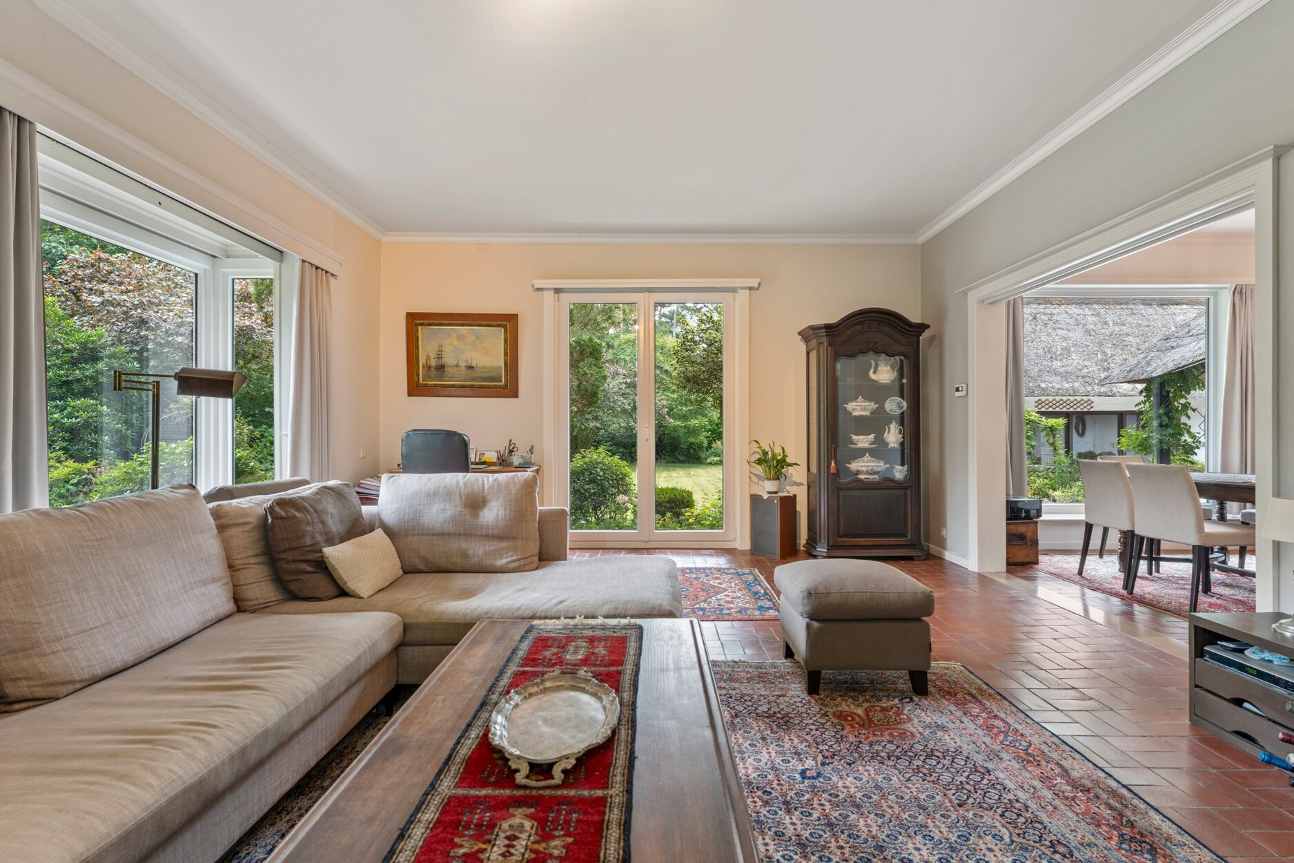 Via de private oprijlaan met ruime parkeermogelijkheden bereikt u de inkomhal met vestiaire, gastentoilet en toegang tot kelder en verdieping. De lichtrijke leefruimte (ca. 51 m²) met open haard en kamerhoge raampartijen biedt een mooi zicht op de tuin en directe toegang tot het terras. Aansluitend bevindt zich de keuken (ca. 11 m²) met toegang tot het overdekte terras.