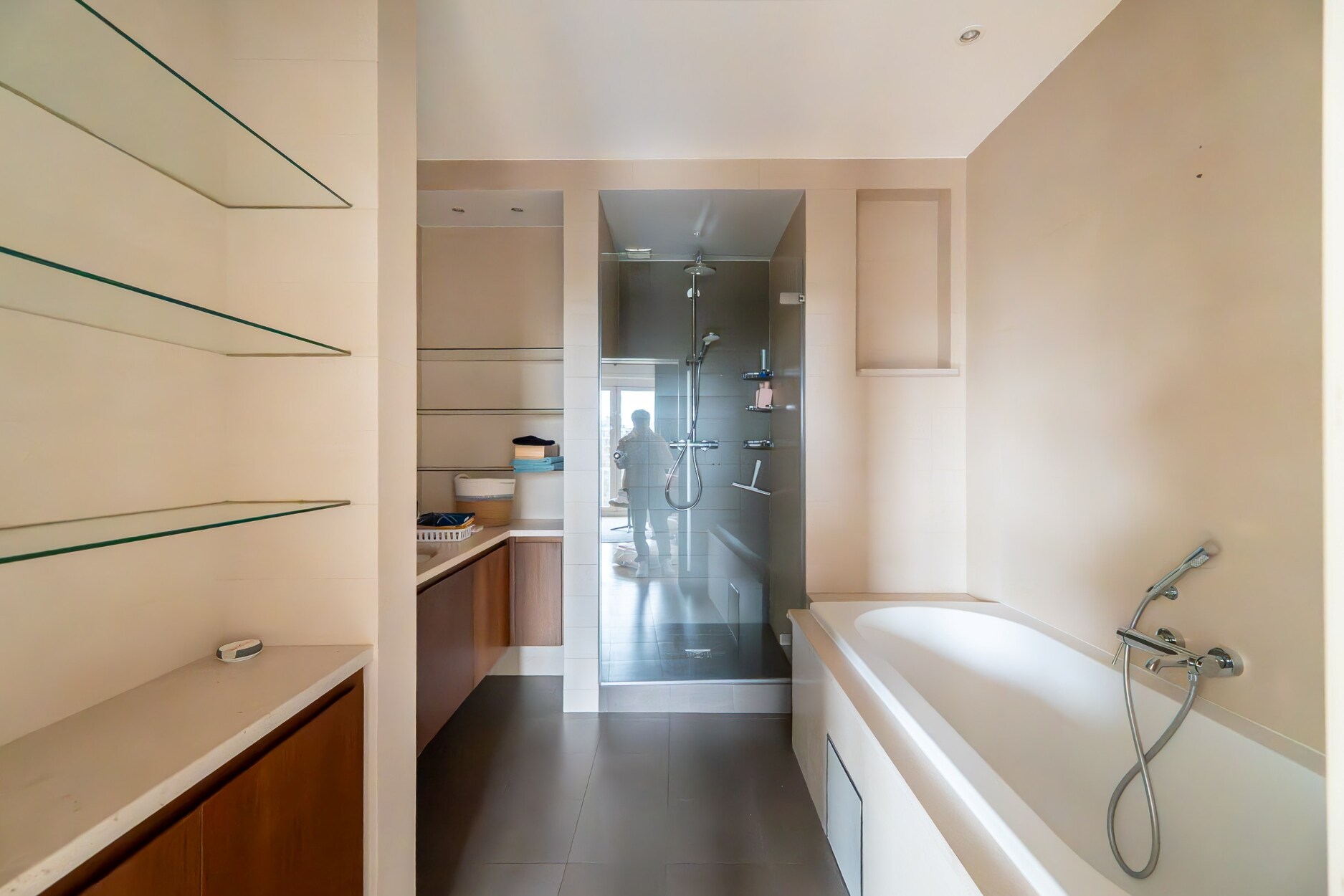 De hoofdnachthal, voorzien van talrijke ingebouwde kasten, geeft toegang tot twee slaapkamers, een dressing en een volledige badkamer met ligbad, douche en toilet. Aan de andere zijde van het appartement bevindt zich een bijkomende ruime slaapkamer met eigen badkamer met douche en een apart toilet. Een ruim bureau en een extra slaapkamer vervolledigen de indeling van dit appartement met uitzonderlijke proporties.