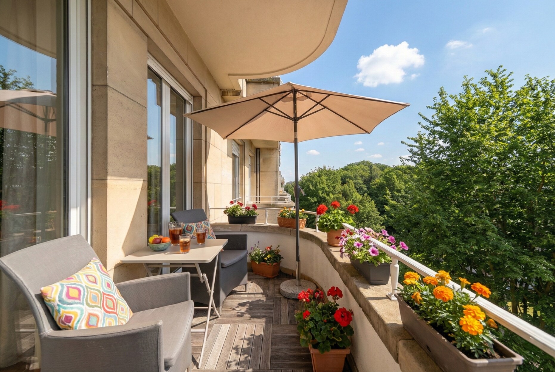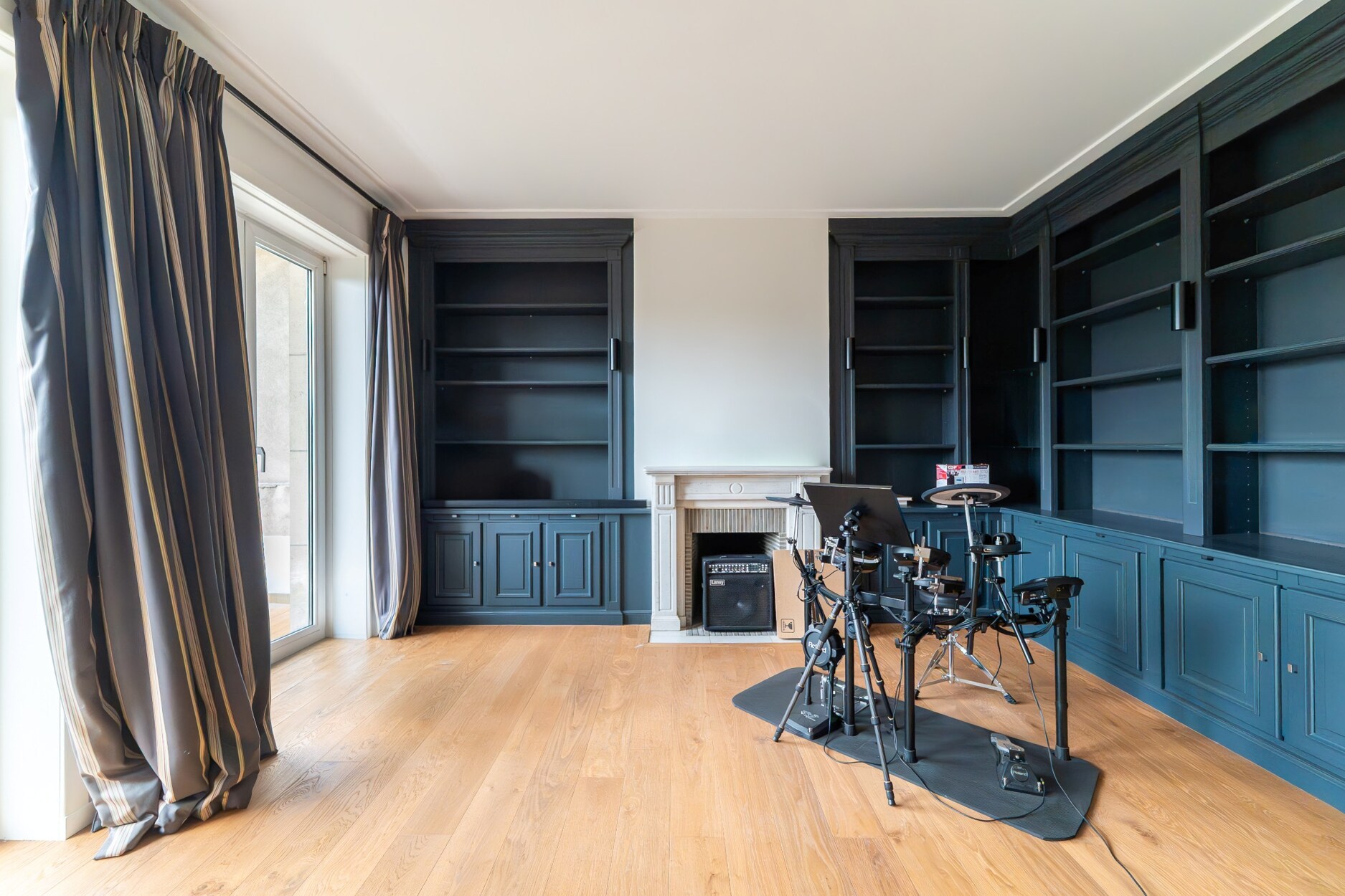 Het appartement opent op een ruime centrale inkomhal met gastenvestiaire, die op harmonieuze wijze zowel de ontvangstruimten als het nachtgedeelte ontsluit. De bijzonder lichtrijke leefruimte biedt directe toegang tot een terras, terwijl de eetkamer in het verlengde ervan ligt en geniet van een open zicht op het park. De afzonderlijke, volledig uitgeruste keuken beschikt over een toegang tot een achterterras en een aangrenzende wasruimte.