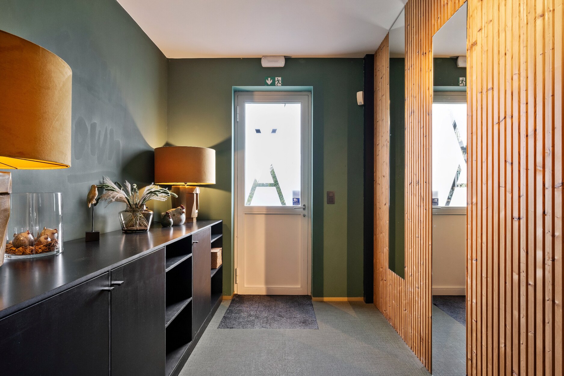 Aan de linkerzijde bevindt zich een eerste ruimte met aparte inkom, ideaal als kantoor, praktijkruimte of vrij beroep, waarbij discretie en toegankelijkheid perfect samengaan.