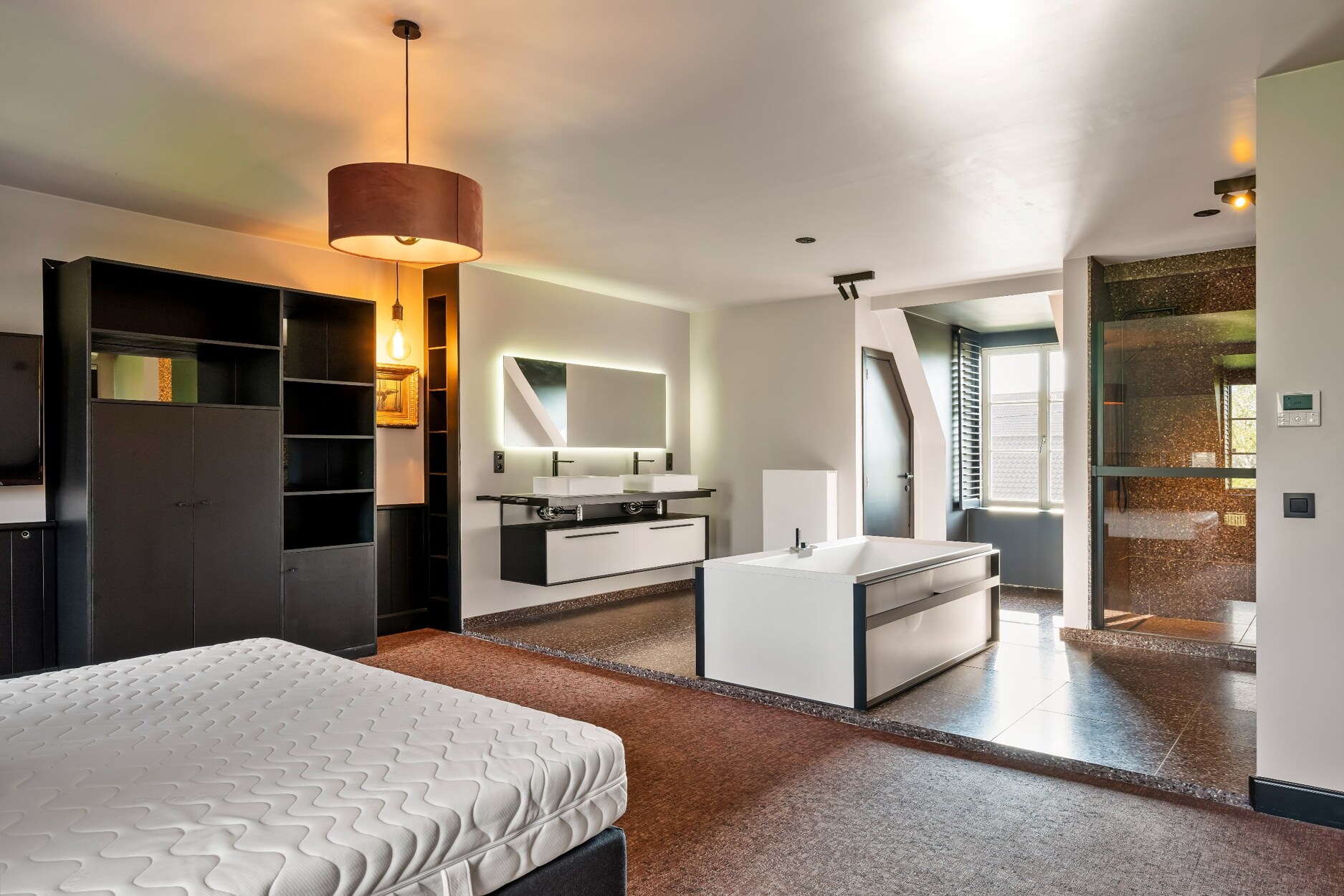 De luxueuze master bedroom onderscheidt zich door haar royale oppervlakte en beschikt over een mezzanine die perfect kan worden ingericht als dressing, bureau of extra slaapplek.