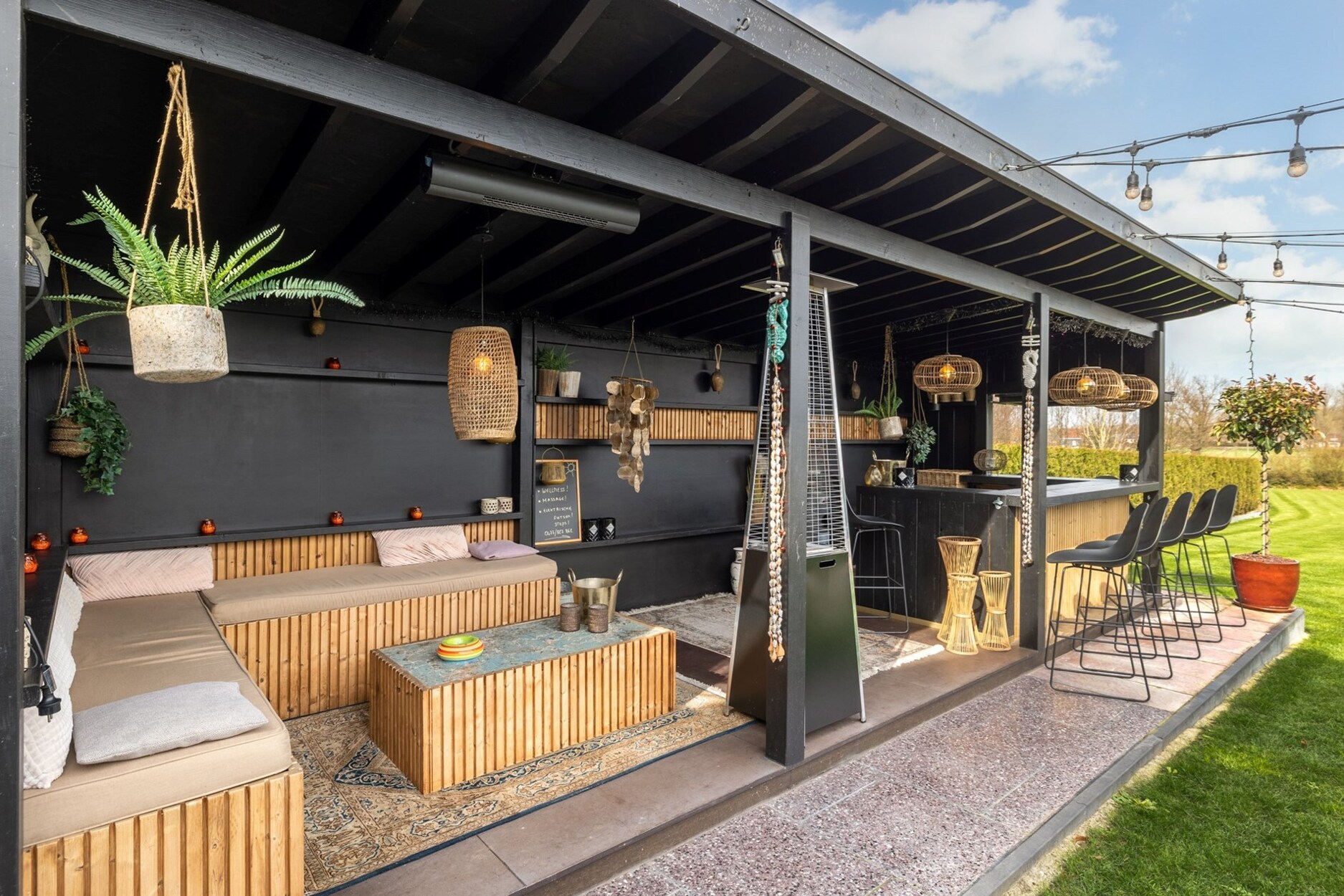 De sfeervolle buitenbar maakt het buitenleven compleet en creëert de ideale setting voor ontspanning of stijlvolle ontvangsten. Bovendien zijn alle voorzieningen reeds aanwezig voor de aanleg van een zwembad.