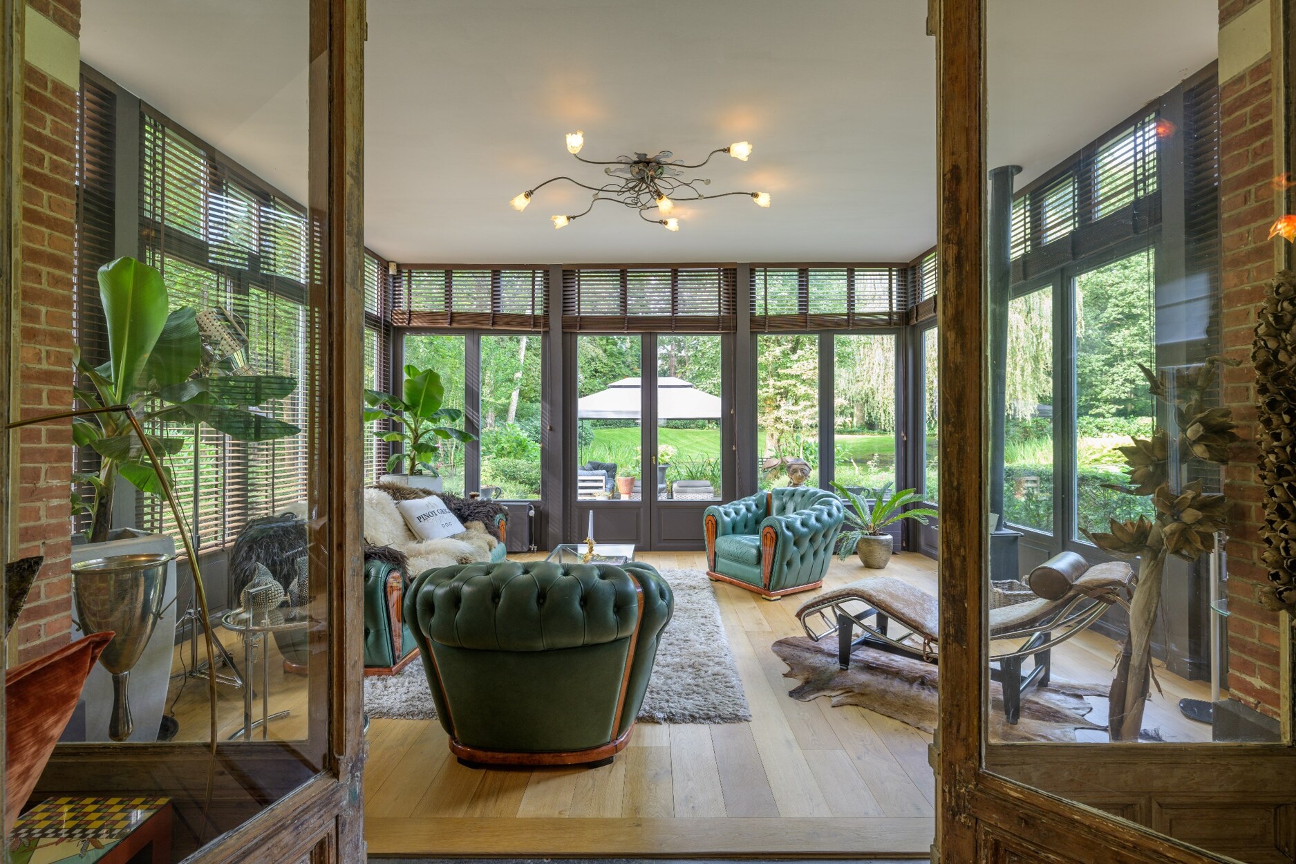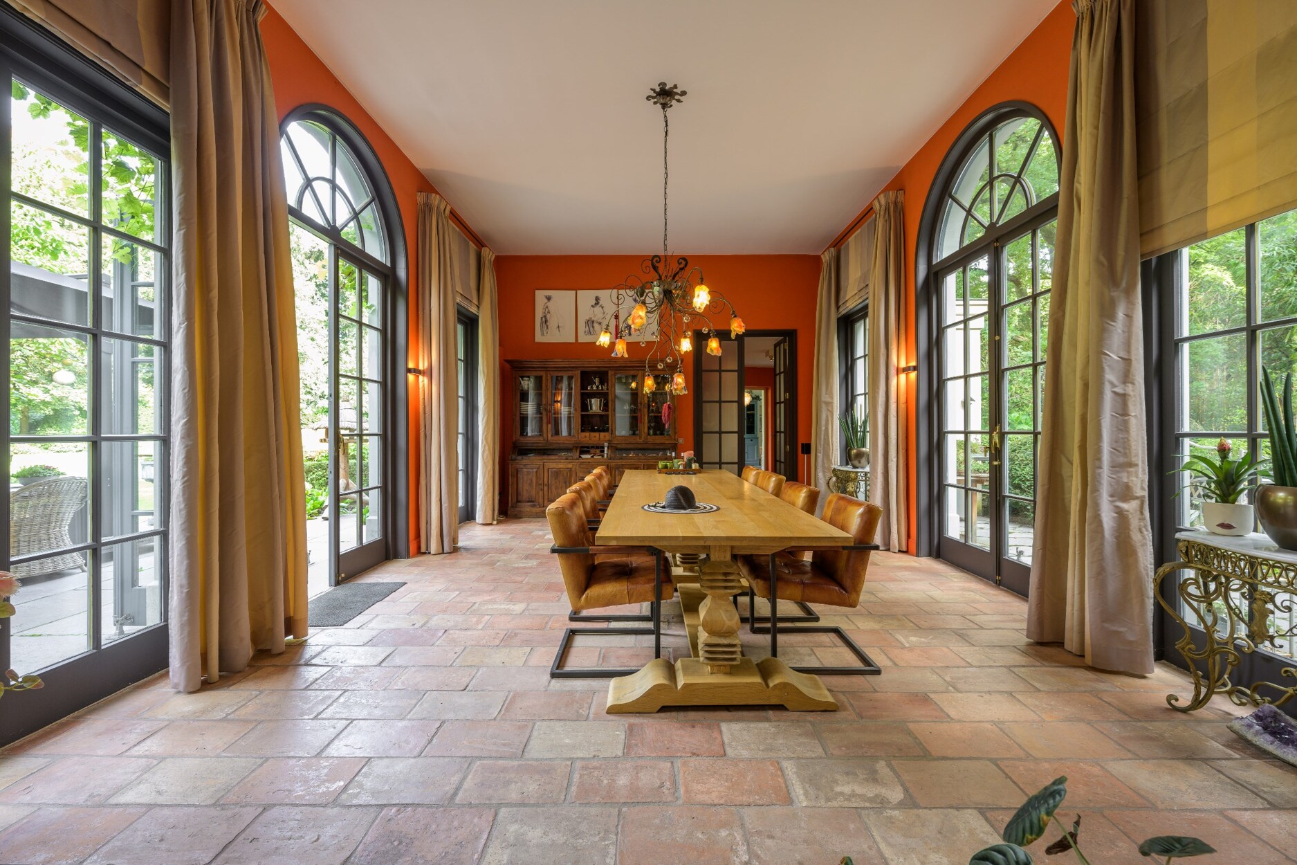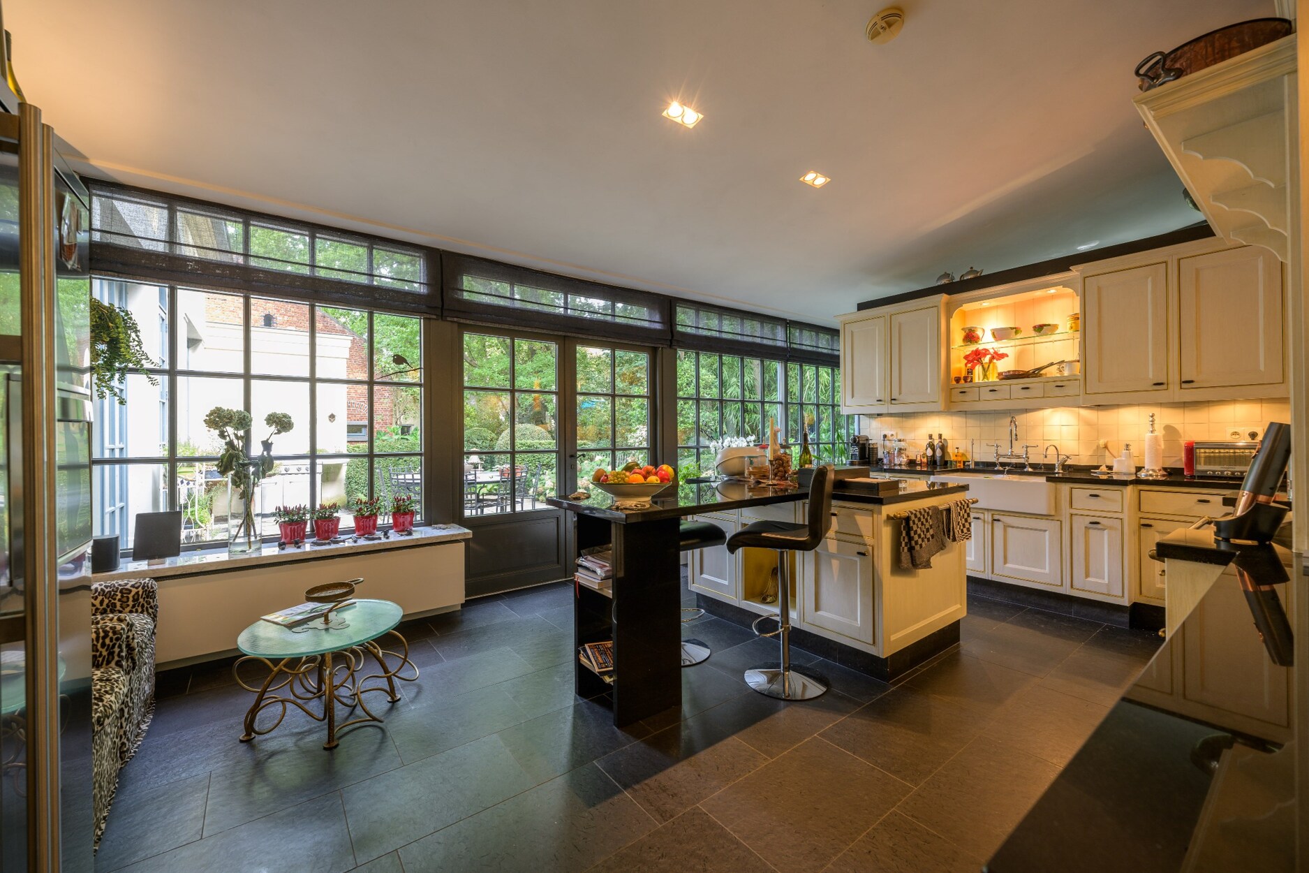 Aansluitend komt men tot de sfeerrijke orangerie uitgerust met grote raampartijen. De uitgebreide spa met sauna, hammam en binnenzwembad bevindt zich in het verlengde van de villa samen met nog een praktische wasruimte en kantoorruimte die dankzij de gigantische raampartij nauw verbonden is met de tuin waardoor men een echt buitengevoel krijgt.