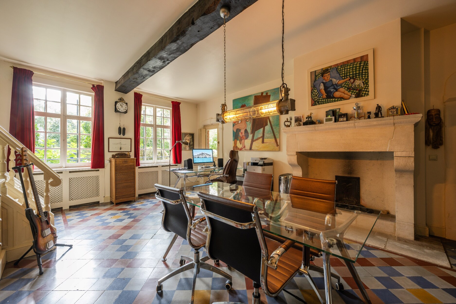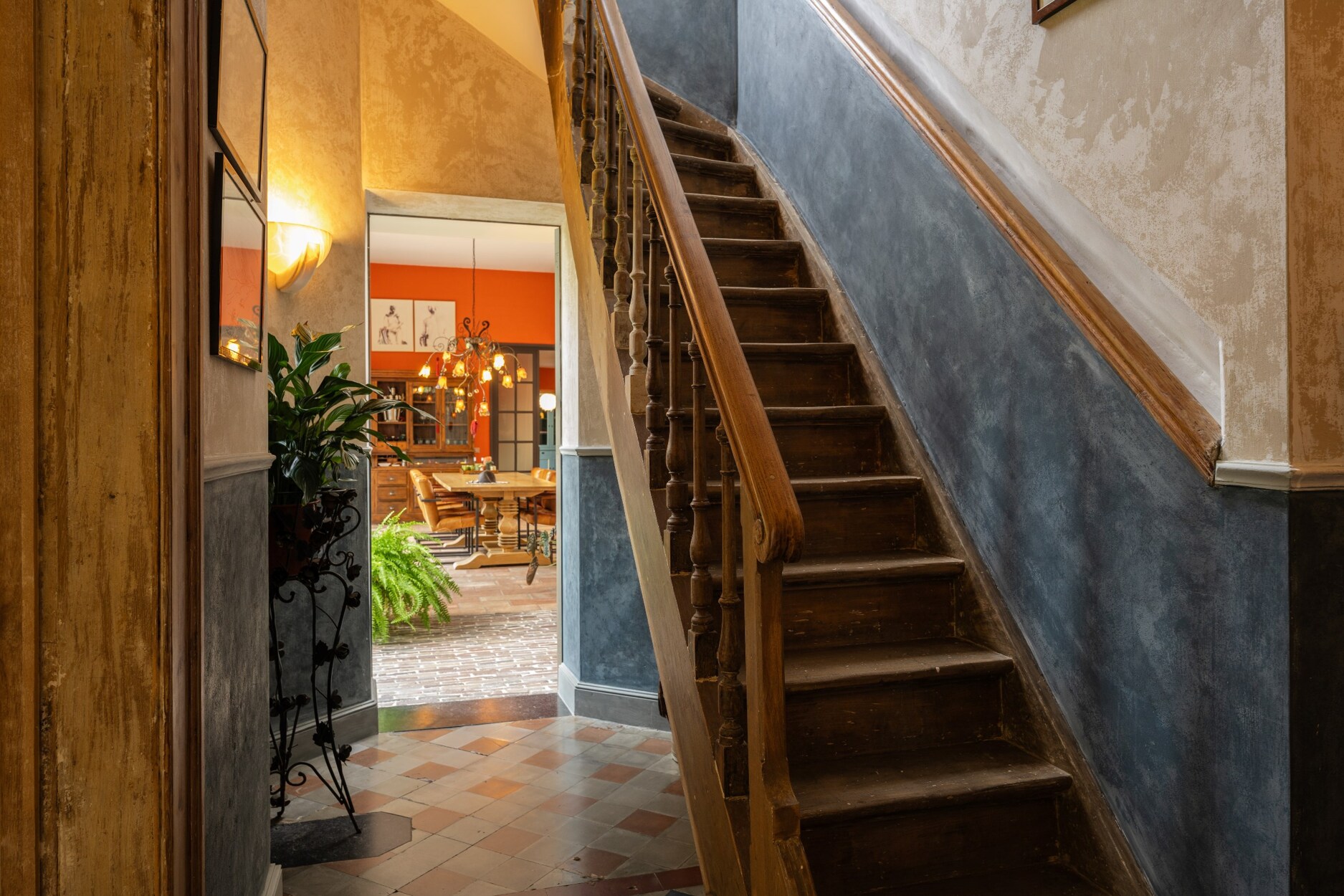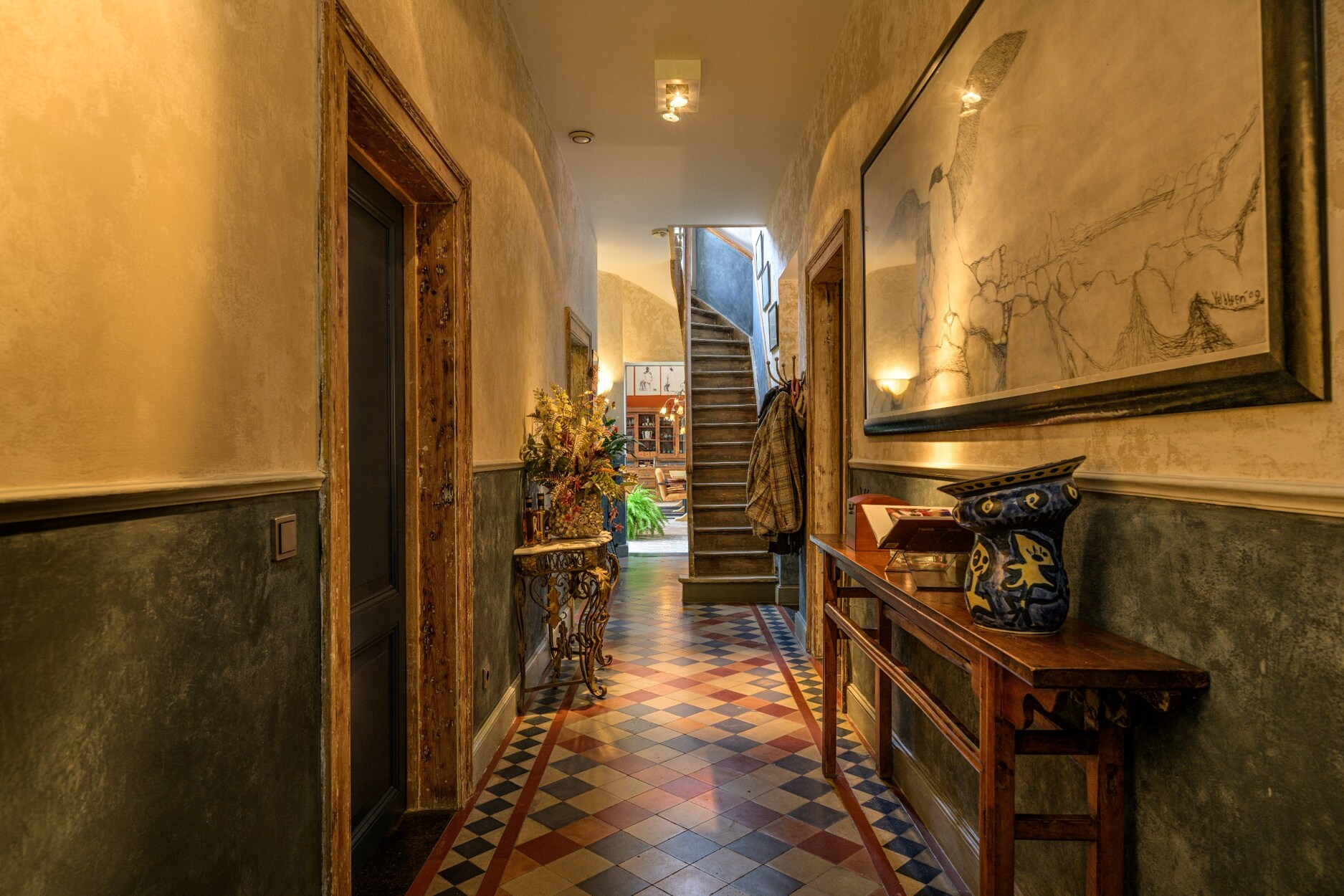 De woning betreden doet men via de charmante inkomhal op originele 18e eeuwse tegel. De hal geeft uit op beide leefruimtes, de ene werd hedendaags afgewerkt en bevat onder meer nog een tuinkamer die een prachtig uitzicht biedt op de parktuin met vijverpartij. De andere leefruimte is trouw aan zijn tijd, tevens met afwerking op originele tegel en met authentieke kasteelhaard.
