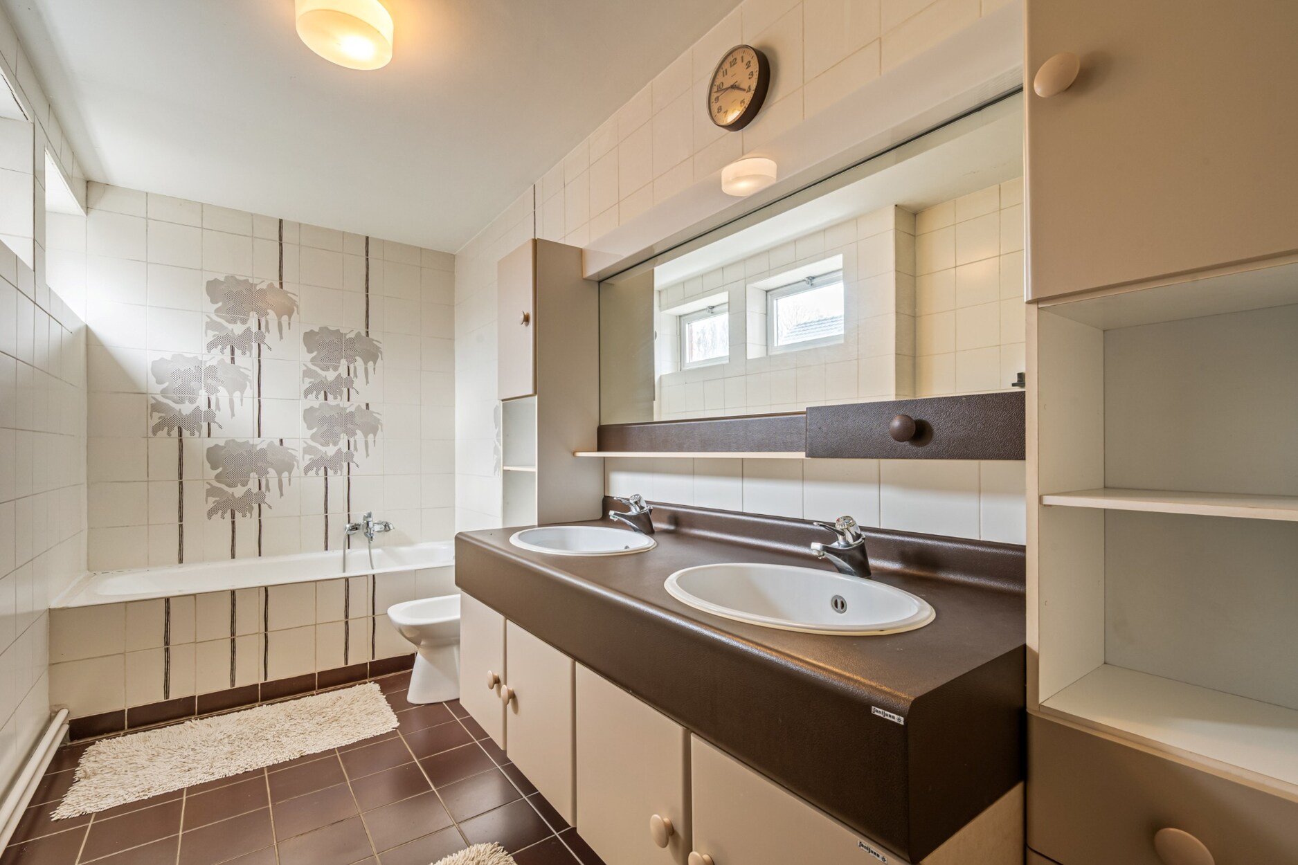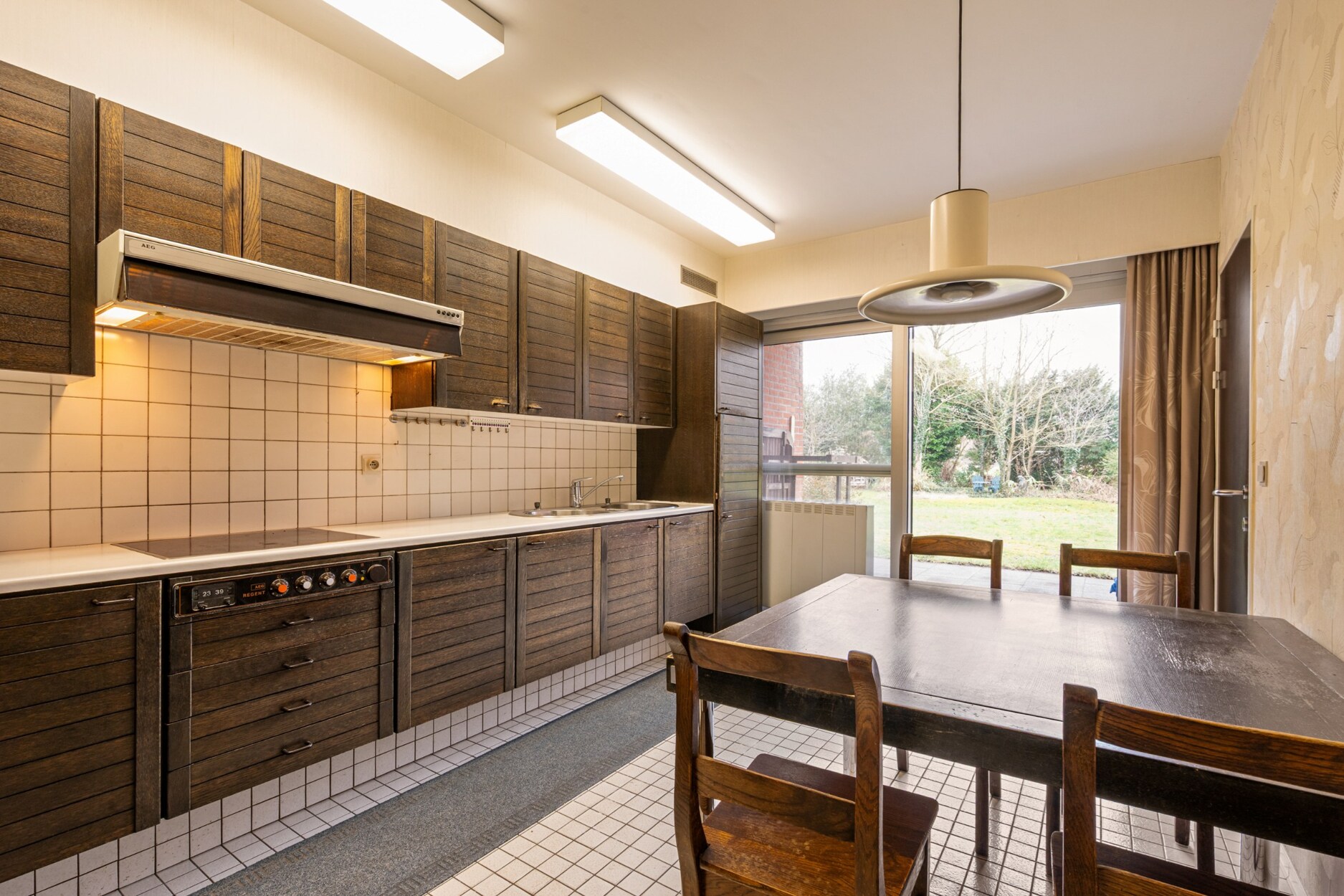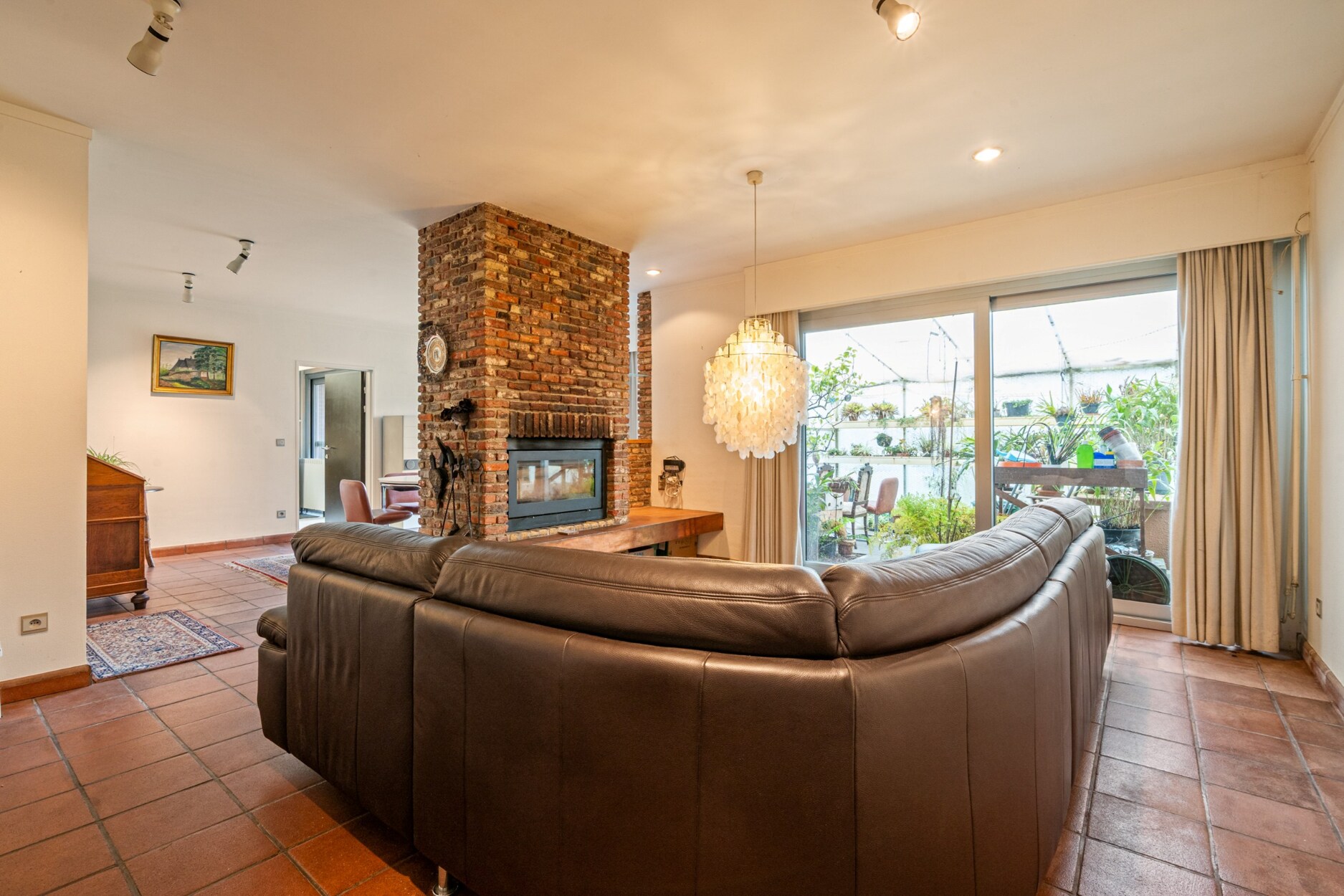 Bij het betreden van de woning kom je in een ruime inkomhal met vestiaire en apart gastentoilet met aansluitend een trappenhal. De lichtrijke woon- en eetkamer met ingebouwde haard, geeft zicht en toegang tot het terras en de achterliggende tuin met aansluitend de keuken voorzien van een ontbijthoek met eveneens toegang tot het terras en tuin. Verder is er op het gelijkvloers een douchekamer, berging met technische ruimte en een inpandige garage met elektrische poort.