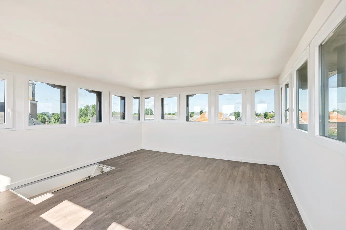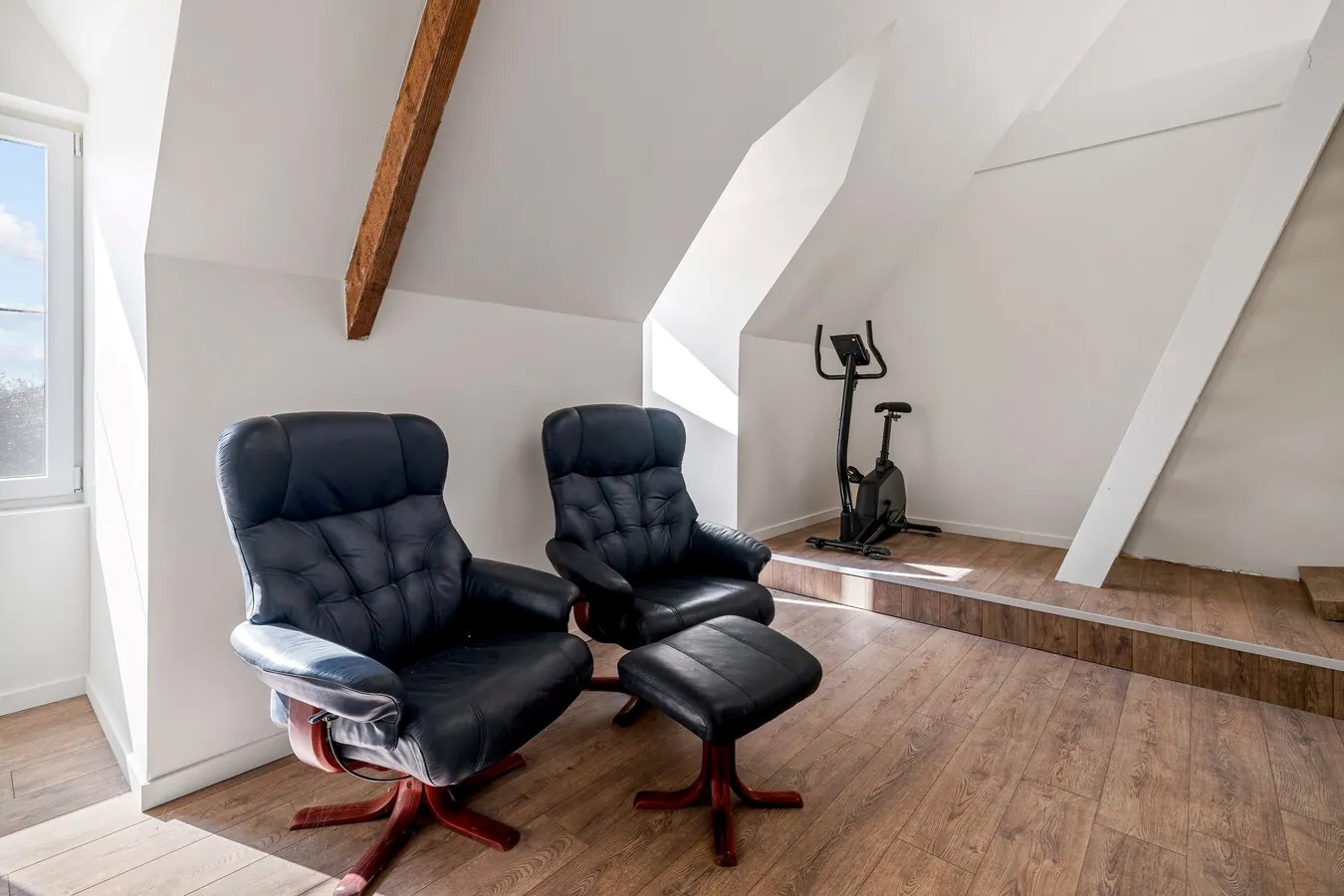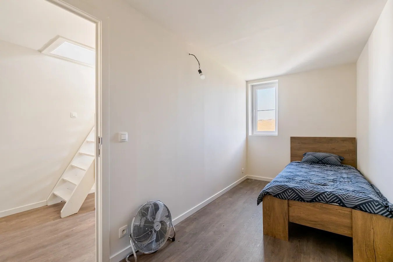 De trap leidt naar de 2° verdieping met de 2° slaapkamer en een technische ruimte. Een volgende trap gaat tot de torenkamer, eventueel nuttig als bureel, 3° slaapkamer of fitnessruimte, met een fantastisch uitzicht over de buurt.