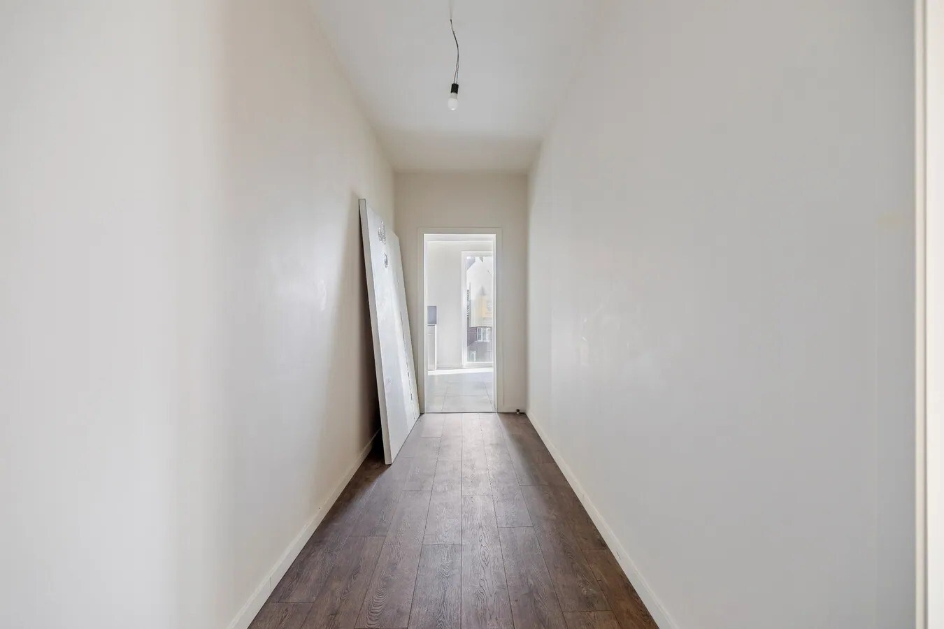 Links de badkamer met toilet, wastafel en stortbad. Rechts een eerste kamer. Aan het eind van de gang is er, enerzijds de keuken en aan de andere kant de zithoek.