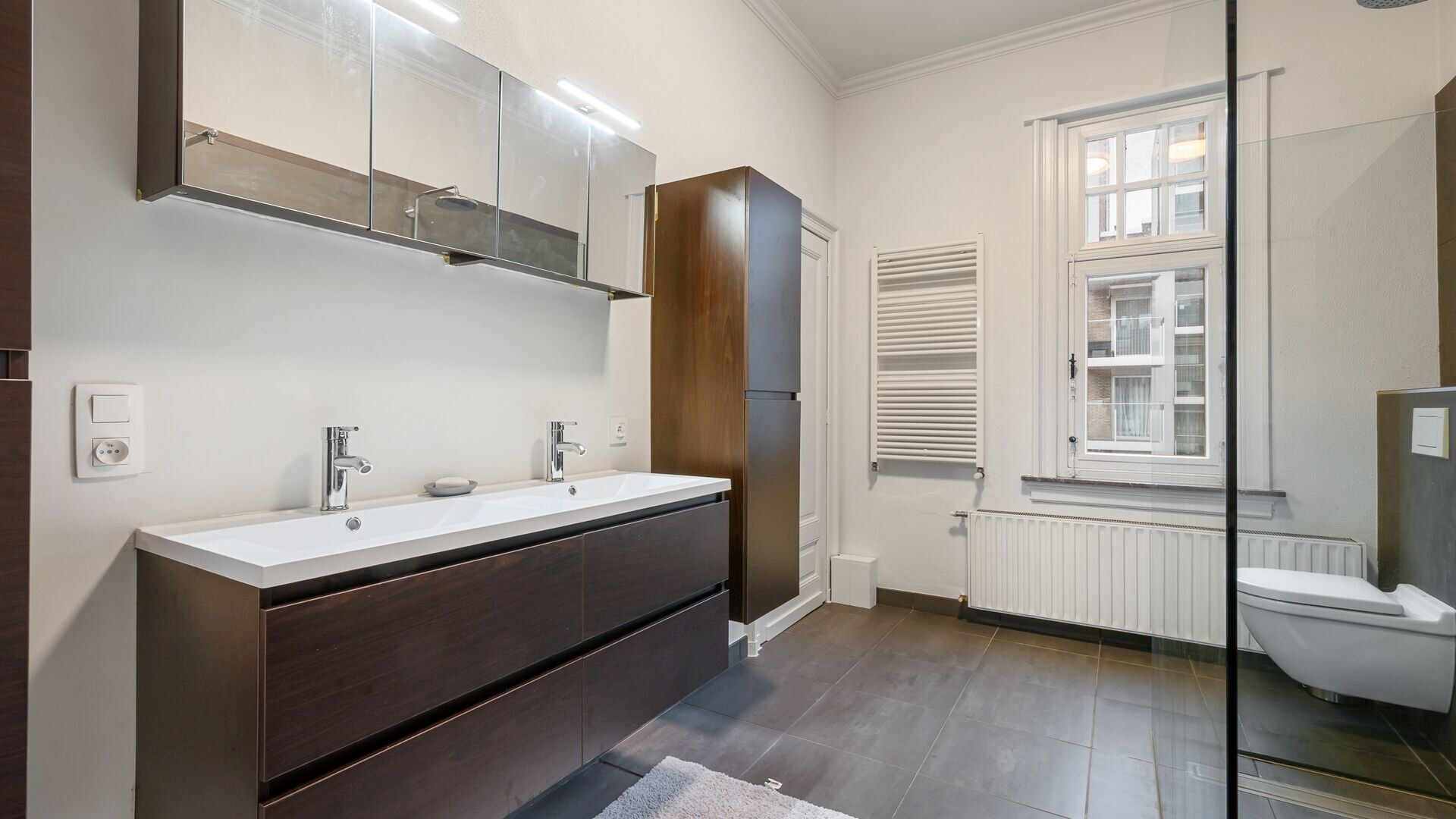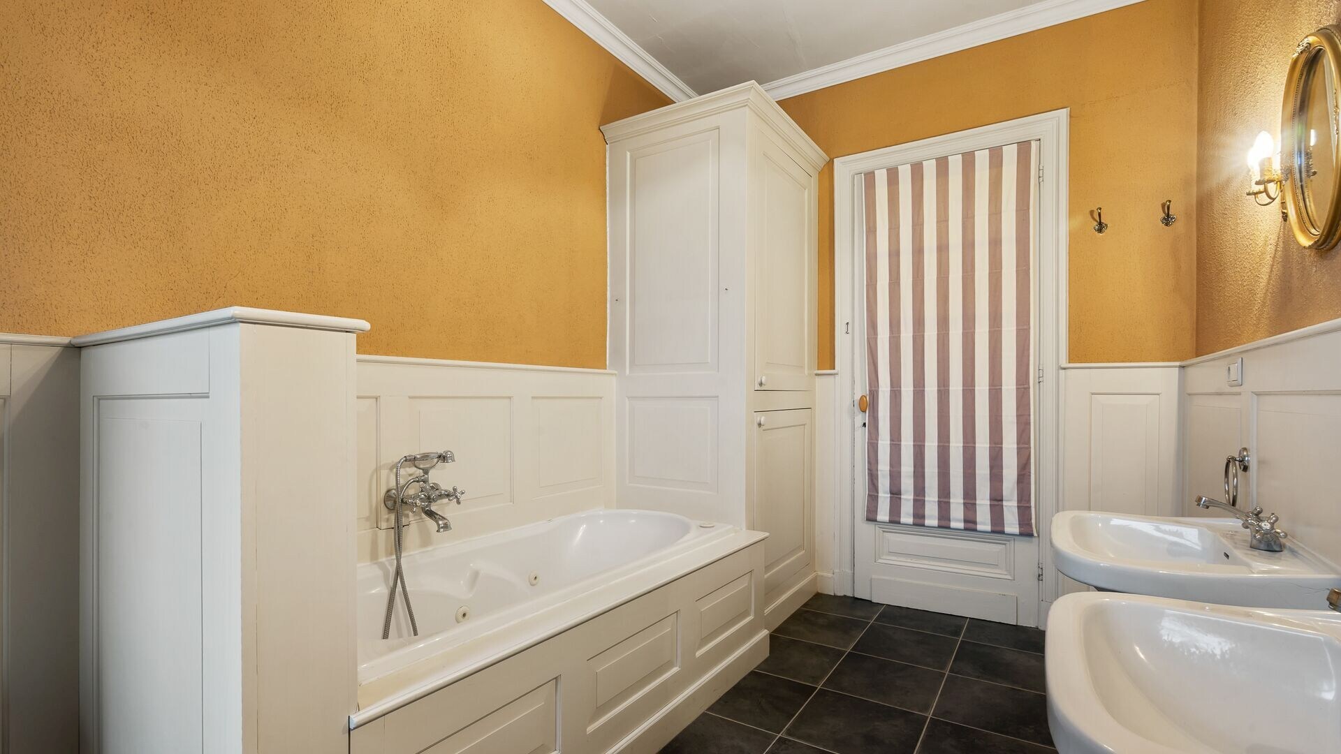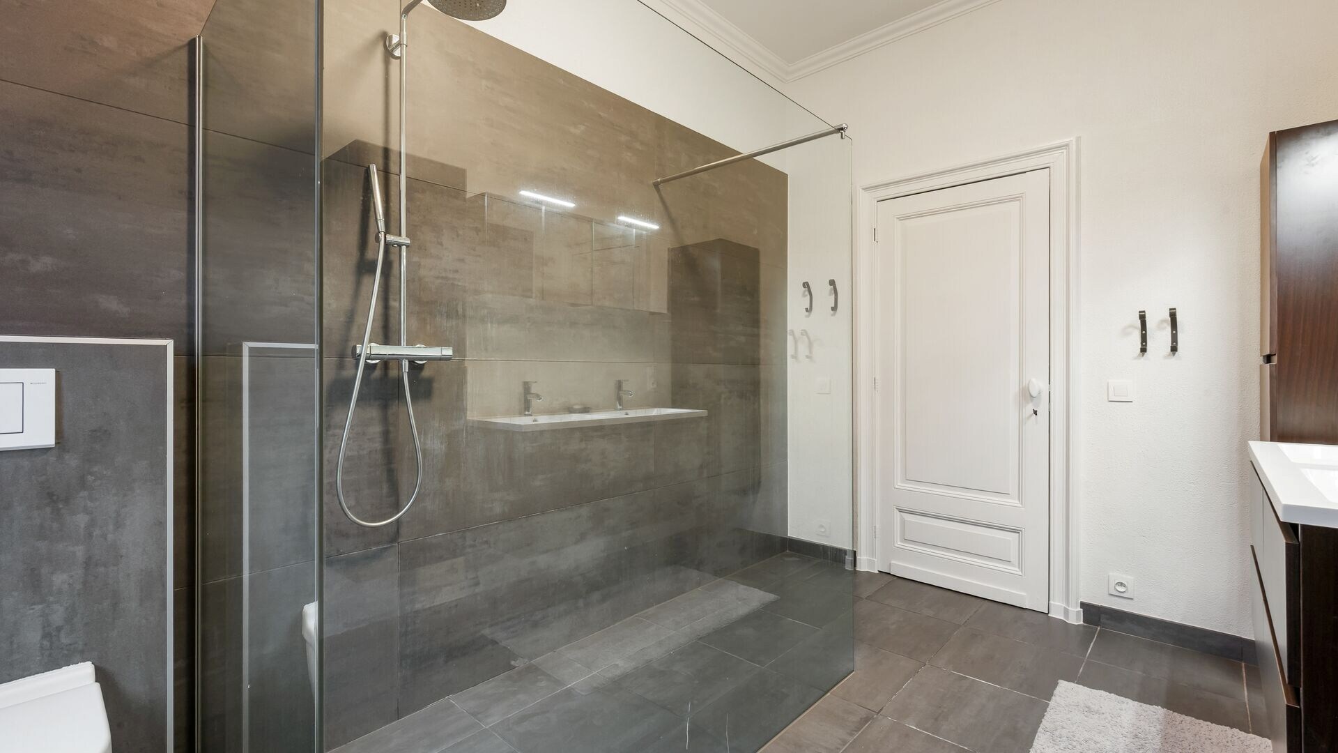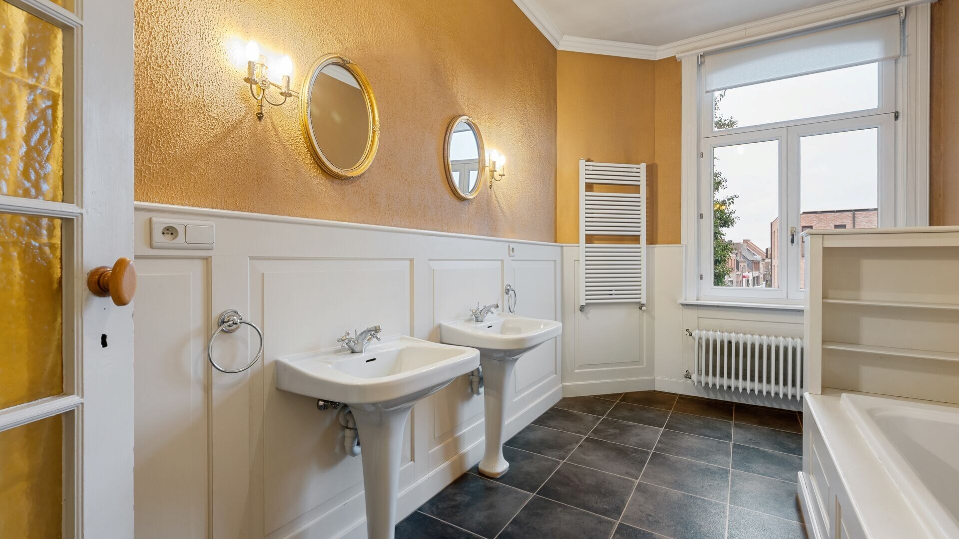 Bij het betreden van deze statige woning naar de hand van architect Jules Taeymans word je meteen verwelkomd in een indrukwekkende inkomhal die naadloos overgaat in een karaktervolle traphal. Op deze verdieping bevinden zich een recent vernieuwde keuken (Interieurstudio Hoskens), een sfeervol salon met hoge plafonds en verfijnde ornamenten, een ruime eetkamer en een lichtrijke tuinkamer die uitkijkt op de tuin.