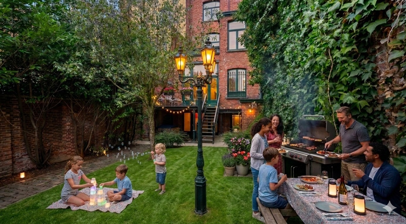 Buiten geniet je van een zonnig terras, een gezellige stadstuin en rechtstreekse toegang tot de dubbele garage.