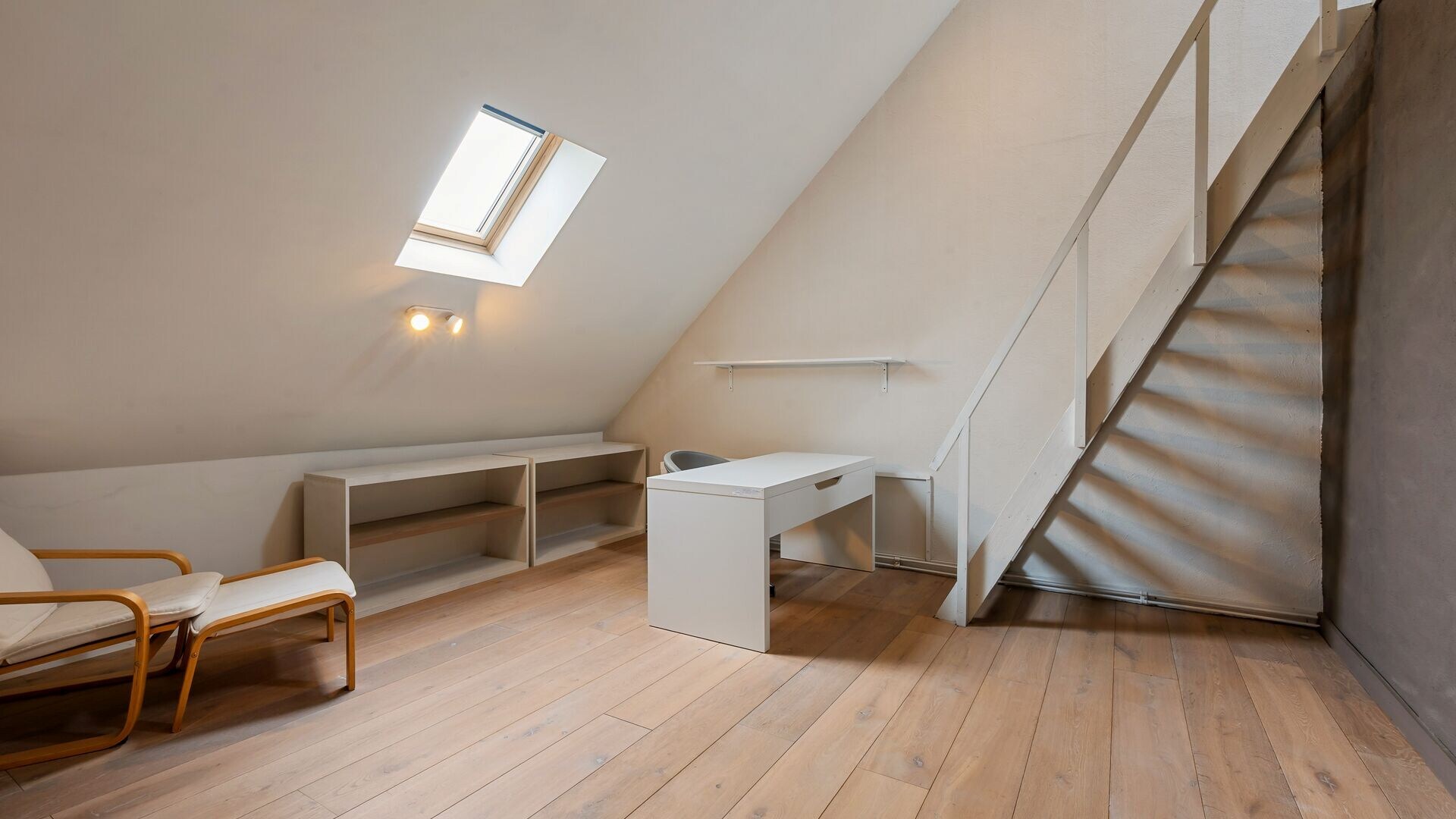 Daarnaast is er een polyvalente hobby- of kantoorruimte met apart sanitair en sauna, rechtstreeks toegankelijk via de inkomhal – ideaal voor ontspanning of professioneel gebruik. Aansluitend vind je de technische ruimte met o.a. de omvormer van de zonnepanelen en de centrale verwarming.