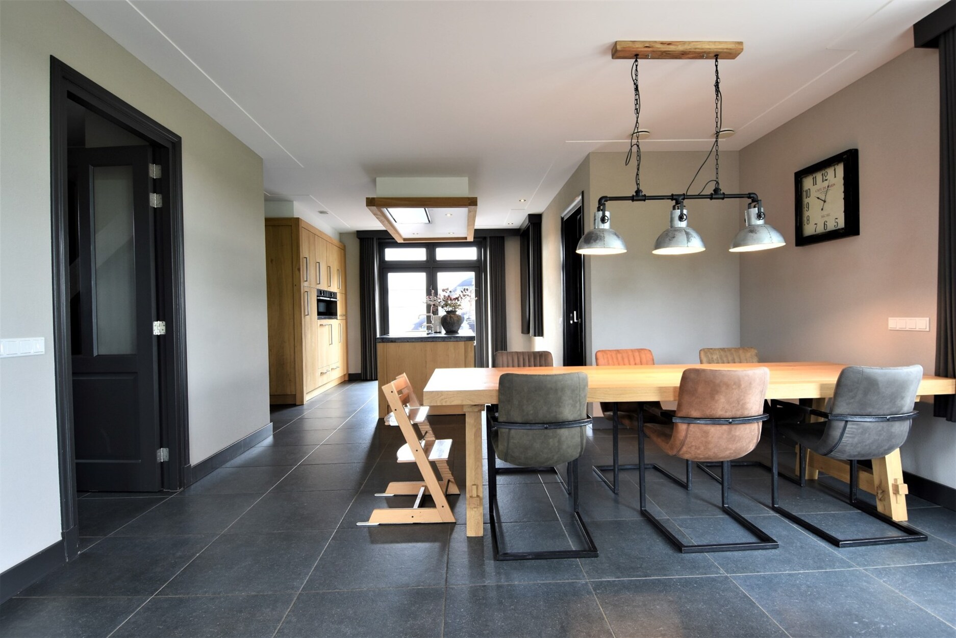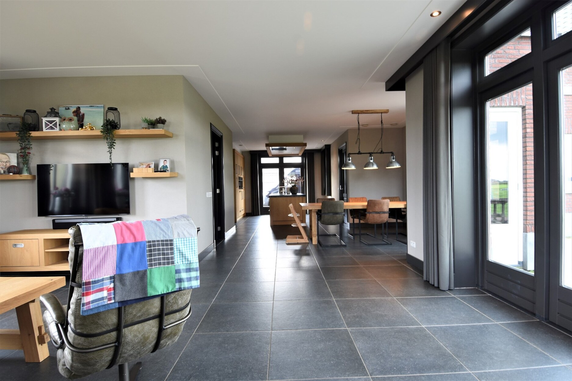 De achterinkom is gelegen aan de zijkant van de woning. Hier is een apart toilet en ruime wasplaats met douche. De keuken is voorzien van een granieten werkblad en is luxueus ingericht met een inductievuur met 6 kookzones, vaatwasser, koelkast, combi-oven, combi-stoomoven en een cooker. De leefruimte is open waardoor de keuken, eetkamer en woonkamer naadloos in elkaar doorlopen. Vanuit de woonkamer heb je een prachtig eindeloos zicht op de tuin en velden.