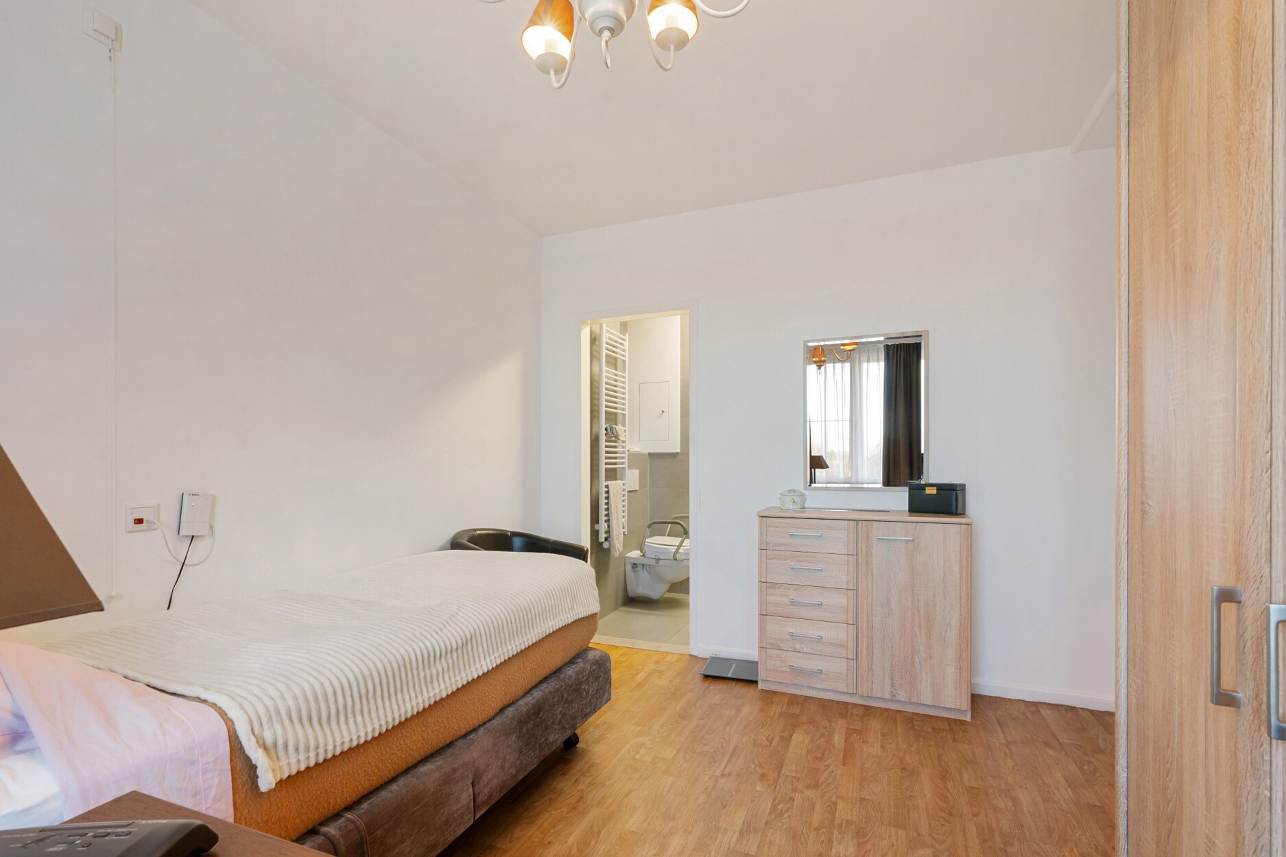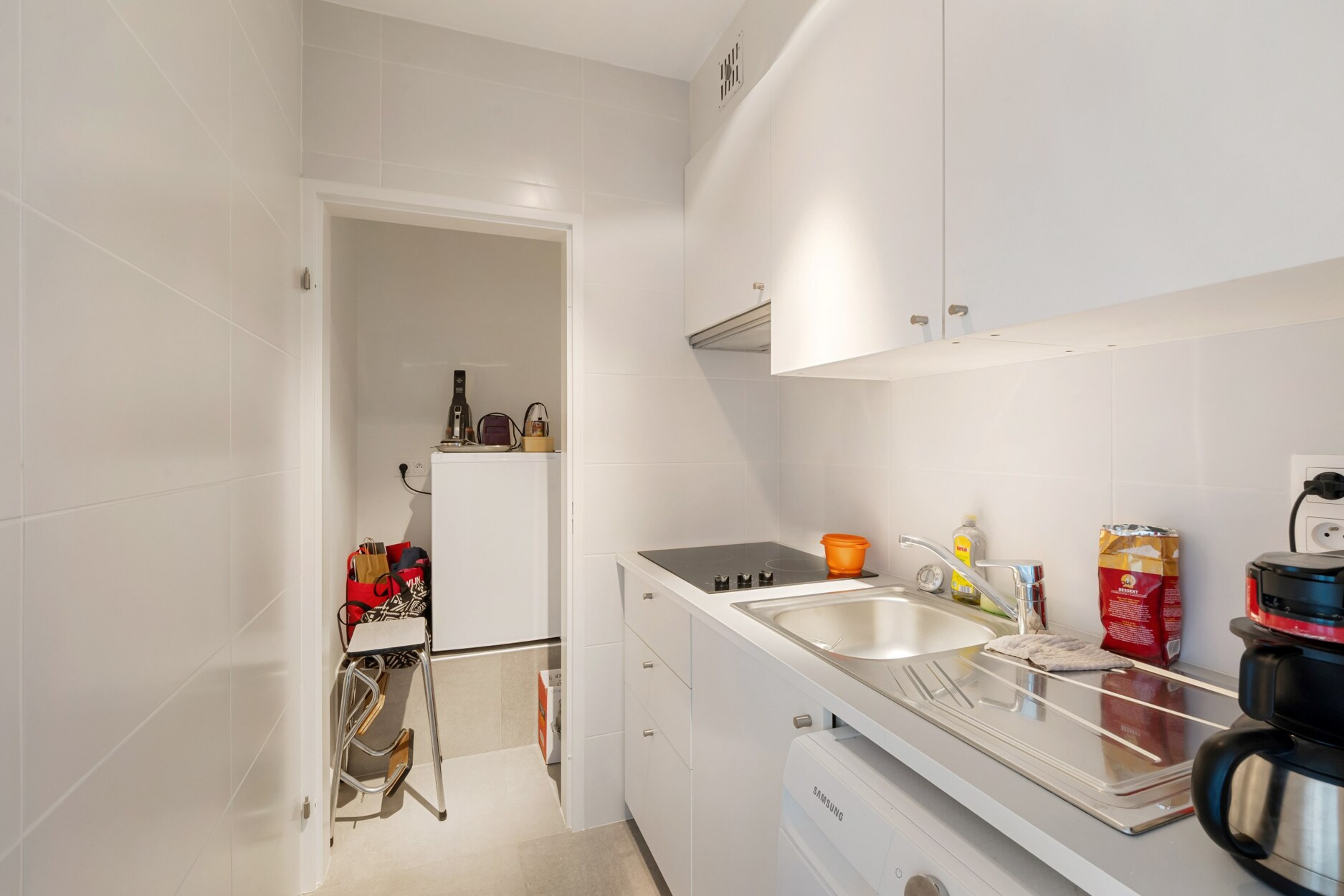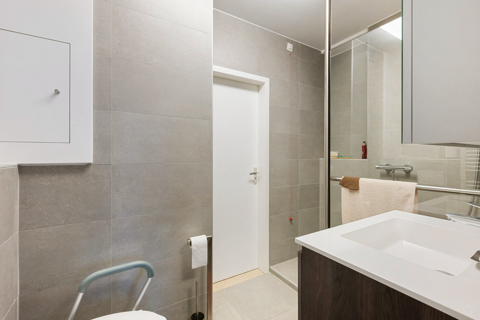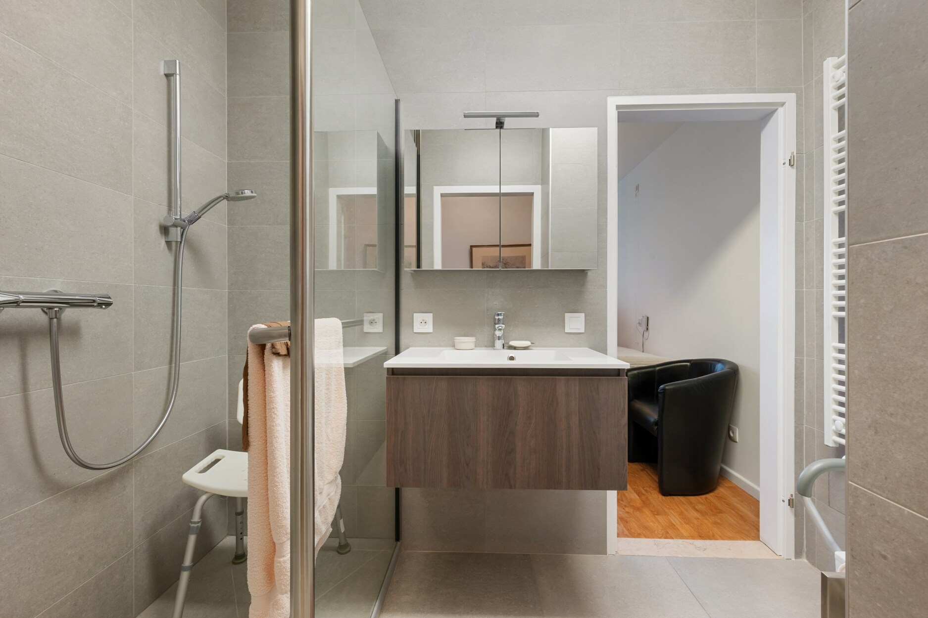 Via de inkomhal betreedt u de ruime leefruimte van 43 m² met grote raampartijen en directe toegang tot het terras. De keuken is functioneel ingericht en voorzien van een elektrisch kookvuur met afzuiging, spoelbak en aansluiting voor een wasmachine. Aansluitend bevindt zich een aparte bergruimte. De badkamer is bereikbaar via zowel de slaapkamer als de inkomhal en beschikt over een inloopdouche, toilet en lavabomeubel.