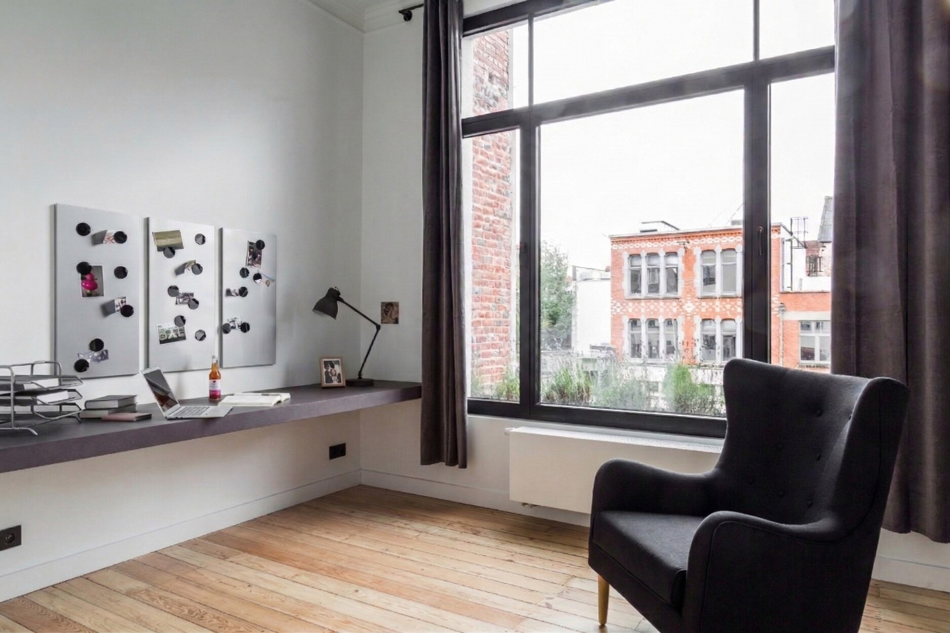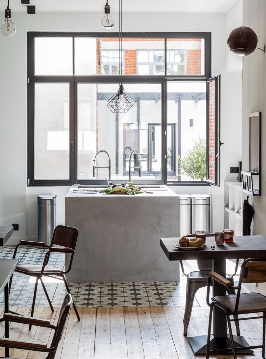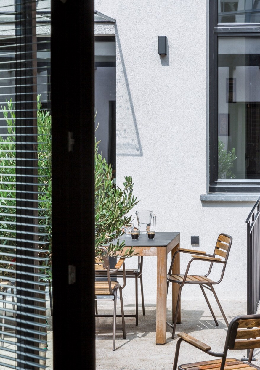 De inkomhal leidt naar een ruime doorlopende leefruimte met salon, eetkamer en open keuken met centraal eiland. De ruimtes genieten van veel natuurlijke lichtinval en geven rechtstreeks uit op een aangelegde binnenkoer. Achteraan bevindt zich een afzonderlijk bureau met vloerverwarming, eigen douchekamer en toilet.