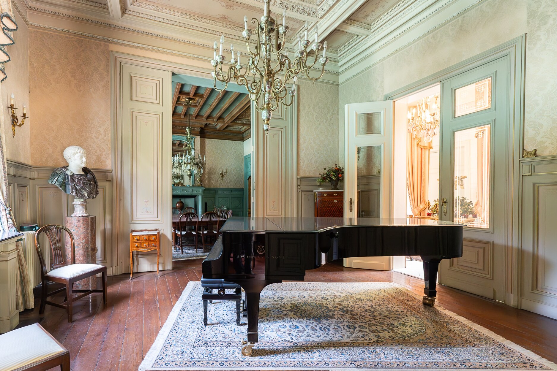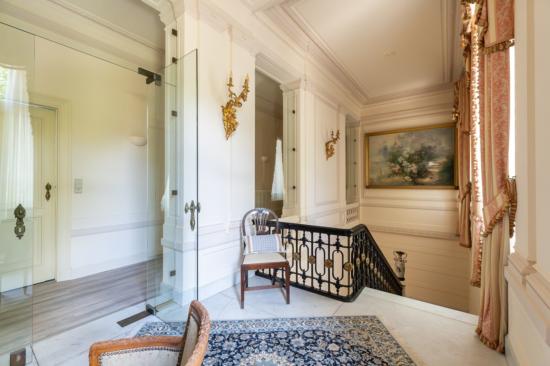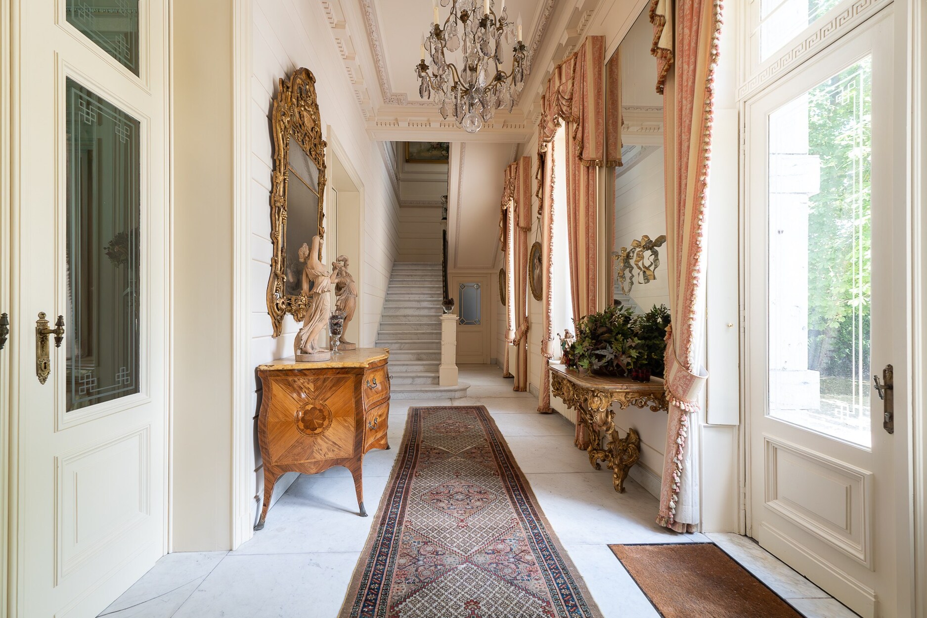 De gelijkvloerse verdieping omvat een inkomhal in marmer, ontvangstsalons, een open keuken, een dienstingang, vestiaire en diverse annexruimtes. Op de verdieping, 5 slaapkamers waaronder een suite met salon en doucheruimte, een slaapkamer met badkamer, en 3 slaapkamers die een doucheruimte delen. Het tweede niveau biedt moduleerbare ruimtes. In de kelder: kelders, wijnkelders, stookruimte en technische ruimte.