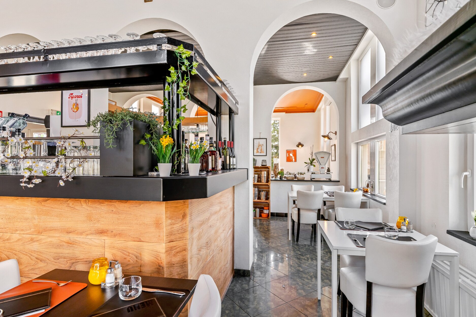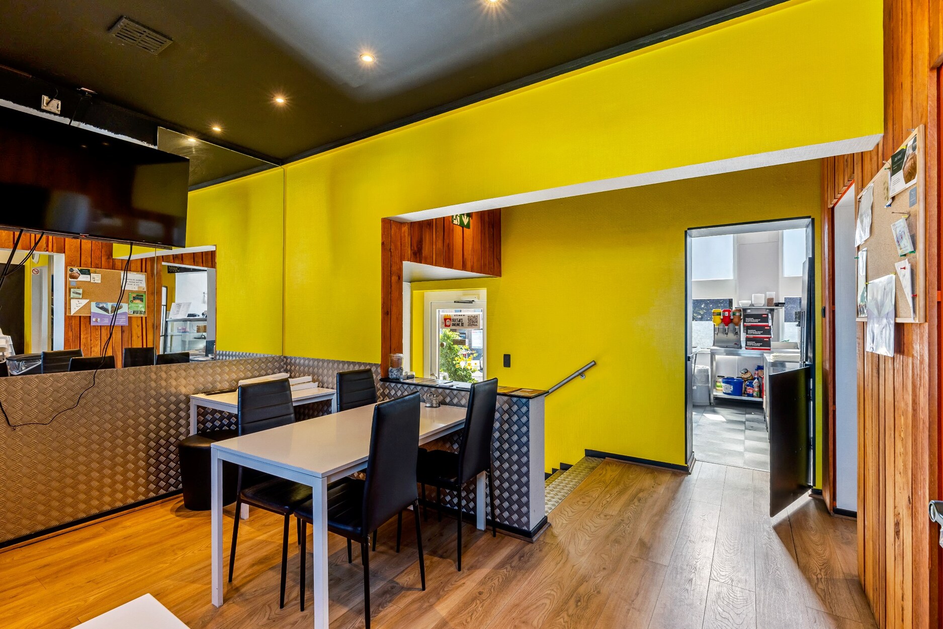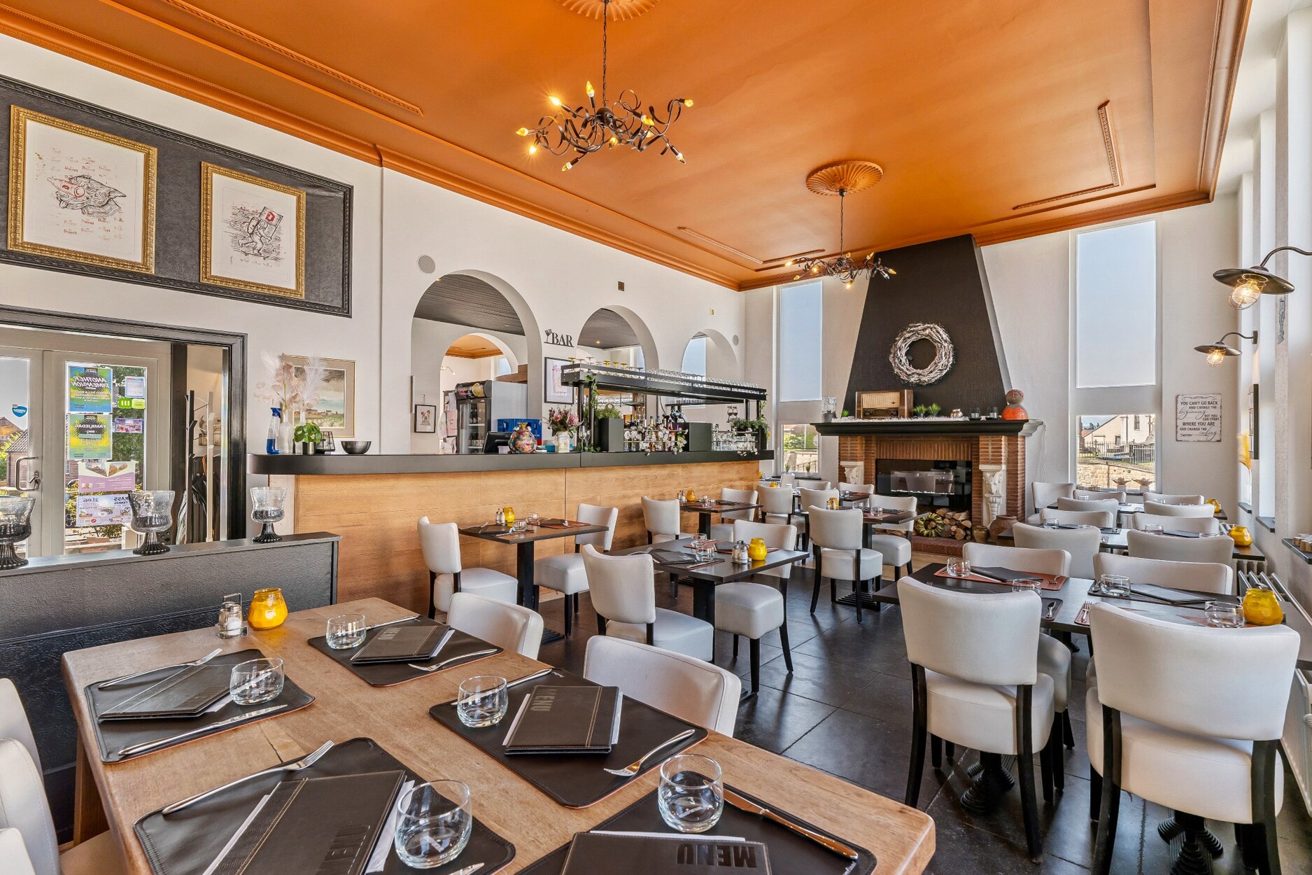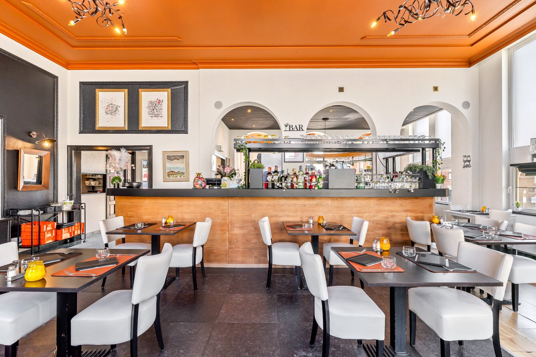 De inkom van het restaurant bereiken we via enkele trappen. Het restaurant ligt aan de linkerkant van het gebouw. De keukens en de frituur aan de rechterkant met eigen ingang en een ruim terras. De toiletten en de opslagruimten zijn bereikbaar via een trap naar de onderliggende verdieping. Achteraan is deze voorzien van een grote poort, interessant voor de aanvoer van goederen.