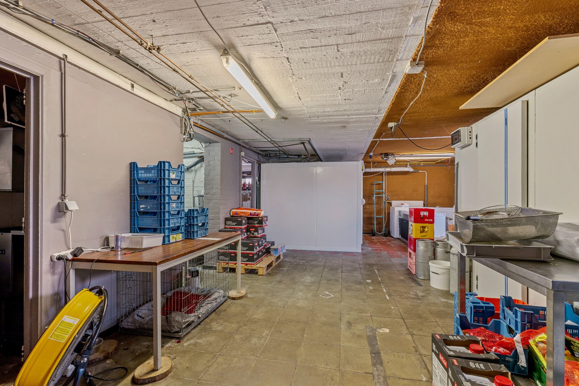 Tevens is er voor meer dan 150m² aan opslagruimte in de kelderverdieping, met een apart vrouwen- en herentoilet en een afwasruimte. De leveringen kunnen via de achterkant van het gebouw via een grote poort.