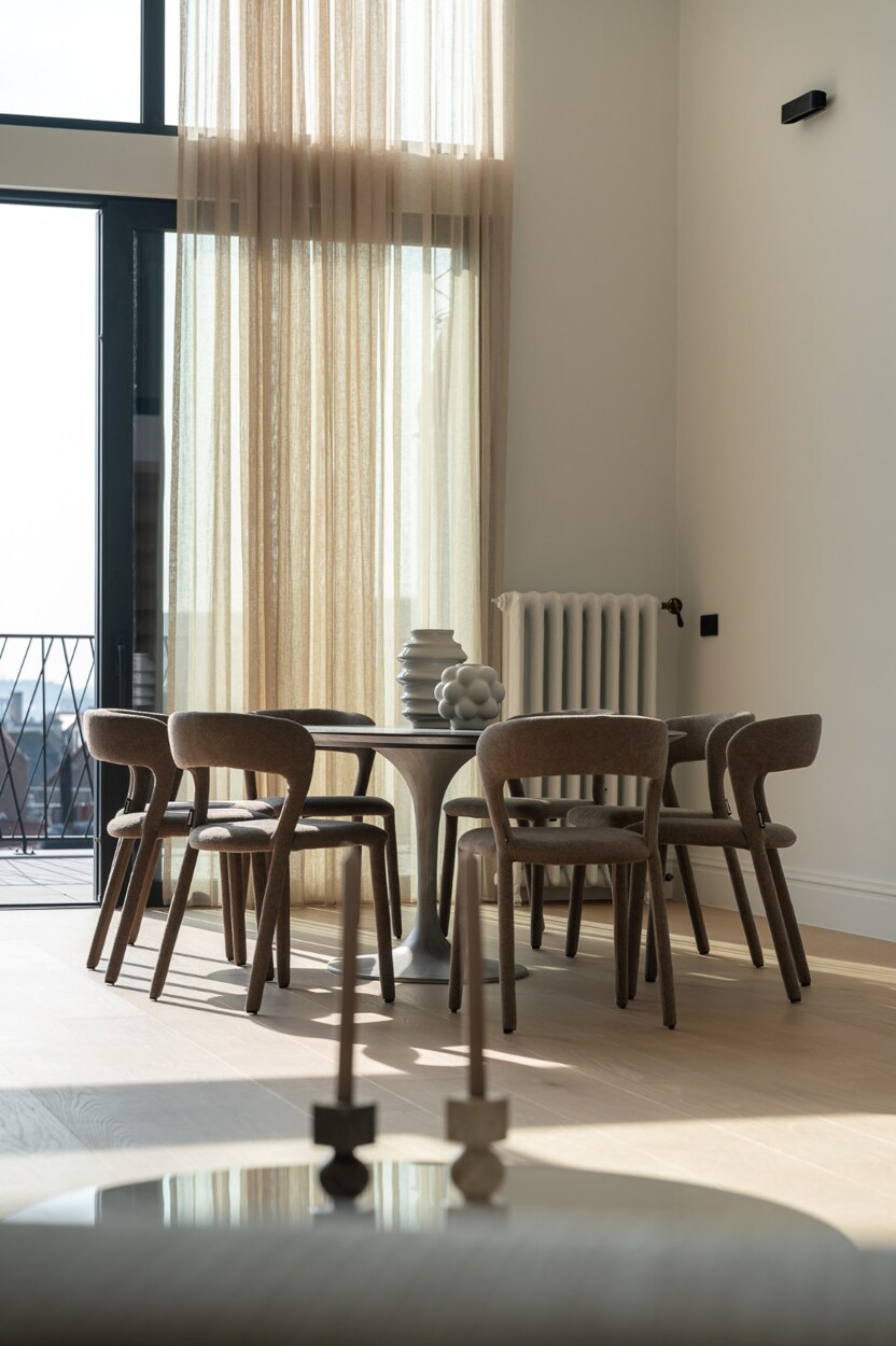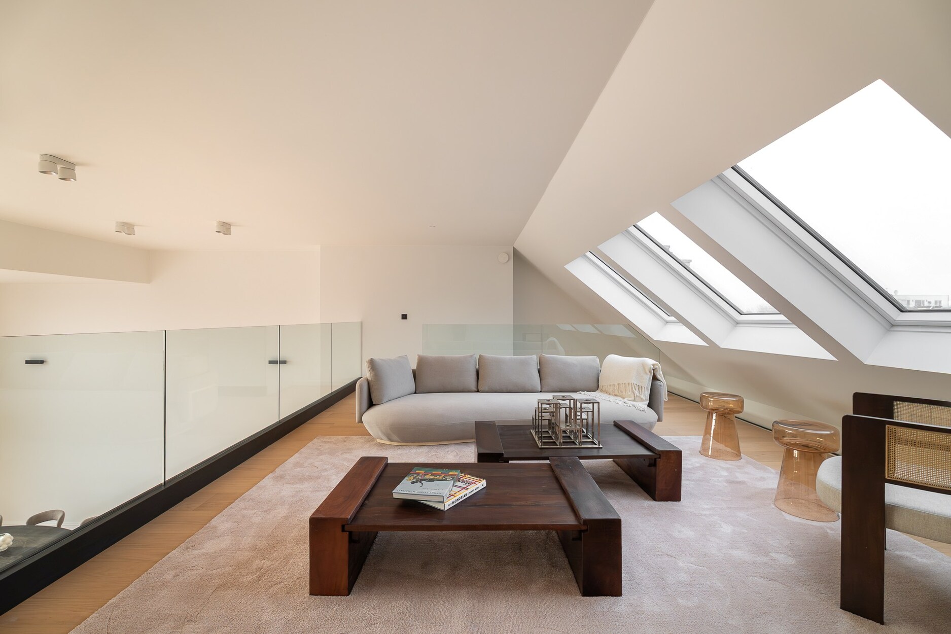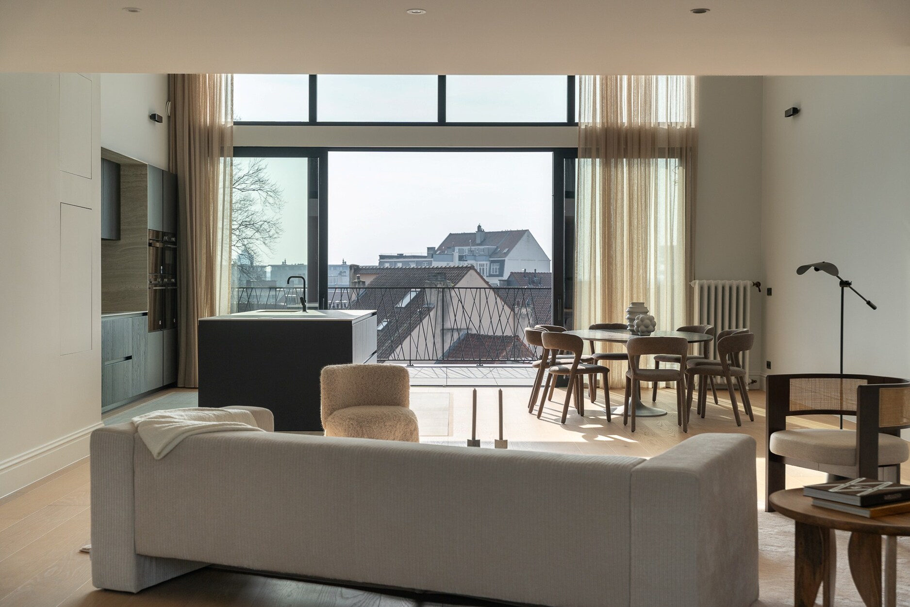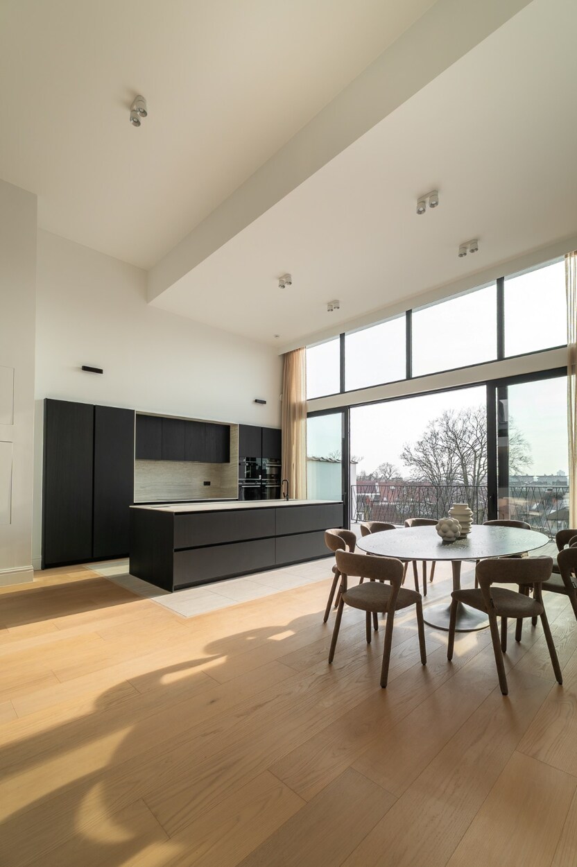 De 4de verdieping omvat de ontvangstruimtes. De doorzonindeling zorgt voor een aangename lichtinval in de leefruimte en eetkamer. De keuken sluit hier naadloos op aan en wordt gekenmerkt door een kathedraalplafond van 4,80 m hoogte en directe toegang tot het terras. Een mezzanine die uitkijkt op de leefruimte biedt plaats aan een bureau of tv-salon met airconditioning.