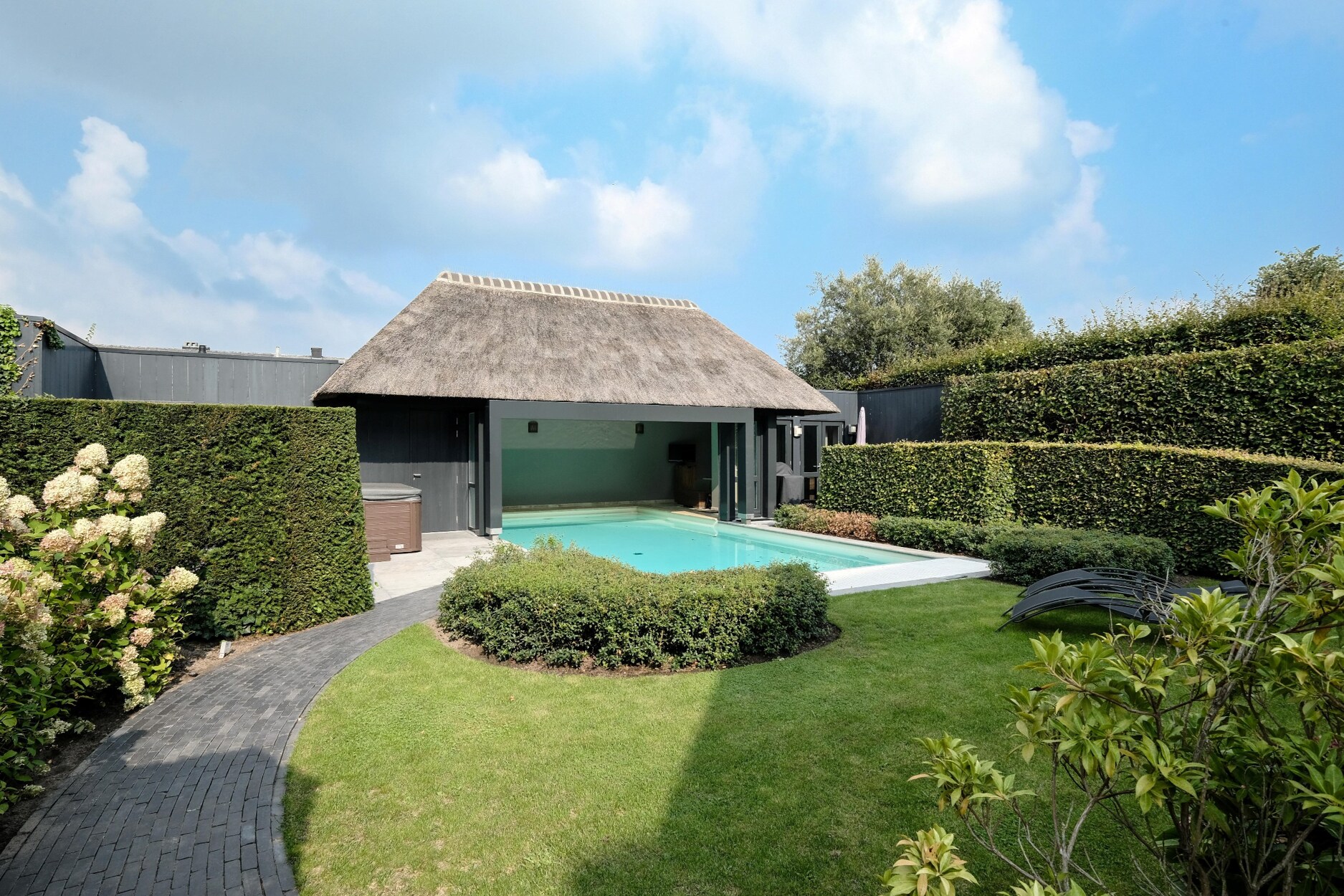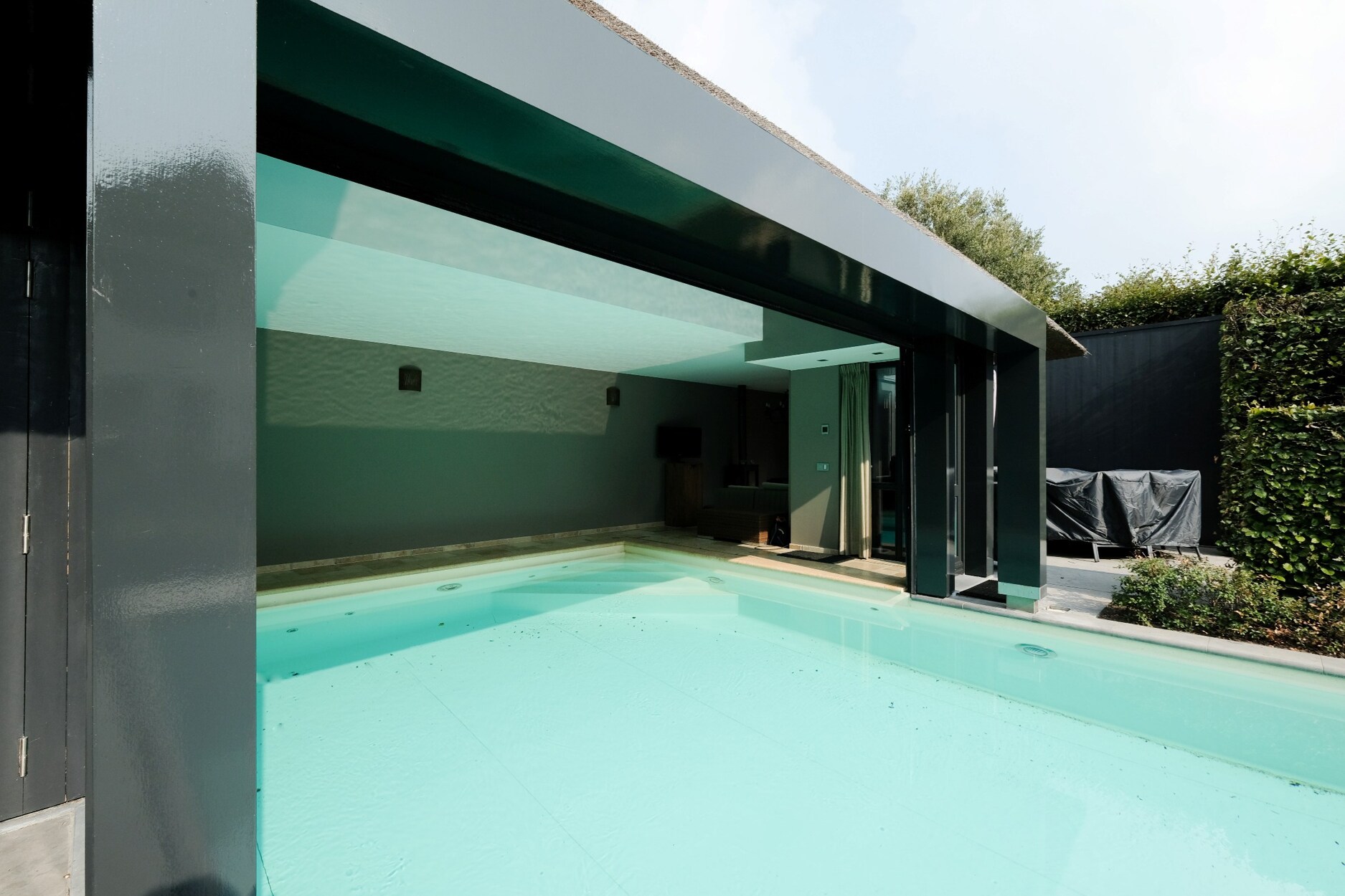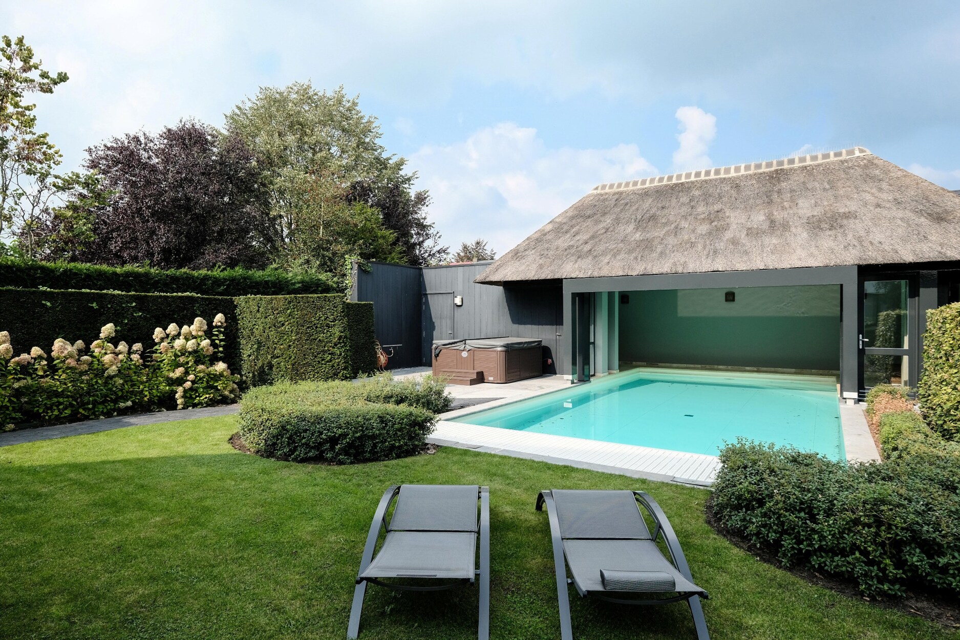 Een bijzondere troef van deze eigendom is de unieke combinatie van zwembad en poolhouse. Het poolhouse werd deels over het zwembad gebouwd, waardoor een architecturaal geheel ontstaat dat zowel esthetisch als functioneel is. Dankzij het solardek en een afsluitbare poort kan het zwembad met jet het hele jaar door gebruikt worden. Tevens sauna aanwezig en sfeervolle zithoek met haardje.
