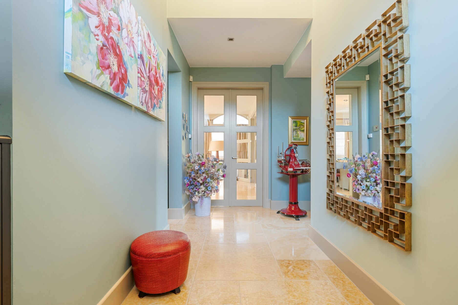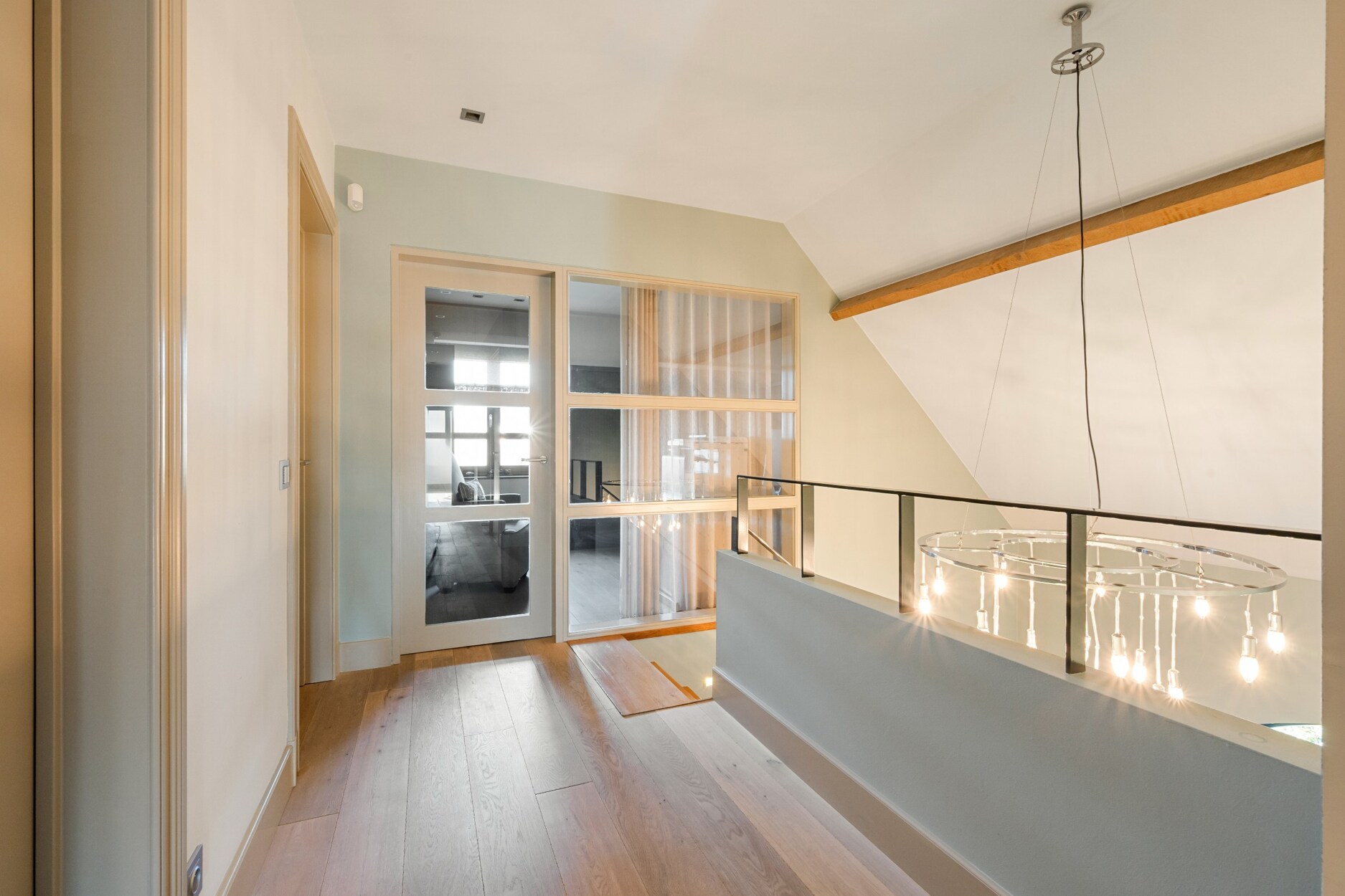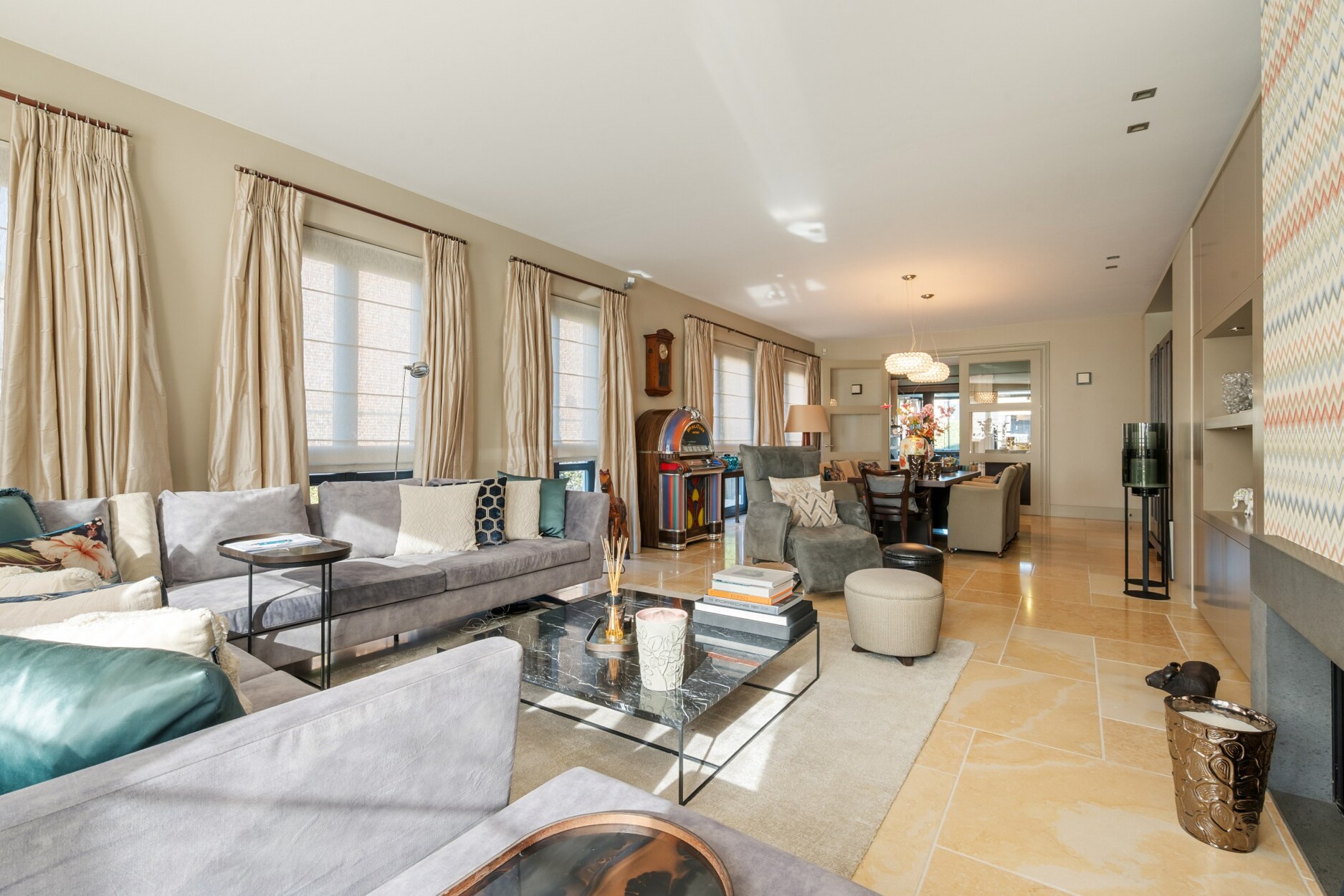 De villa verwelkomt u via een statige inkomhal met vide, waar de hoge plafonds en elegante lijnen meteen de toon zetten. De lichtrijke leefruimte met open haard vormt samen met de grote raampartijen en de natuurstenen vloer een warme en uitnodigende plek om te wonen en te genieten.