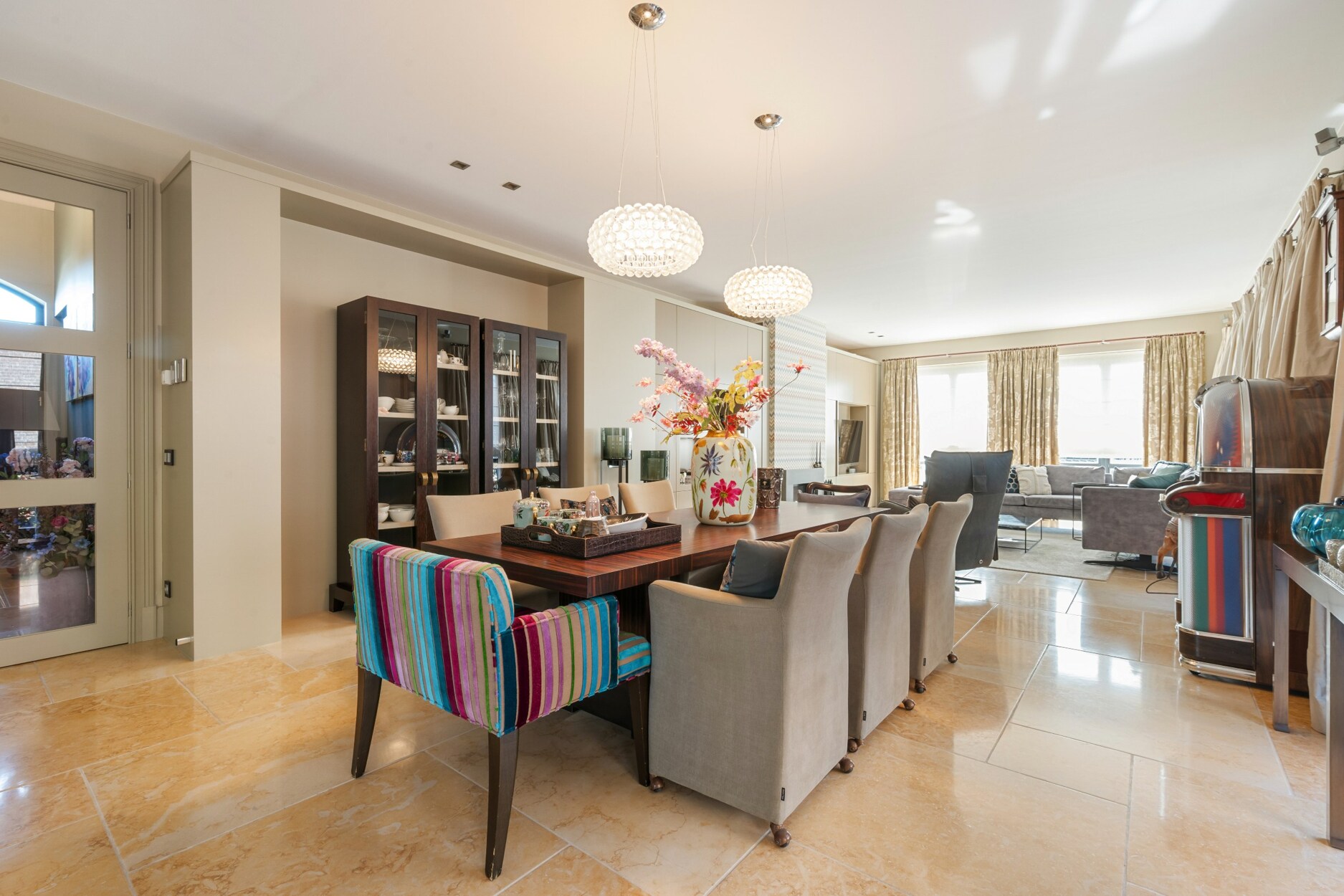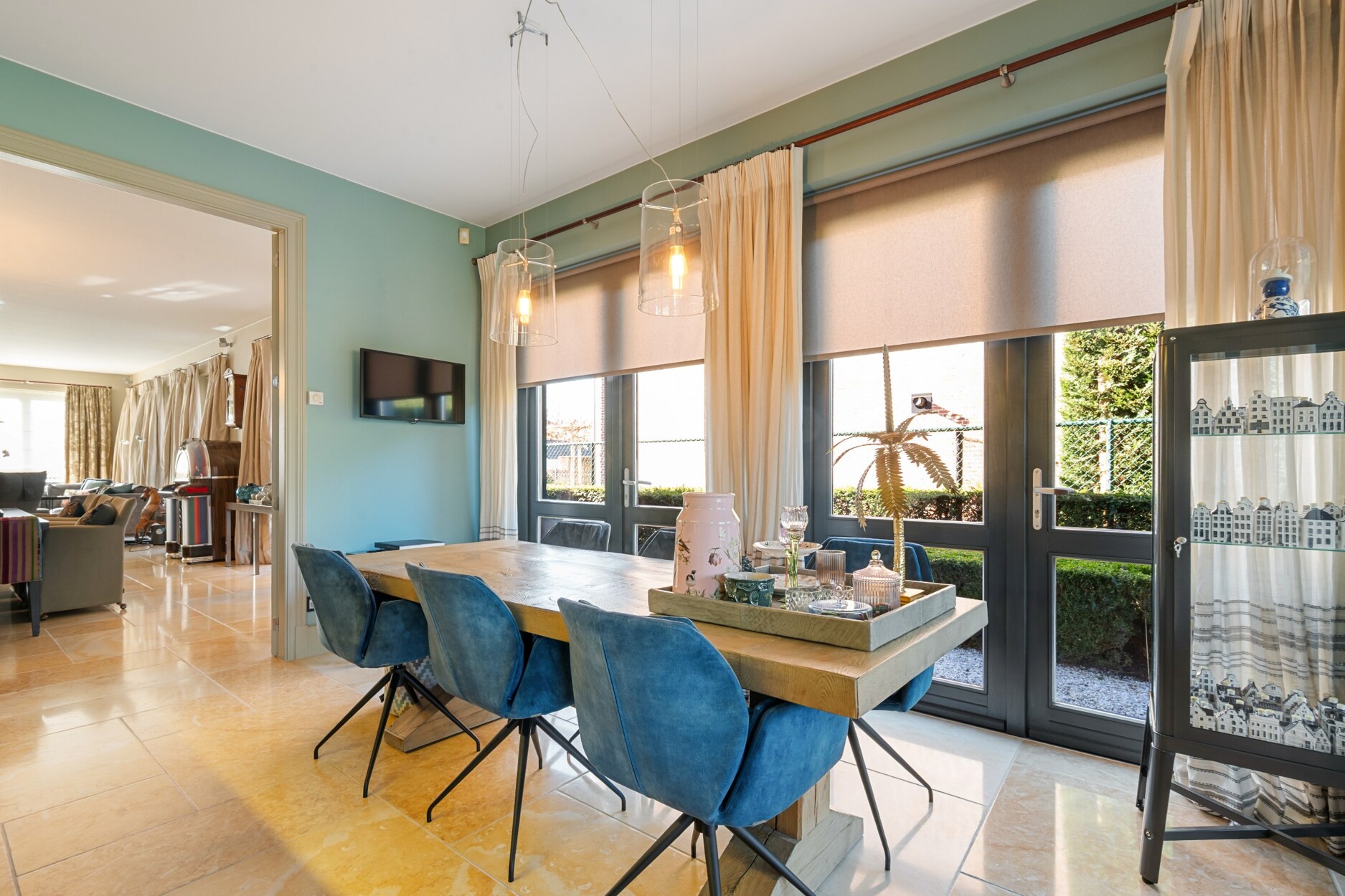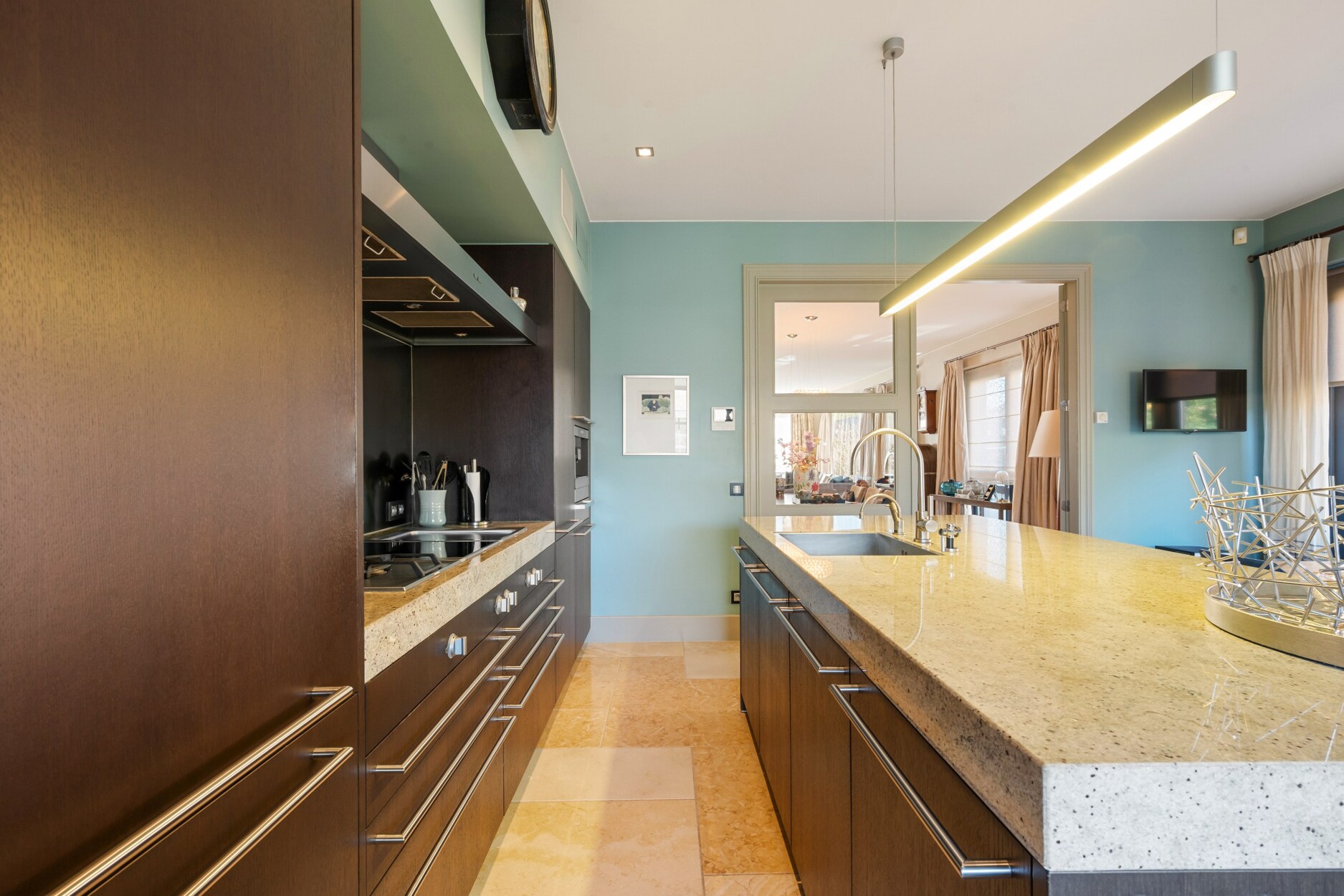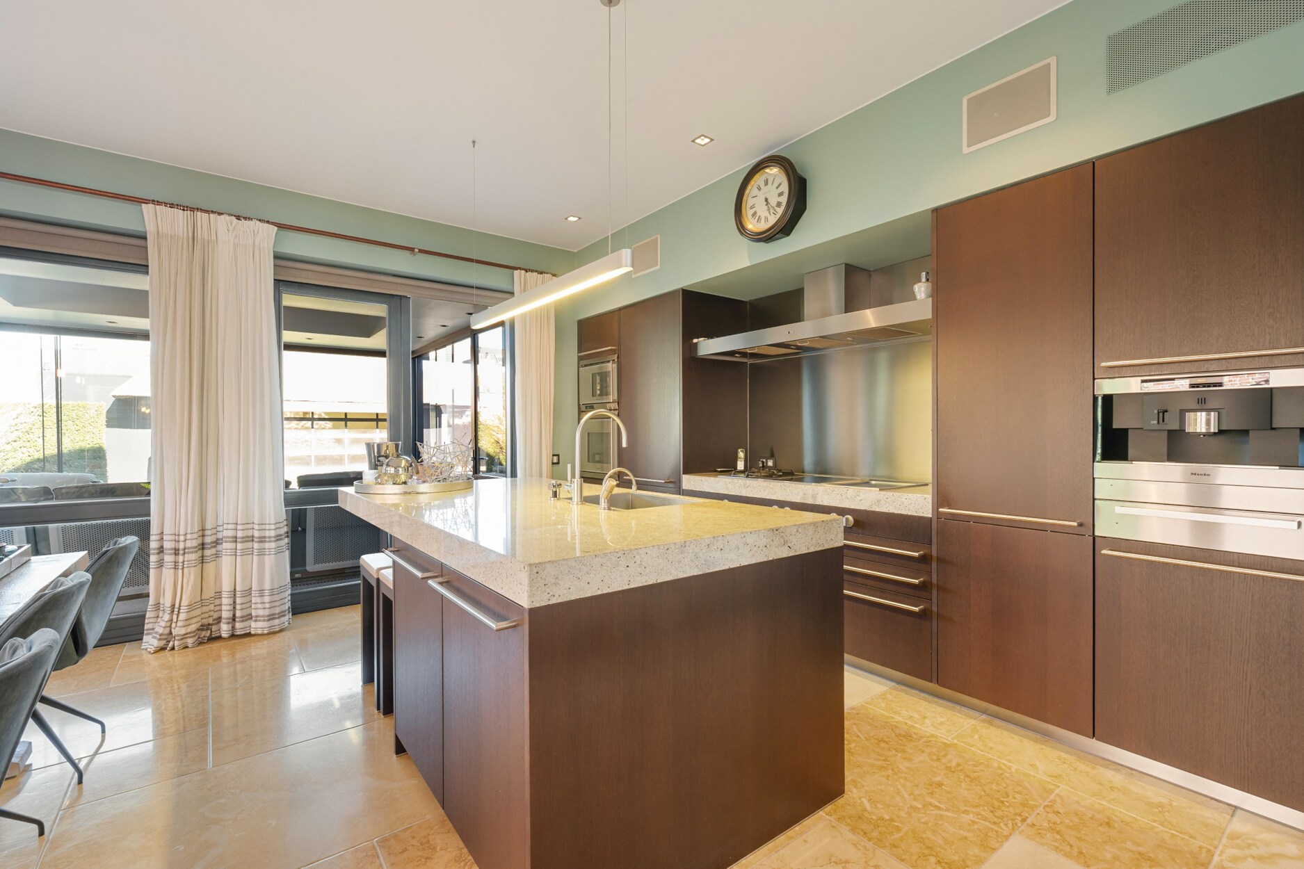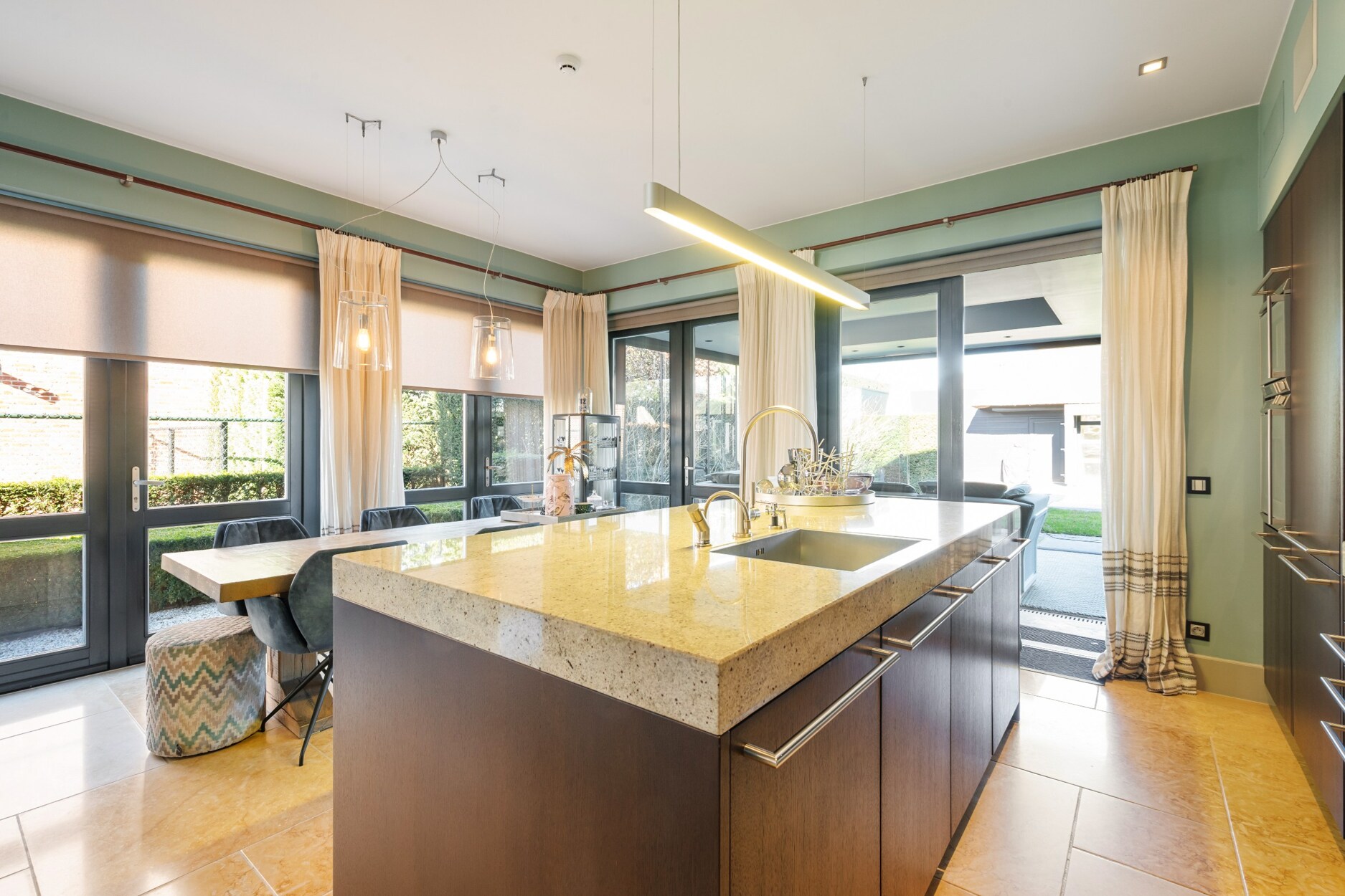 Aansluitend bevindt zich de luxueuze leefkeuken met plaats voor een grote eettafel. Deze is volledig uitgerust met hoogwaardige toestellen van het merk Gaggenau en Miele, waaronder een steamer, wokbrander, teppanyaki en ingebouwde koffiemachine, afgewerkt met een natuurstenen werkblad. Via vier dubbele openslaande deuren heeft u directe toegang tot het overdekte terras en de tuin.