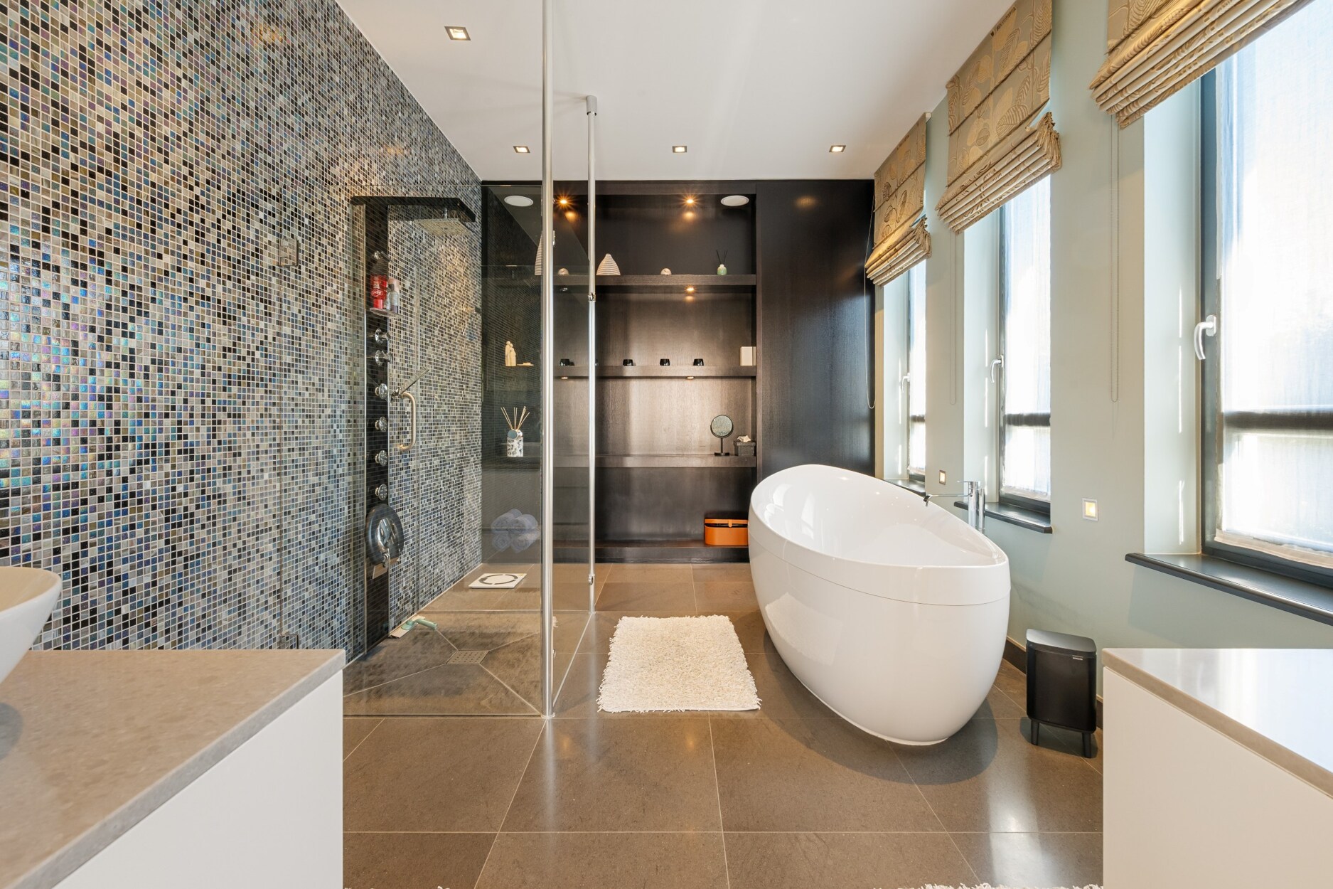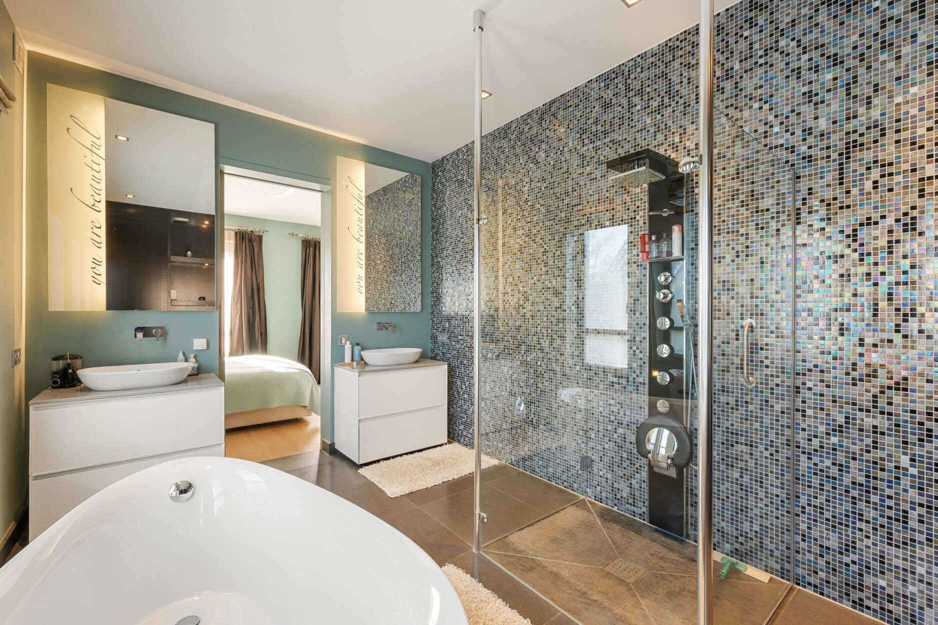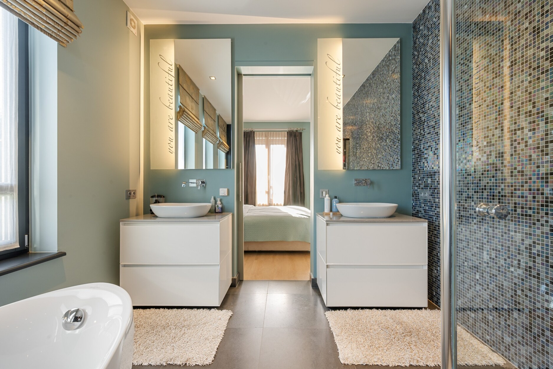 Op het gelijkvloers ligt de royale master suite op parket met dressing en stijlvolle badkamer, waardoor de woning ook uitstekend geschikt is voor levensbestendig wonen. De badkamer beschikt over een ruim ligbad, een grote inloopdouche en twee wastafels.