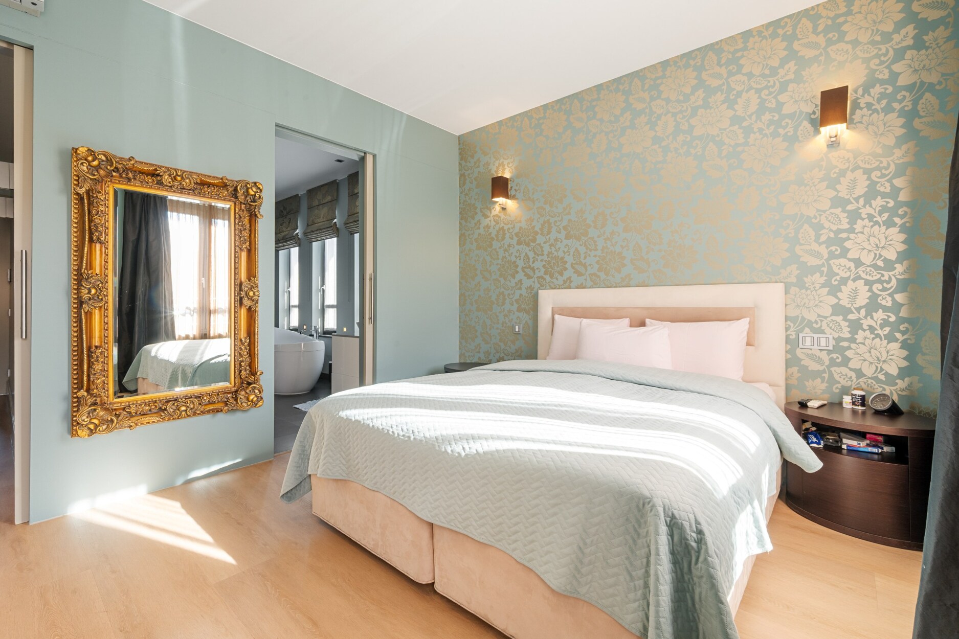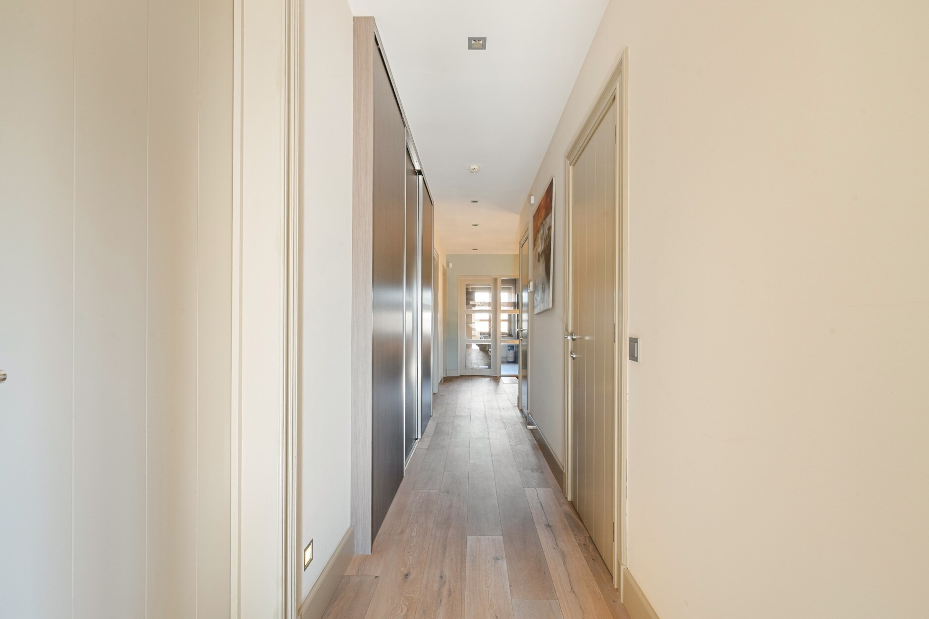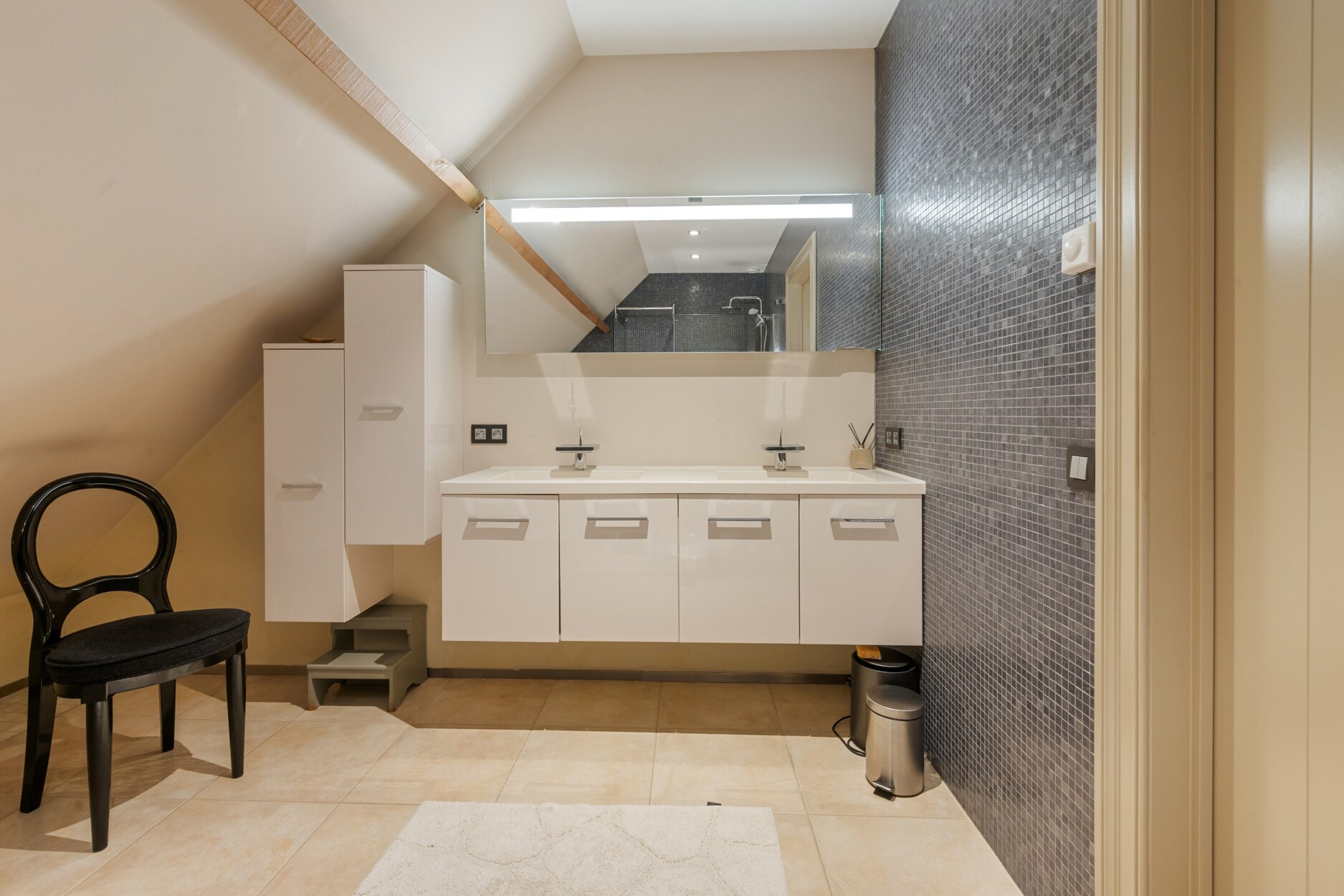 Op het gelijkvloers ligt de royale master suite op parket met dressing en stijlvolle badkamer, waardoor de woning ook uitstekend geschikt is voor levensbestendig wonen. De badkamer beschikt over een ruim ligbad, een grote inloopdouche en twee wastafels.