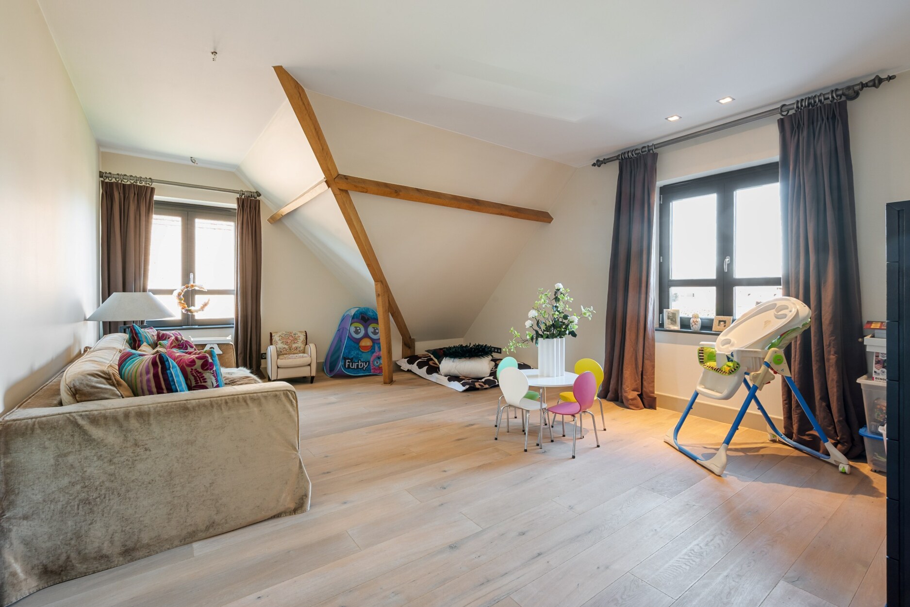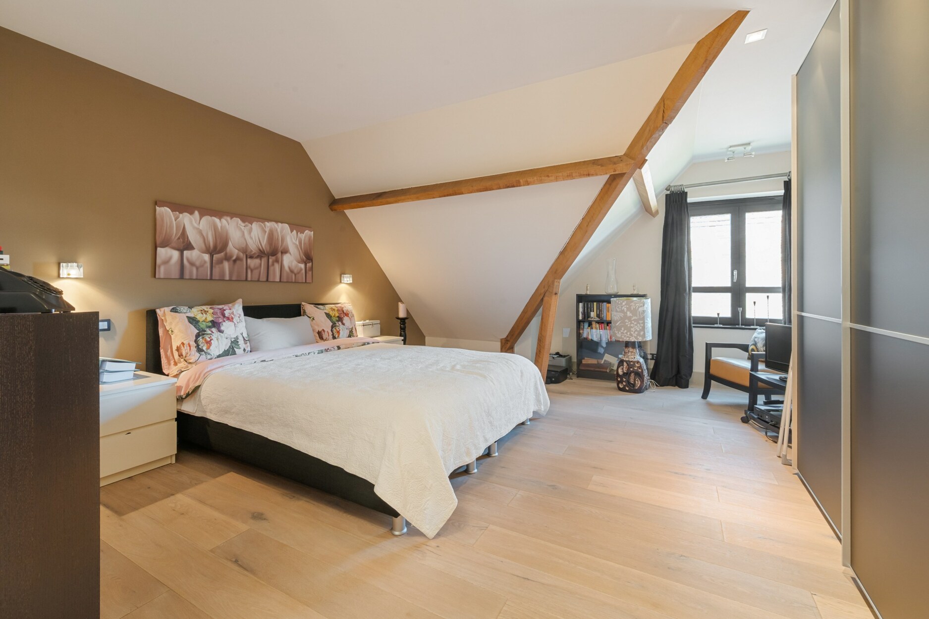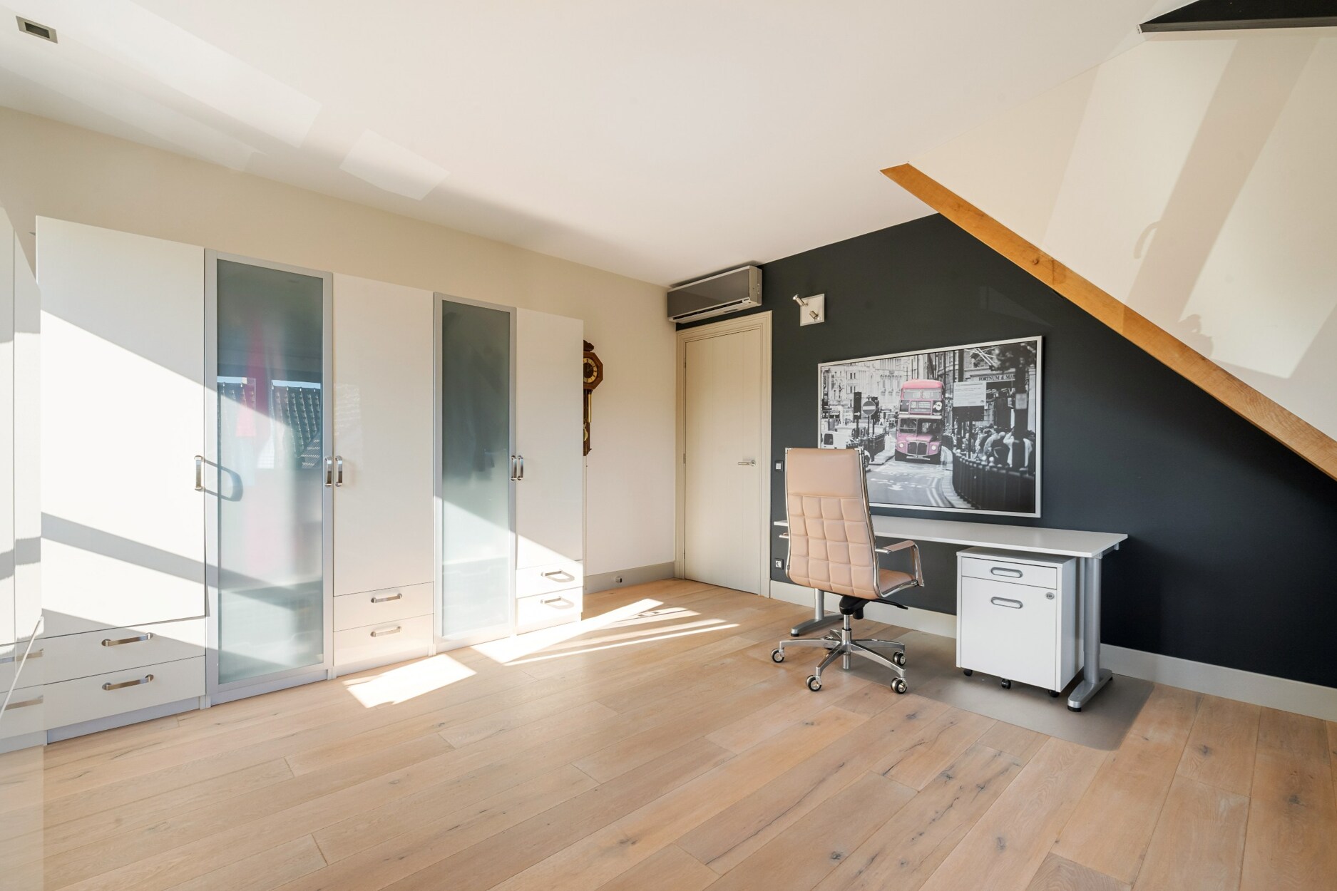 De eerste verdieping op parket biedt plaats aan vier volwaardige slaapkamers, een tweede badkamer en een apart bureel, ideaal voor thuiswerk of als rustige studeerruimte.