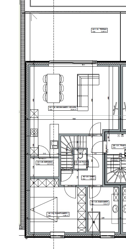 Binnenkomen doe je via de inkomdeur in de doorrit. De trap brengt je naar de eerste verdieping, waar je binnenstapt in de hal. De woonkamer ligt aan de rustige achterkant en heeft een heerlijke lichtinval. Via de grote schuifraam wandel je zo het bijzonder ruime terras op. Privacy en rust gegarandeerd!