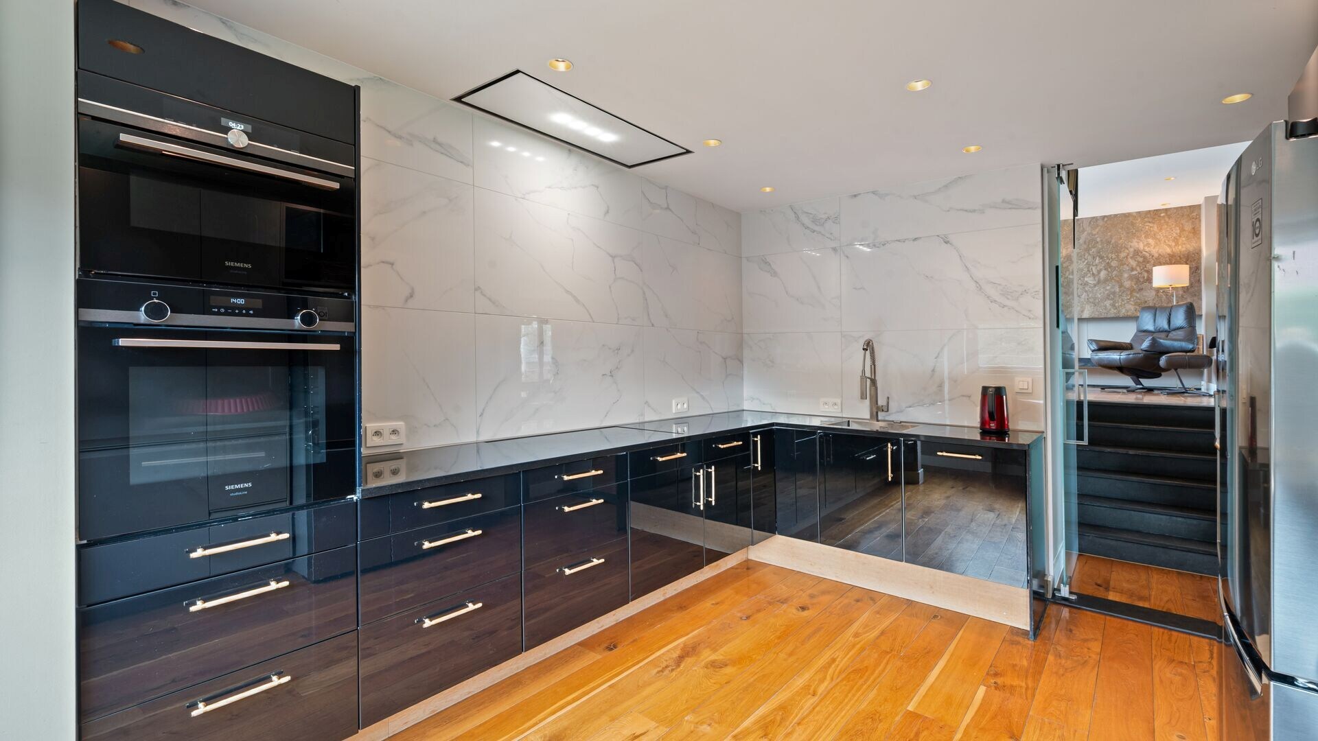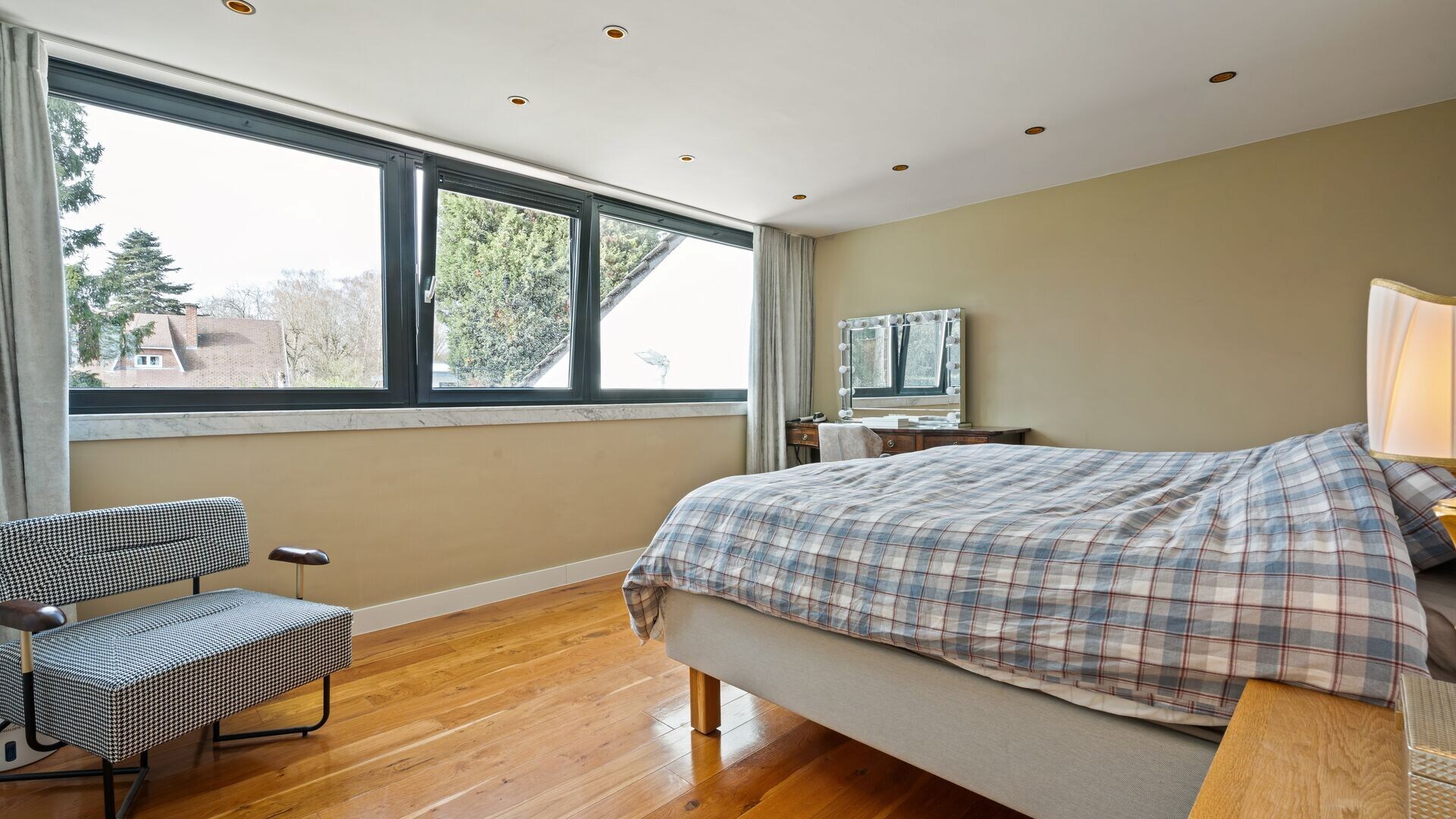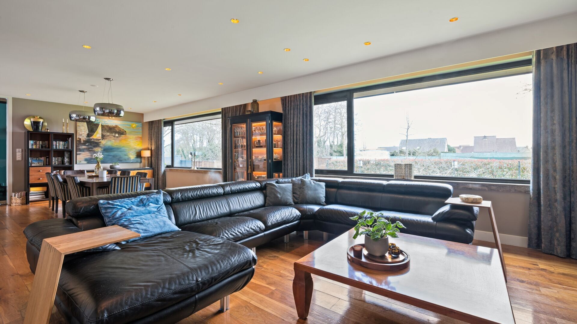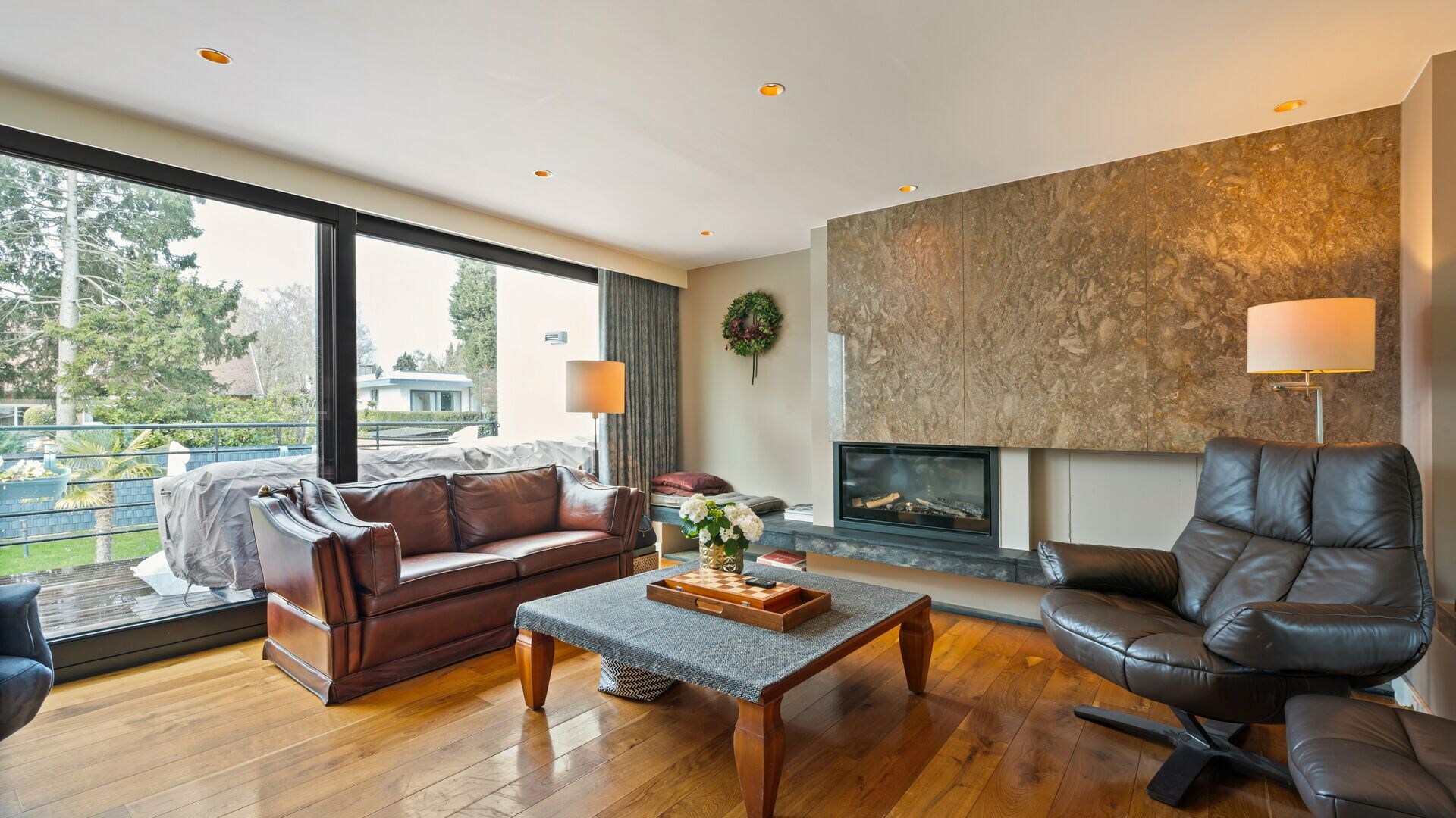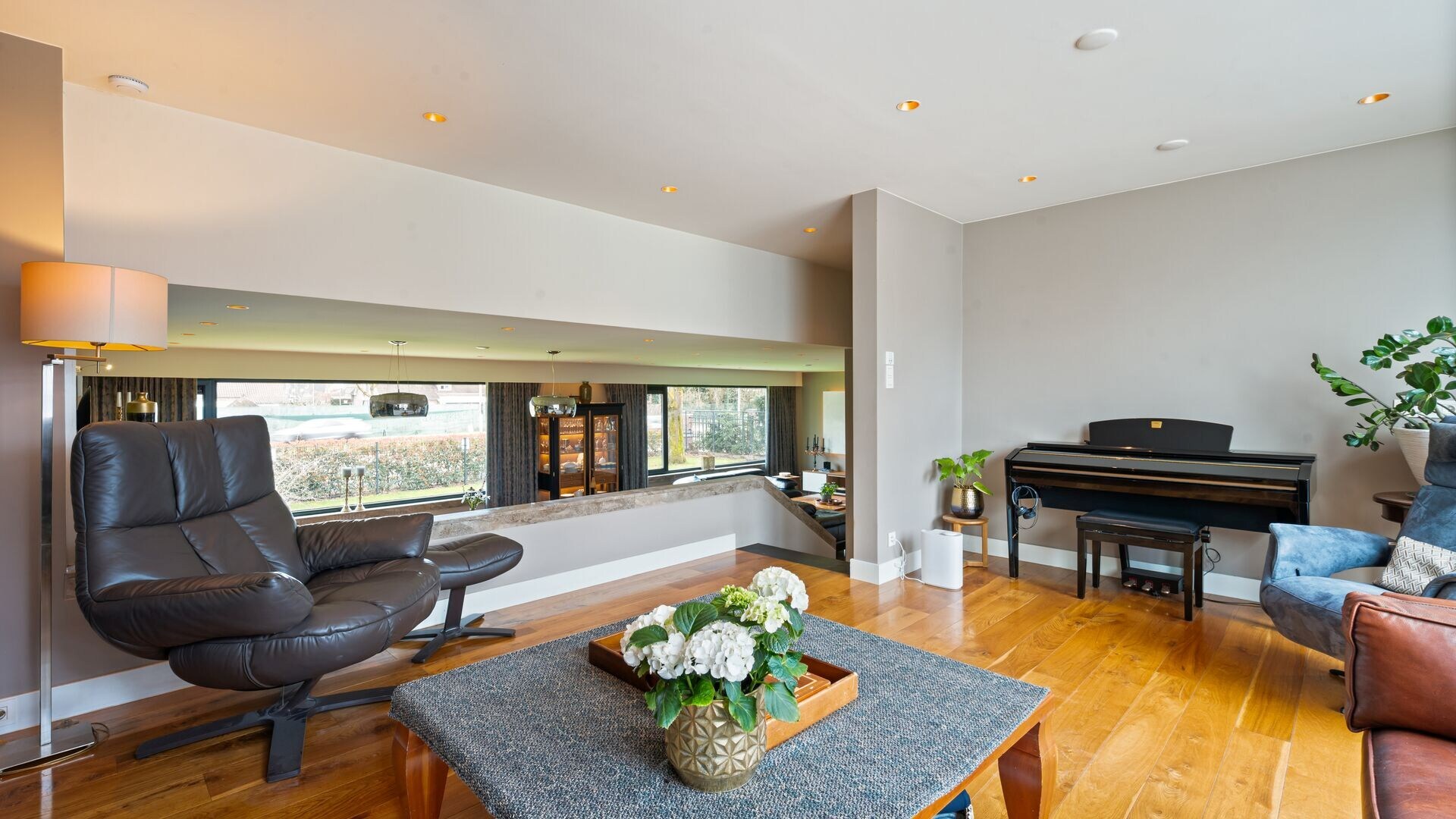 De leefruimtes baden in natuurlijk licht en staan in directe verbinding met de buitenomgeving. Grote raampartijen laten binnen en buiten naadloos in elkaar overvloeien, waarbij beleving en openheid centraal staan. De combinatie van warm eiken parket, maatwerk en subtiele designaccenten creëert een sfeer die tegelijk luxueus en uitnodigend aanvoelt.