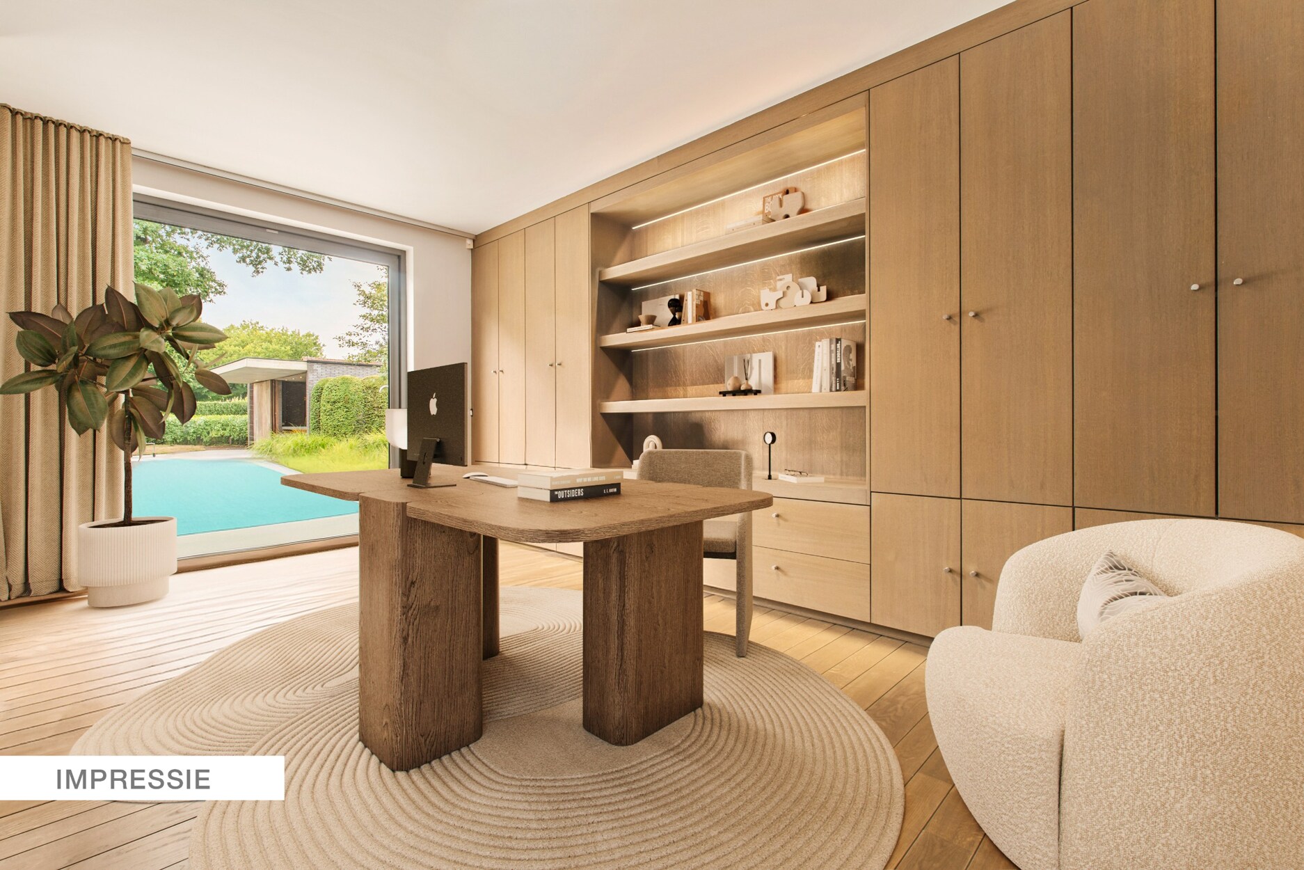De eetruimte biedt voldoende plek voor een grote eettafel en een gezellige leeshoek. Aan de andere kant van de keuken is de zitruimte met open haard en aansluitend bevindt zich een lichtrijke bureauruimte, afgewerkt met maatkasten en zicht op de tuin – ideaal voor thuiswerk in stijl.