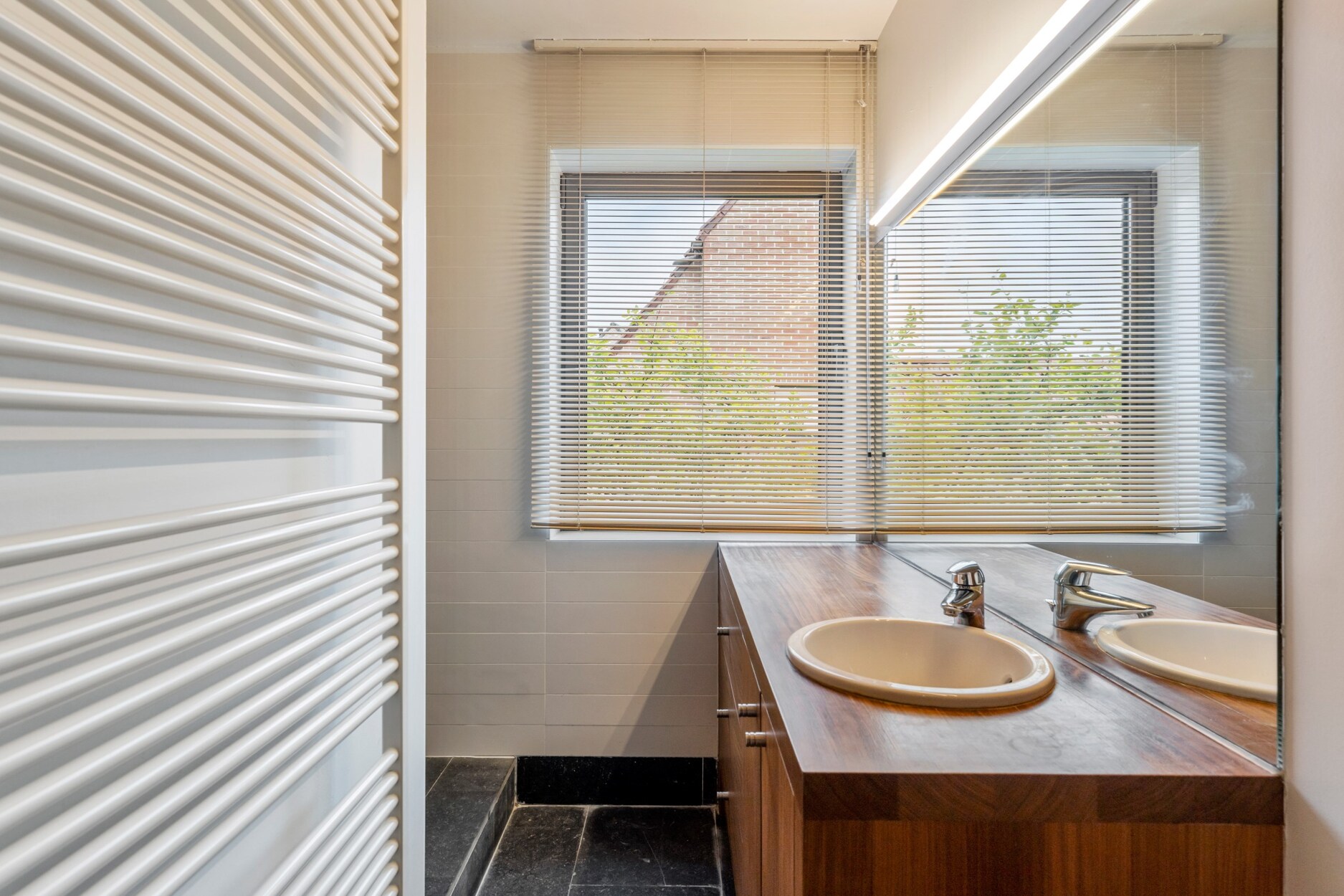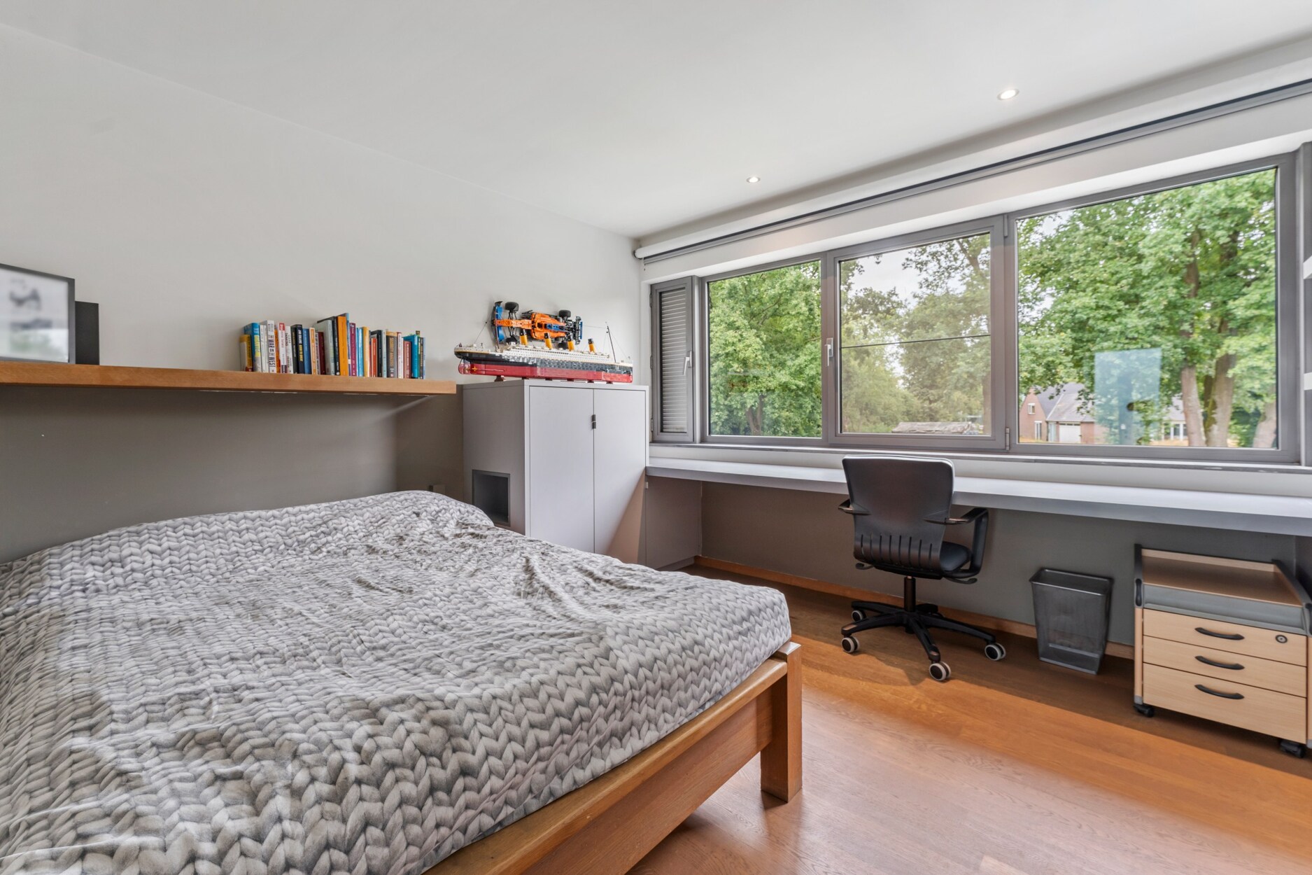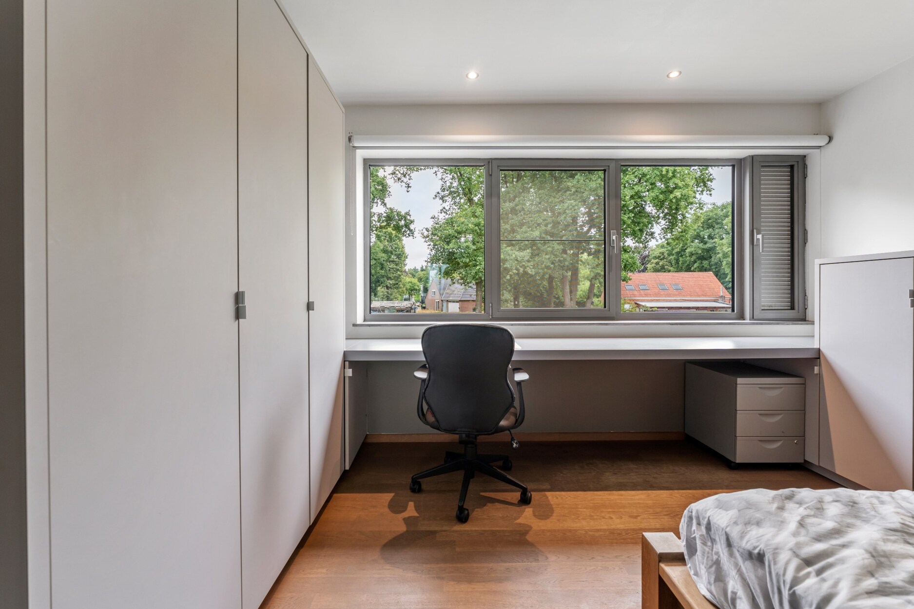 De eerste verdieping ademt dezelfde hoogwaardige afwerking als het gelijkvloers. De nachthal verbindt vier slaapkamers. De master bedroom beschikt over een eigen dressing en een luxueuze ensuite badkamer met bad, inloopdouche en wastafel, en biedt een prachtig uitzicht op de tuin. De drie kinderkamers zijn stuk voor stuk voorzien van ingebouwde kasten en ingebouwde bureaus. Verder vind je hier een tweede douchekamer, een aparte wasplaats en een afzonderlijk toilet.