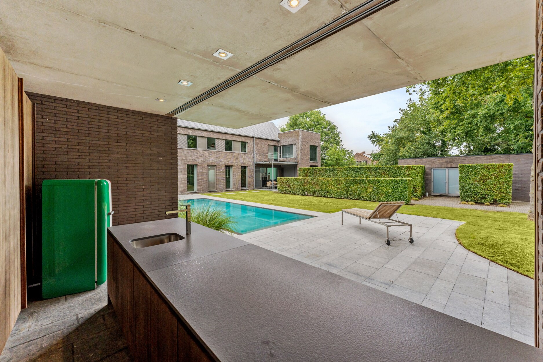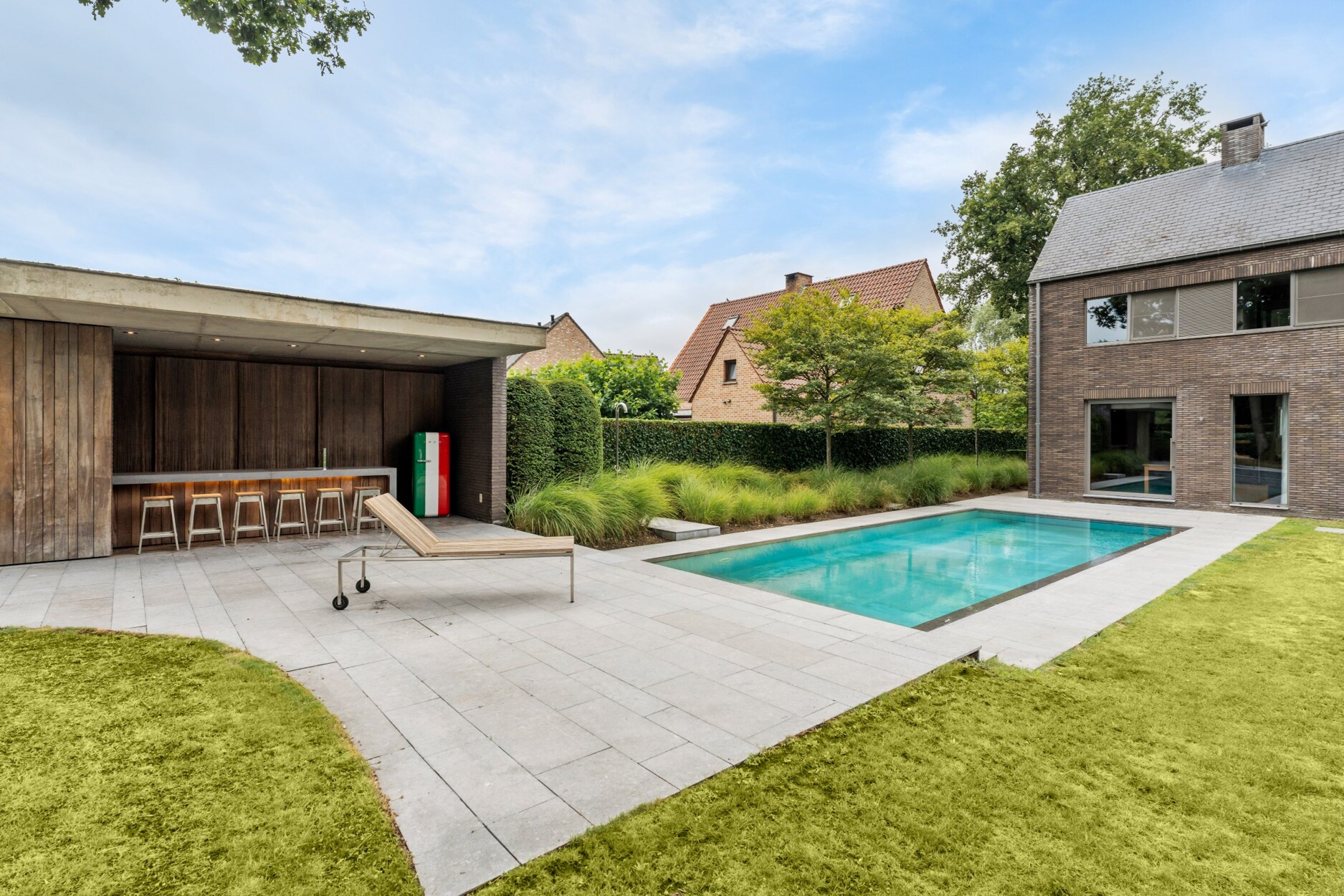 De zuidoost gerichte tuin heeft meerdere terrassen en een verwarmd overloopzwembad met waar je op zonnige dagen heerlijk kunt genieten. Aan het zwembad een poolhouse met toilet, kleedruimte, ingebouwde toog en een buitendouche.