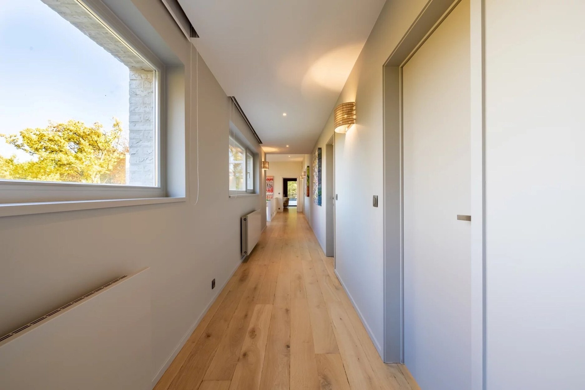 De begane grond is opgezet rond een ruime inkomhal met vestiaire en gastentoilet, een dubbele woonkamer, een eetkamer, een tv-kamer, een kantoor, een ingerichte keuken met ontbijtruimte, een bijkeuken en een tweede toilet. Op de bovenverdieping omvat de ouderlijke suite een dubbele slaapruimte, een privé zitkamer, een dressing en een dubbele badkamer met toilet. Vier extra slaapkamers met eigen badkamer completeren deze verdieping, elk met een doucheruimte en toilet.