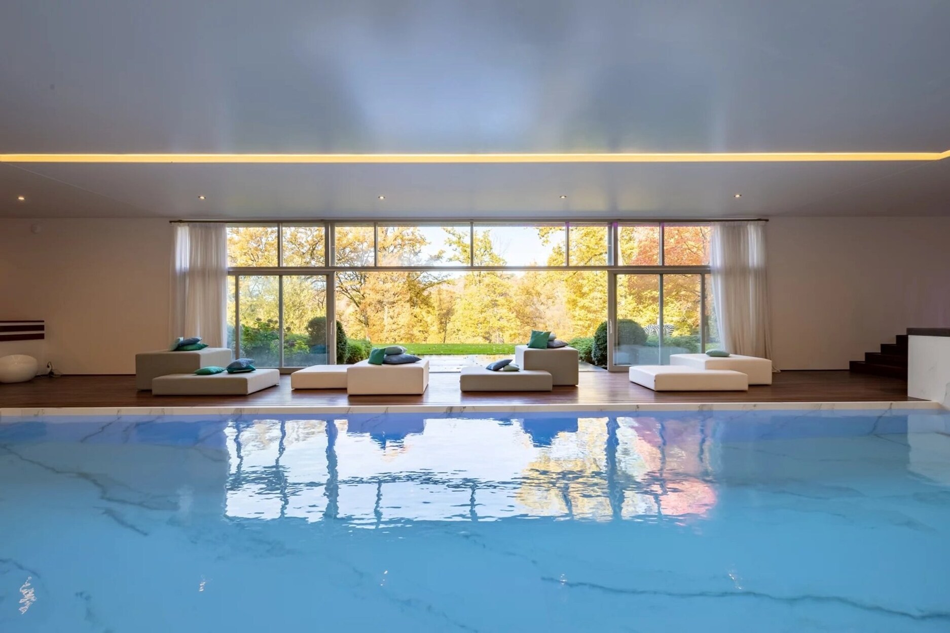Het lagere niveau herbergt een complete ontspanningsruimte: binnenzwembad, jacuzzi, bargedeelte, fitnessruimte, kleedkamers met douches en toiletten, wasruimte, diverse kelders en technische ruimtes. Een apart conciërgewoning, een garage voor ± 7 voertuigen en meerdere goed georiënteerde terrassen maken het geheel compleet.