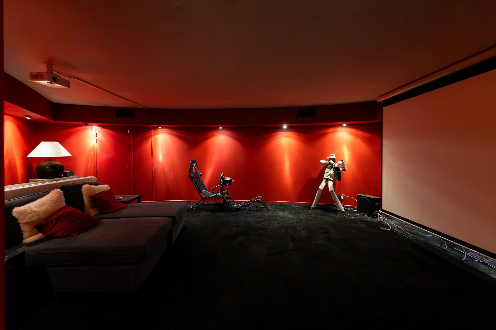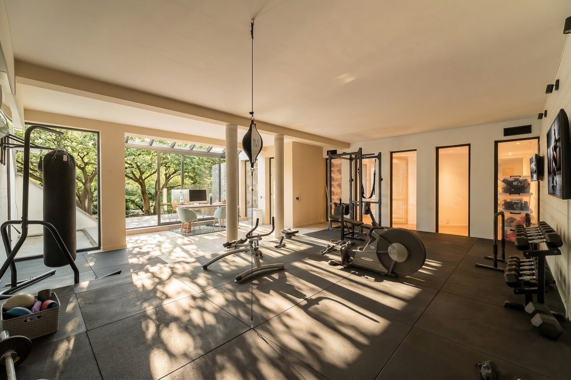 De kelderverdieping, volledig ingericht voor ontspanning en welzijn, omvat een fitnessruimte en een home cinema.