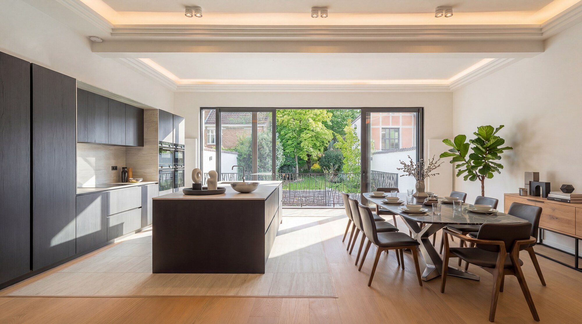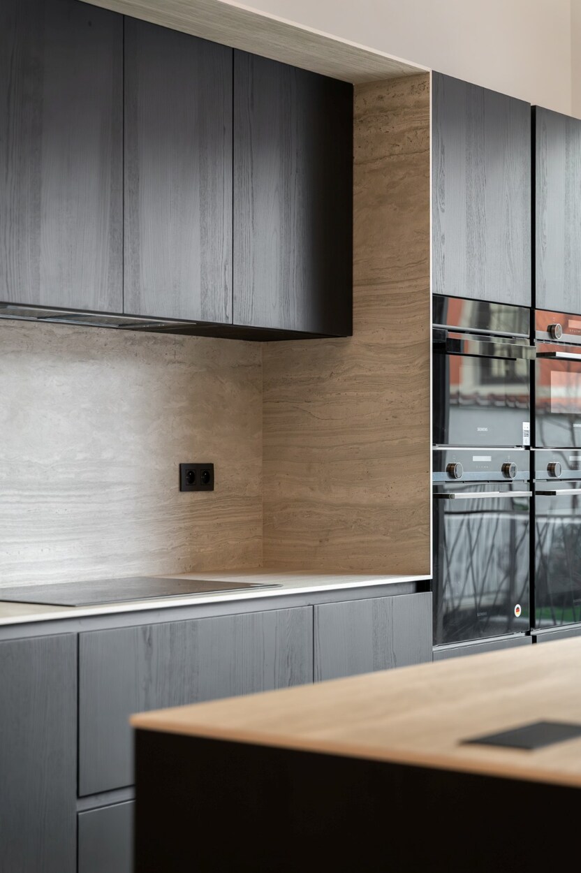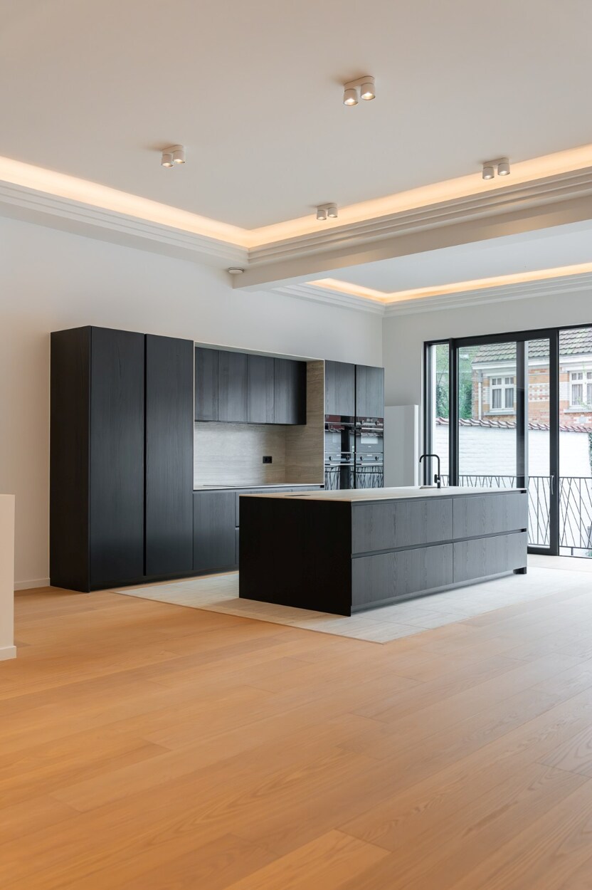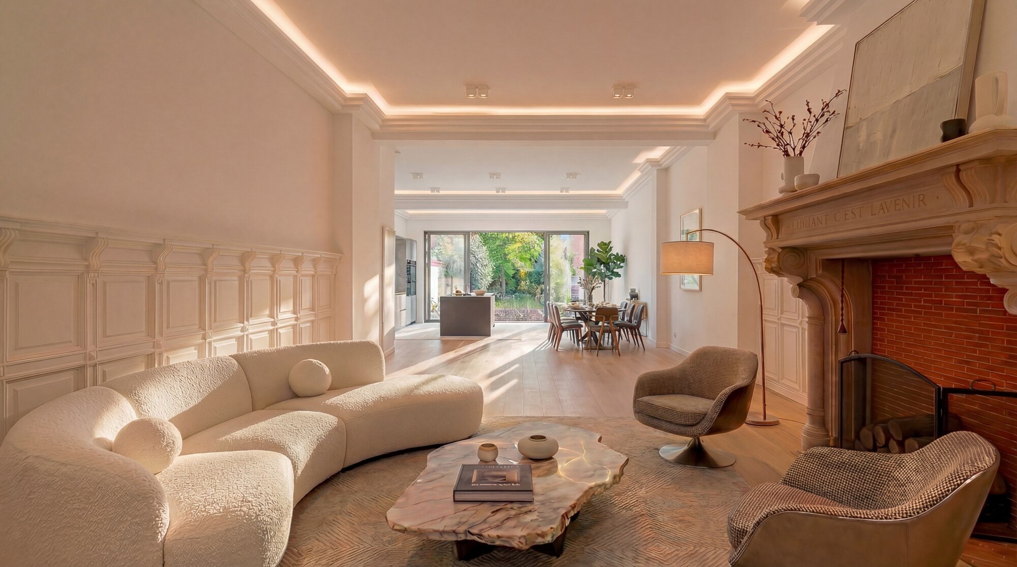 De woonkamer behoudt een monumentale open haard in gebeeldhouwde steen, een centraal element binnen de ruimte. De volledig uitgeruste Siemens-keuken, met donker houten kasten, een werkblad en spatwand in steen, en een centraal eiland met geïntegreerde spoelbak en zwarte kranen, staat in verbinding met de eetkamer en geeft via grote raampartijen rechtstreeks toegang tot de zuidwestgerichte tuin.