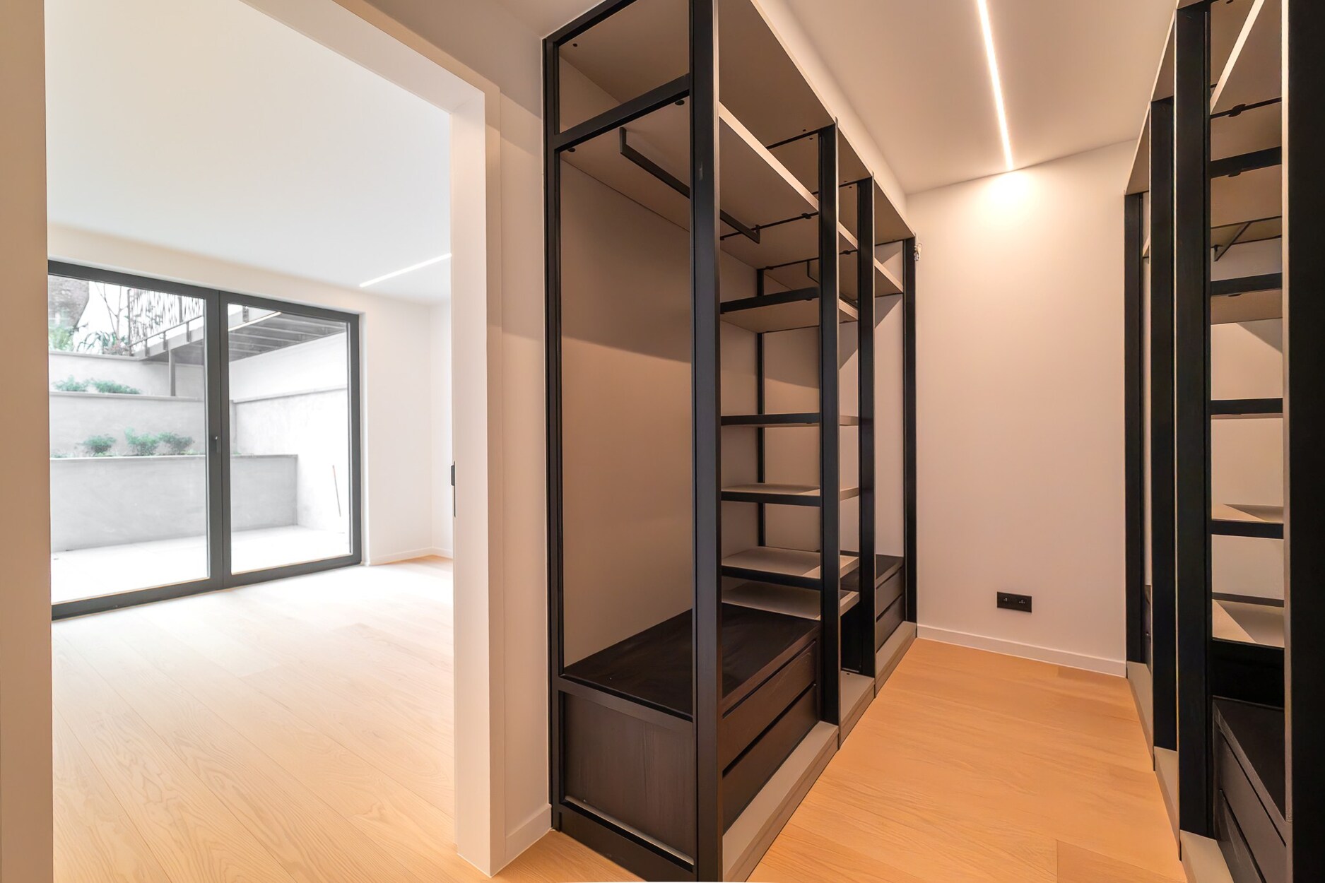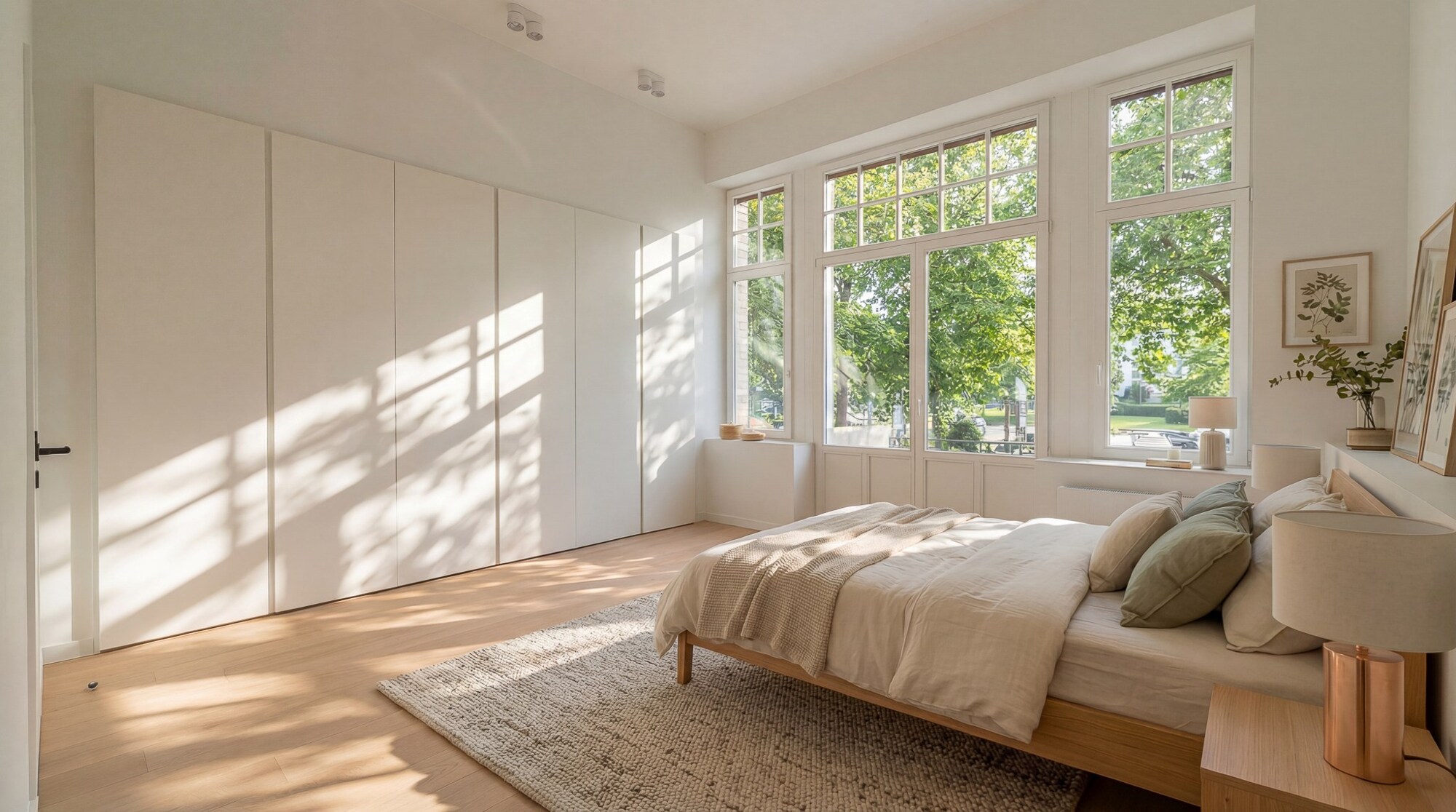 De inkomhal is ruim en leidt enerzijds naar een eerste slaapkamer met en-suite badkamer, en anderzijds naar de royale leefruimtes. De plafondhoogte van 3,70 m versterkt het gevoel van ruimte, in combinatie met sierlijke plafondlijsten en eiken parketvloeren die doorlopen in alle vertrekken.