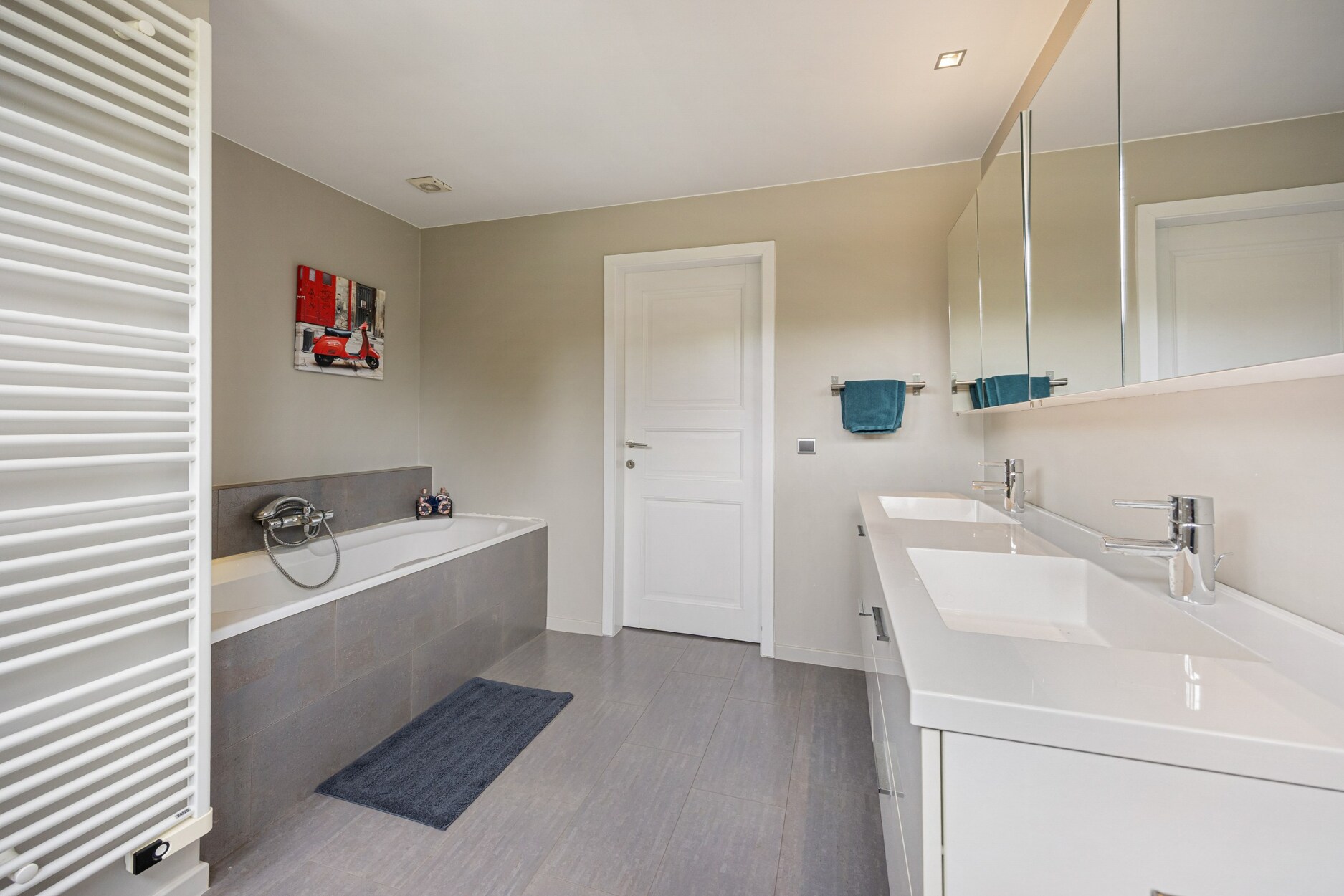 - Ensuite badkamer met ligbad, douche en dubbele lavabo in stijlvol badkamermeubel
